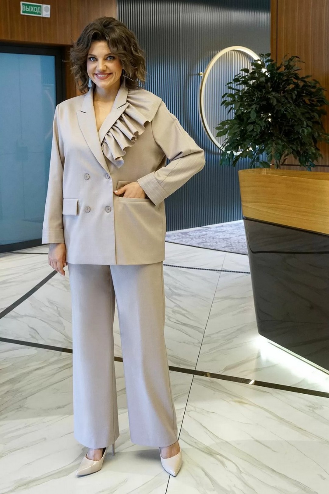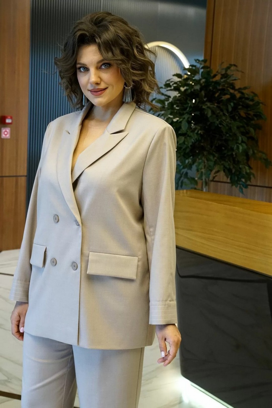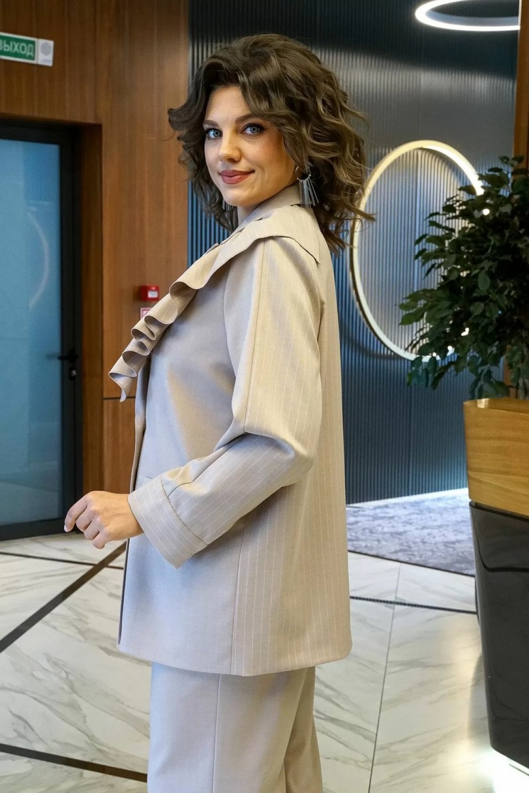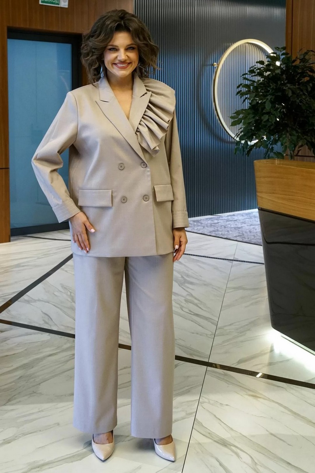 "Жакет прямого, свободного силуэта, с двух-бортной застёжкой на петли и пуговицы и с внутренней застёжкой на петлю и пуговицу, перед и спинка на подкладке, по левой стороне декорирован съёмной оборкой пристёгивающаяся под лацканом на пришивные кнопки. Перед с прорезными карманами с листочкой и клапаном. Рукава втачные, двушовные, длинные, понизу с разрезом в локтевом шве и притачными манжетами застёгивающиеся на навесную петлю и пуговицу. Воротник пиджачного типа.
