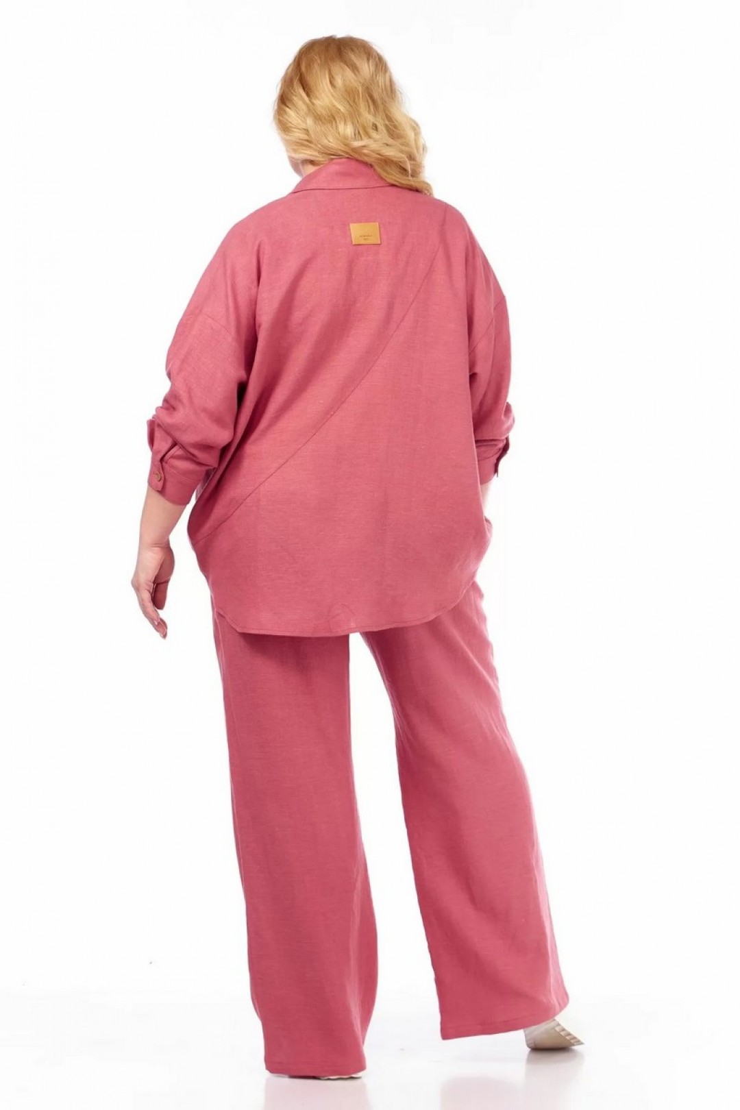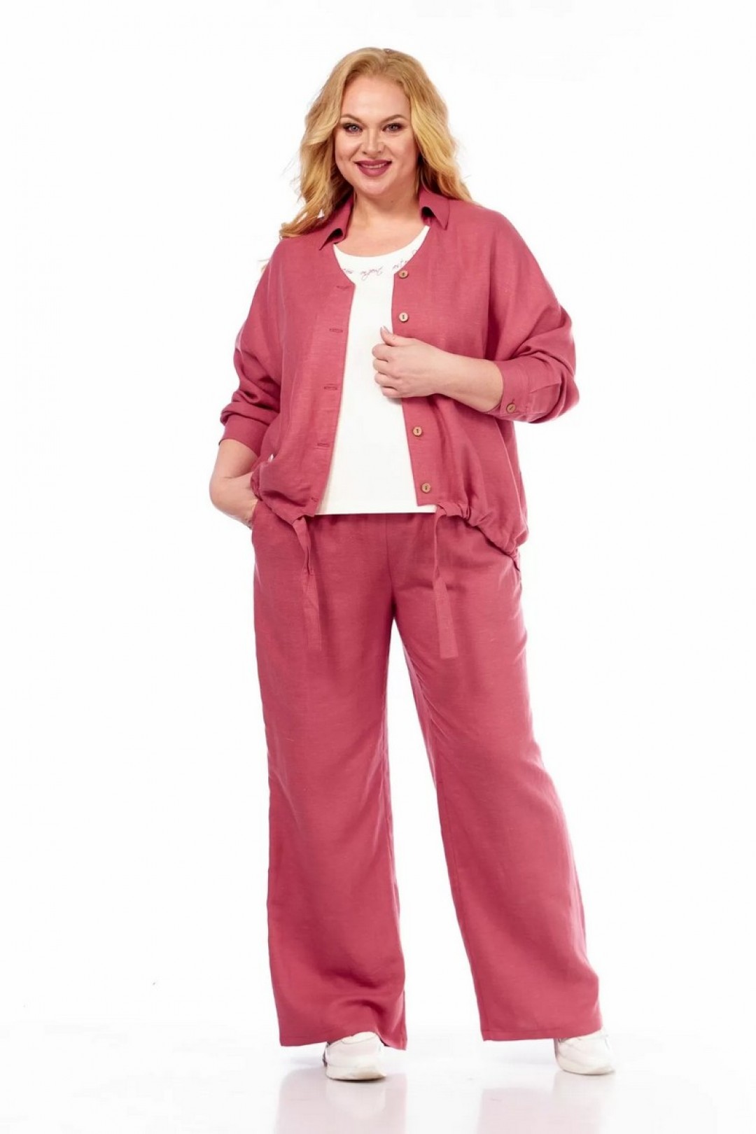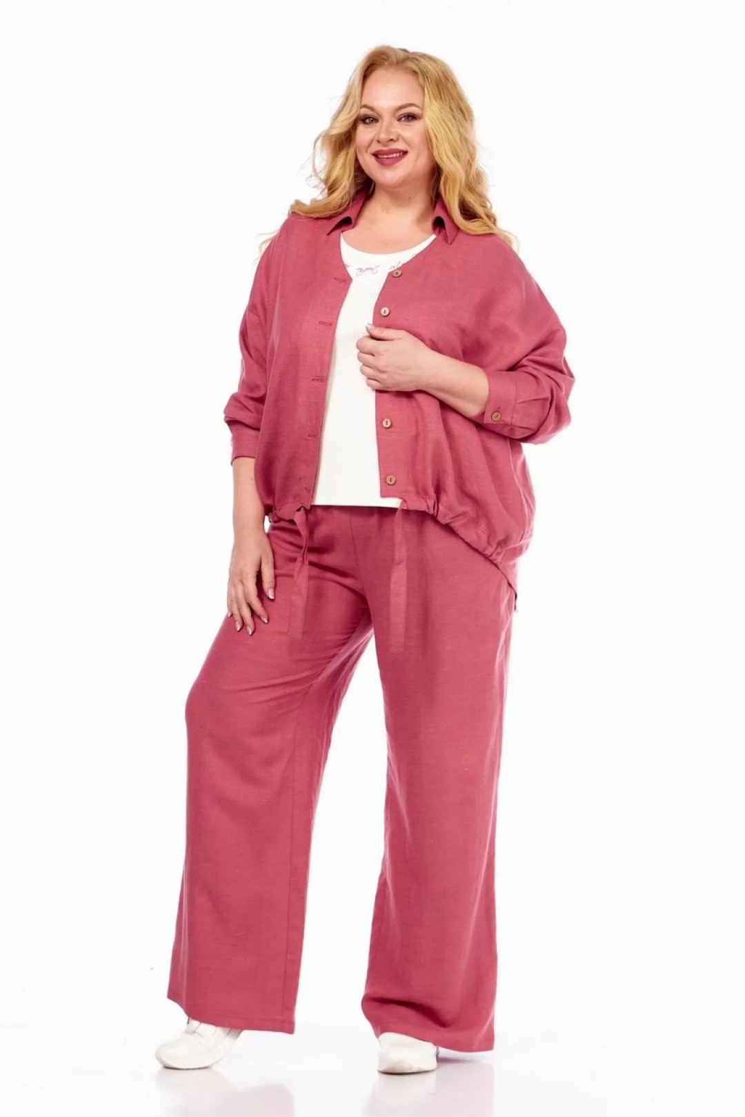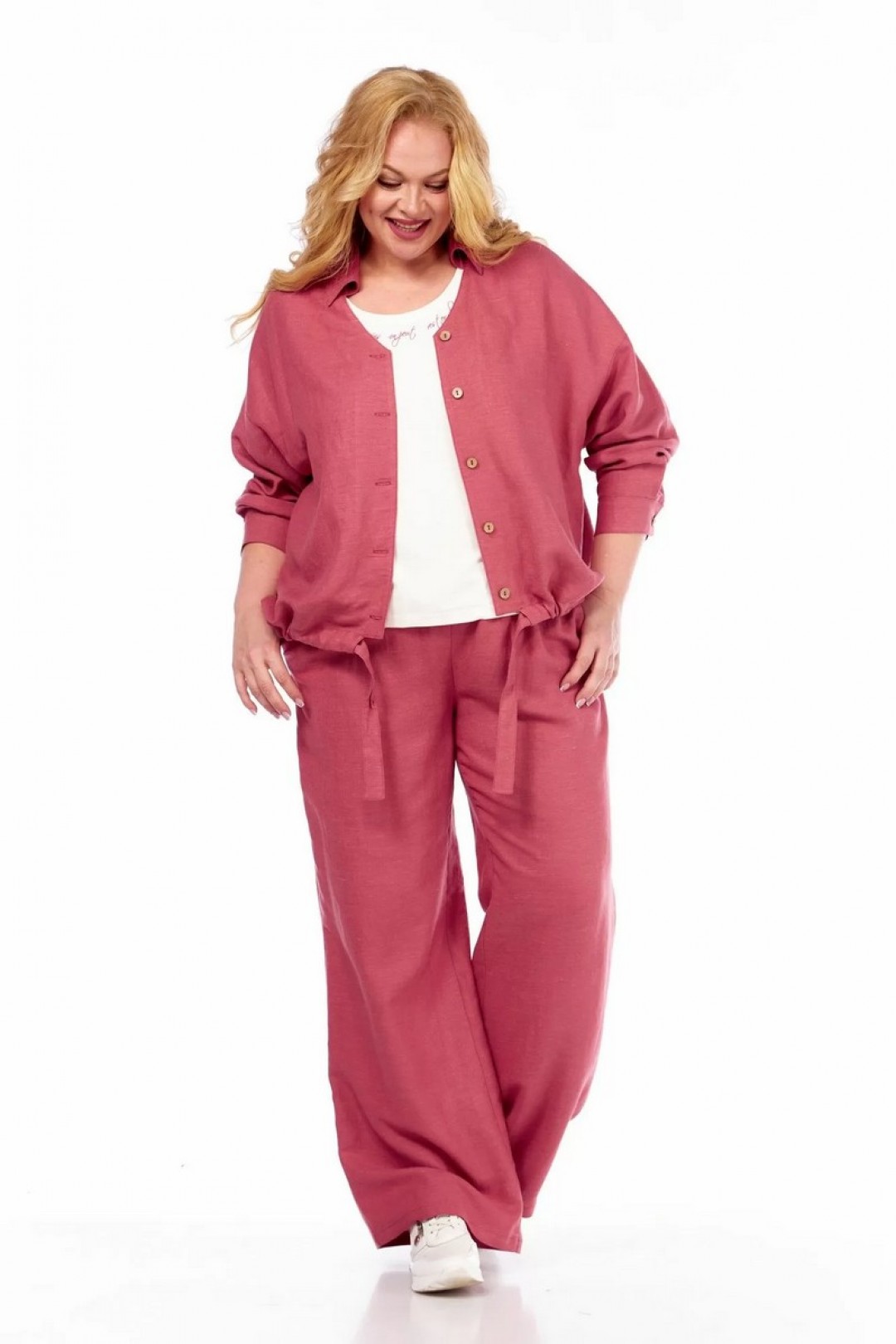 Кардиган свободного кроя с застежкой на петли и пуговицы. Перед с кулисой и завязками по низу. Спинка с округлой формой низа и ассиметричным передом. Рукав одношовный, длиной 3/4 со спущенной линией плеча. Горловина V-образной формы с воротником. Брюки прямые, пояс на резинке, с боковыми карманами. Майка трикожная со спущенной линией плеча. Горловина округлая.