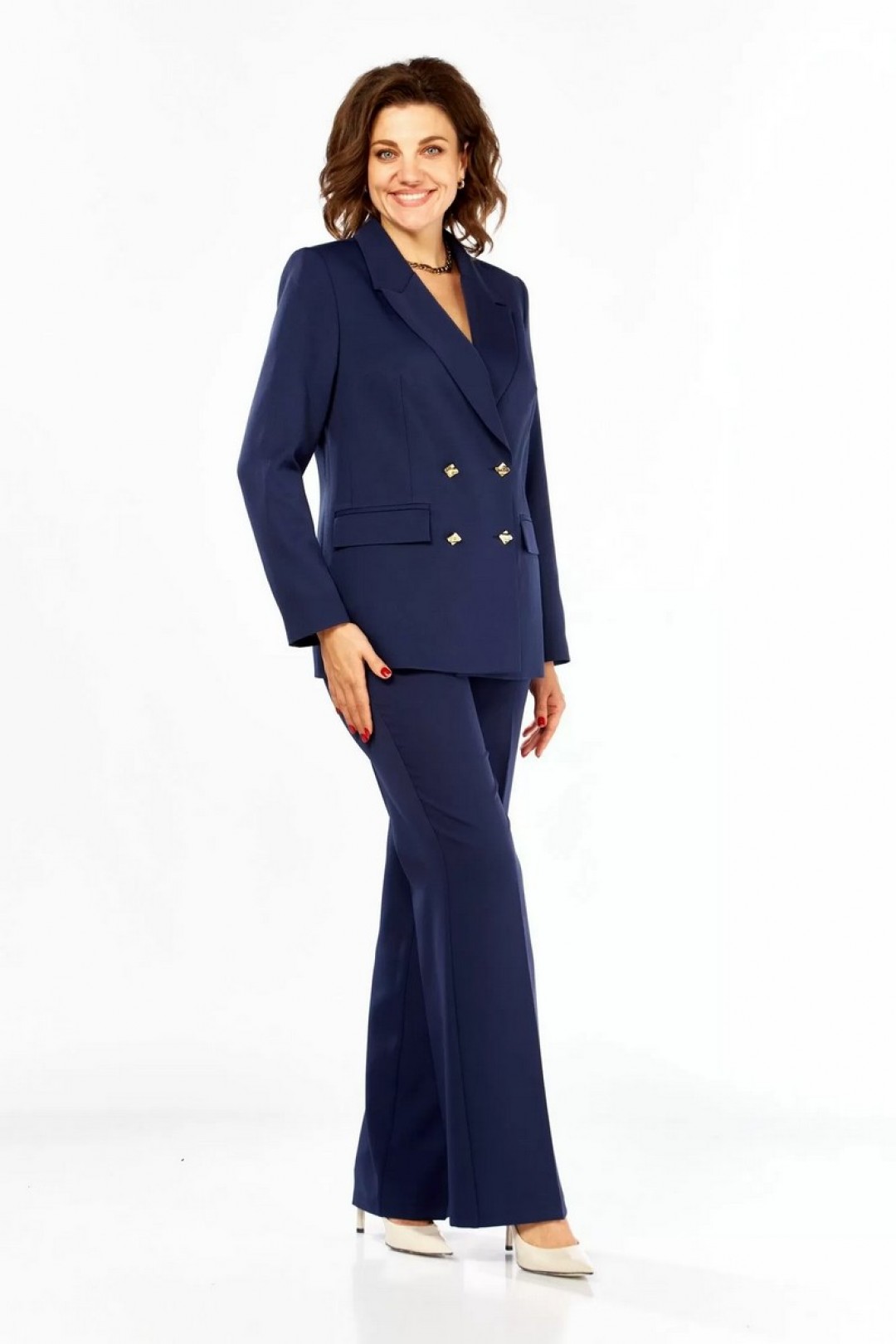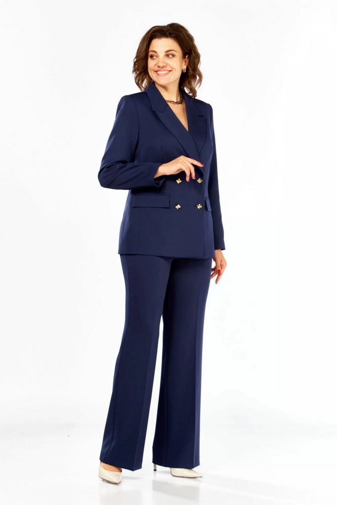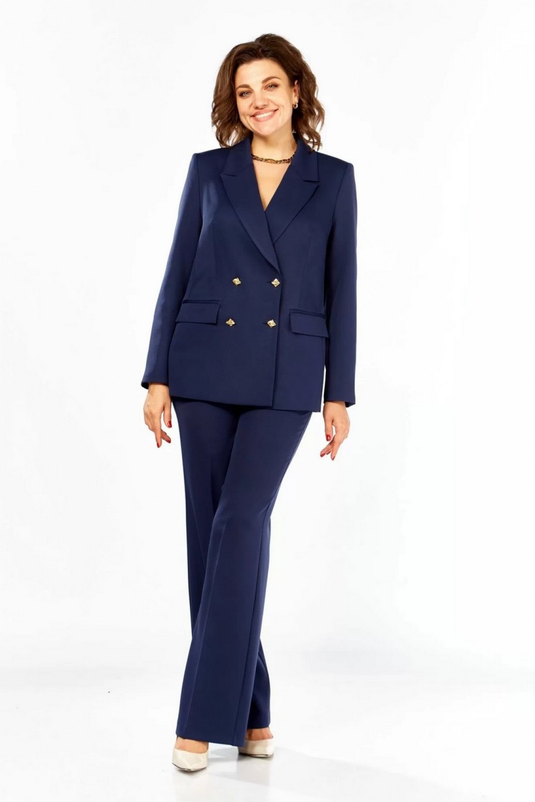 Жакет полуприлегающего силуэта, с рельефными вытачками, воротником с лацканами, на подкладке, с двубортной застежкой на петли и пуговицы, которые обтянуты в тон ткани, по бокам обработаны карманы "в рамку"с клапанами, спинка со средним швом и рельефными вытачками. Рукав длинный, двухшовный. Брюки слегка расклешенные к низу, на притачном поясе с застежкой на пуговицу и тесьму-молнию, по бокам обработаны карманы с отрезным бочком.