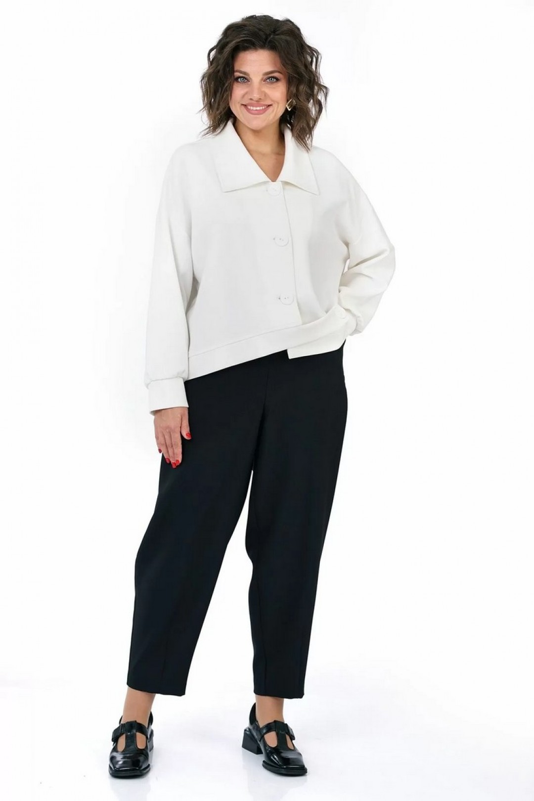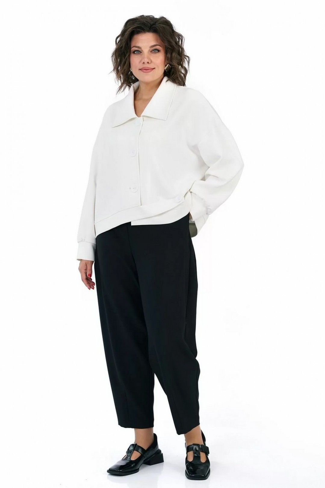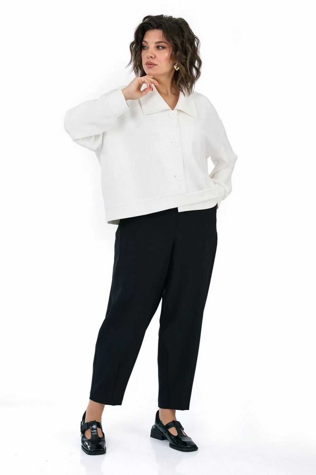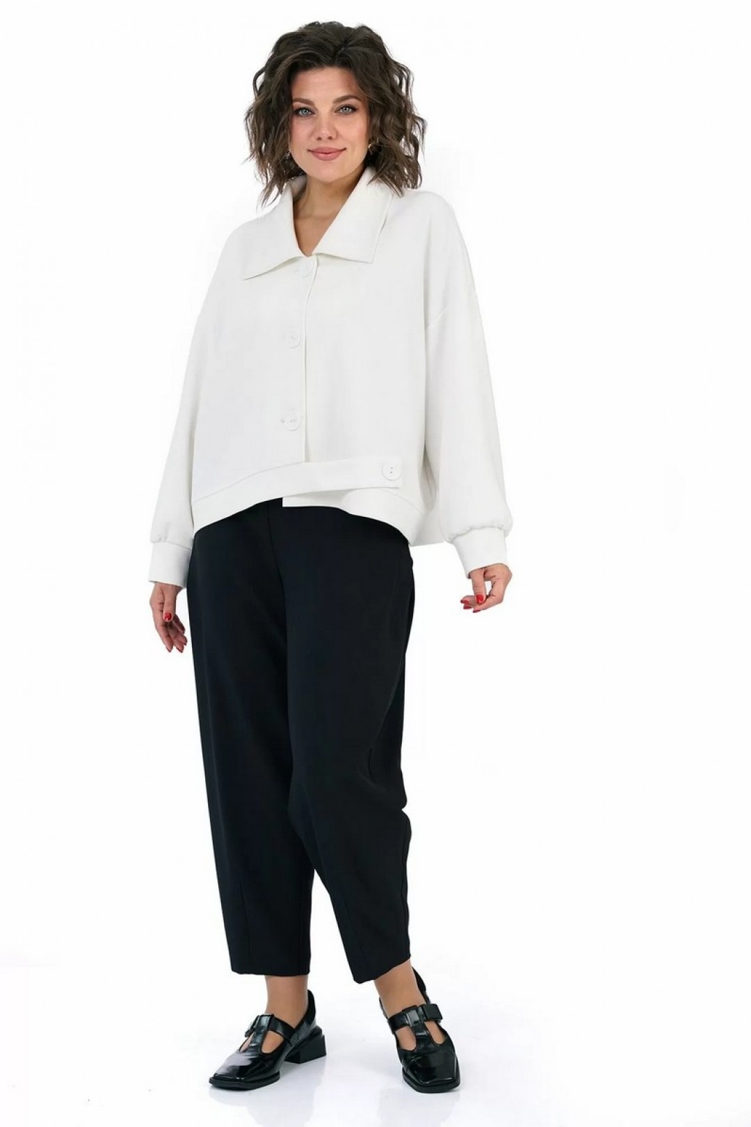 Жакет прямого, свободного силуэта, с застёжкой на петли, пуговицы, со спущенной линией плеча, с фигурной линией низа и притачным поясом. Рукава втачные, одношовные, длинные, понизу со сборкой, притачными манжетами. Воротник отложной.