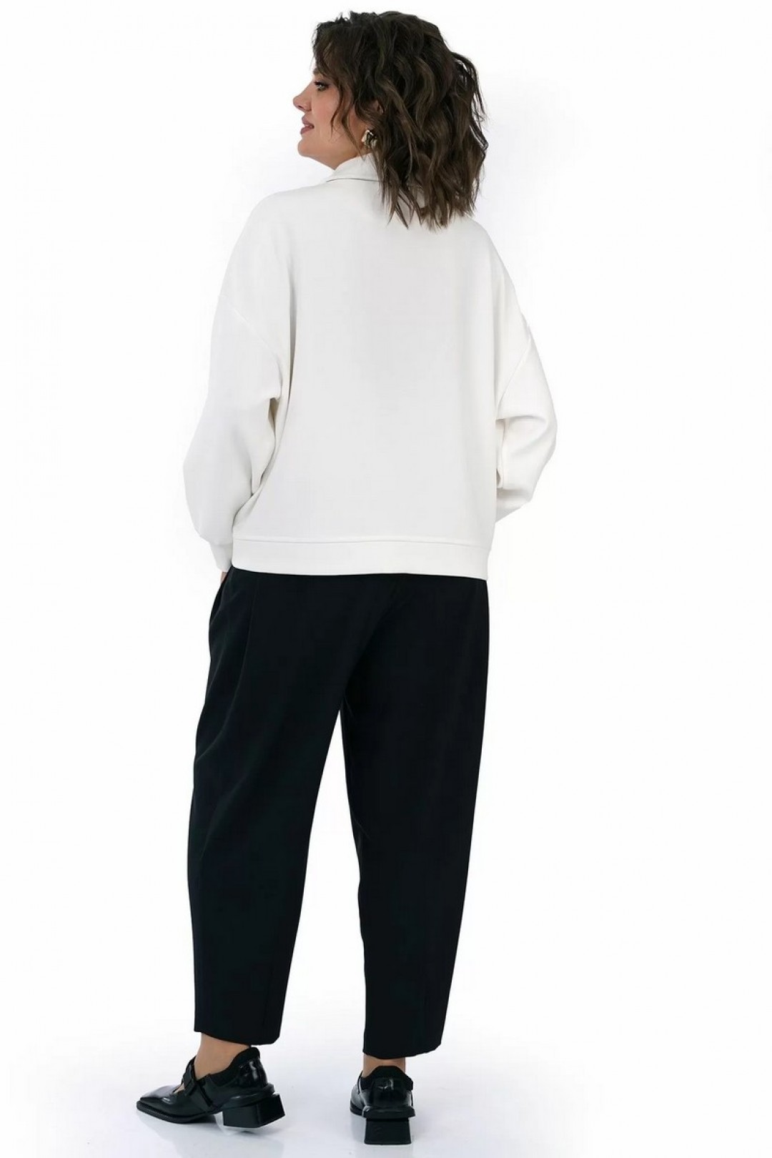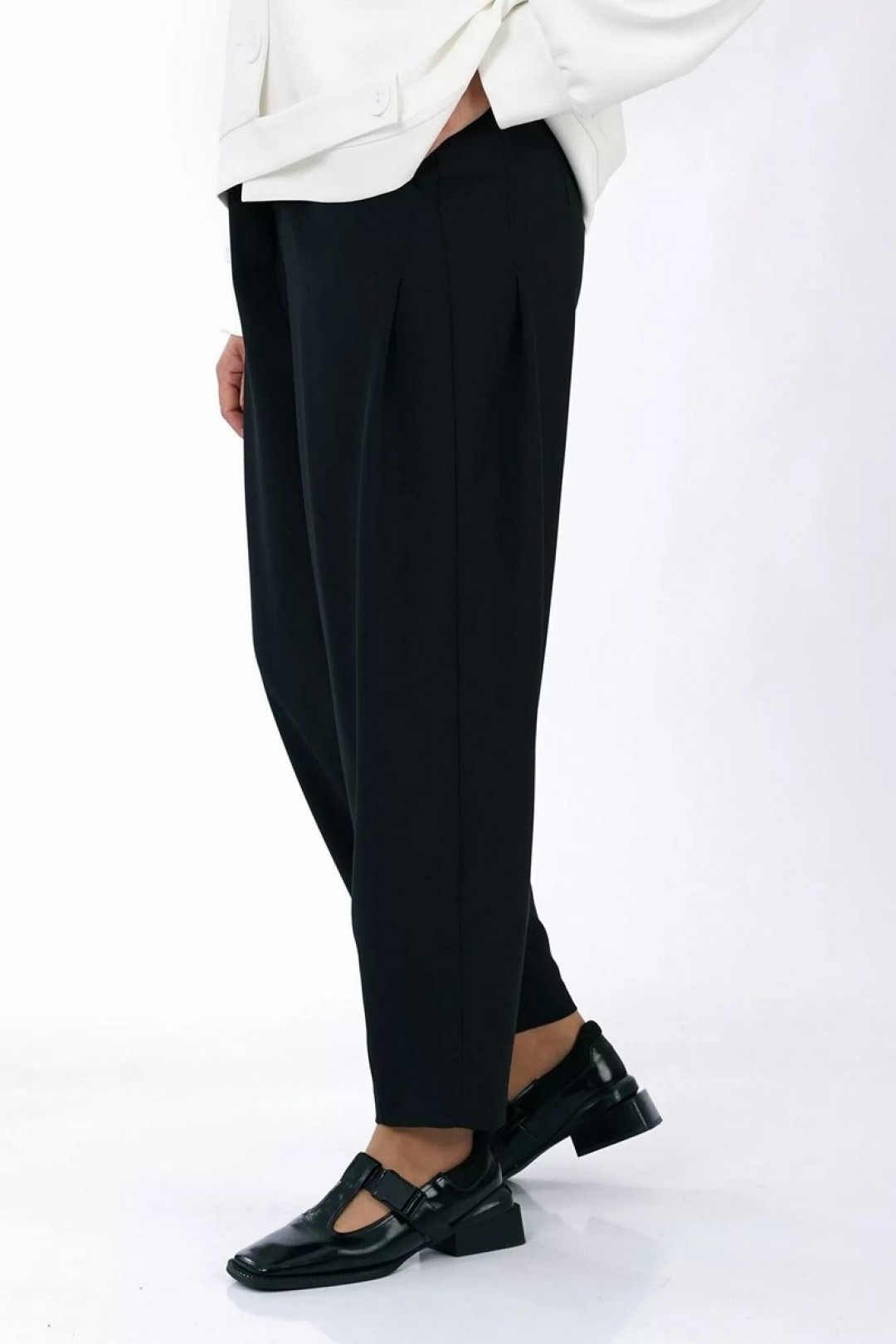 Брюки типа «банан», с притачным поясом по боковым на резнике, с застёжкой типа «гульфик» на молнию и по краю пояса на петлю, пуговицу. С конструктивной выточкой понизу передних и задних частей. Передние части с боковыми карманами, с мягкой застроченной складкой выходящей от входа кармана. Задние части с талевыми выточками и мягкой застроченной складкой от верха.