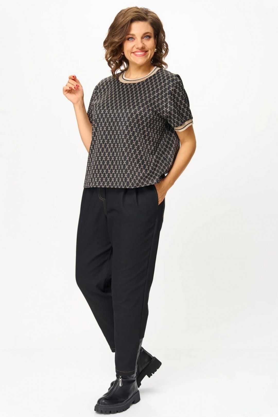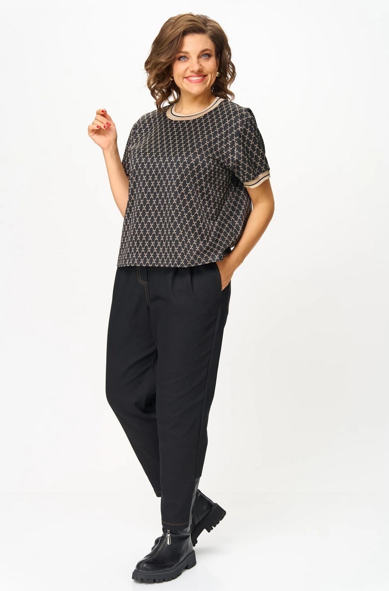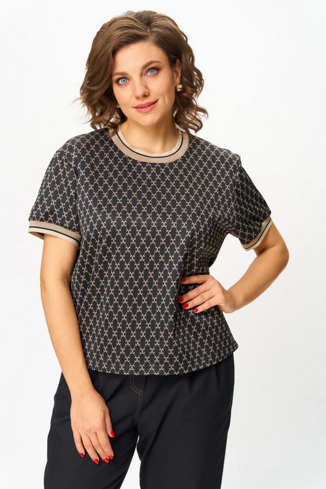 Блузка женская прямого силуэта, выполнена из трикотажного полотна. Горловина круглой формы, рукав одношовный. Горловина и рукав обработаны декоративной бейкой