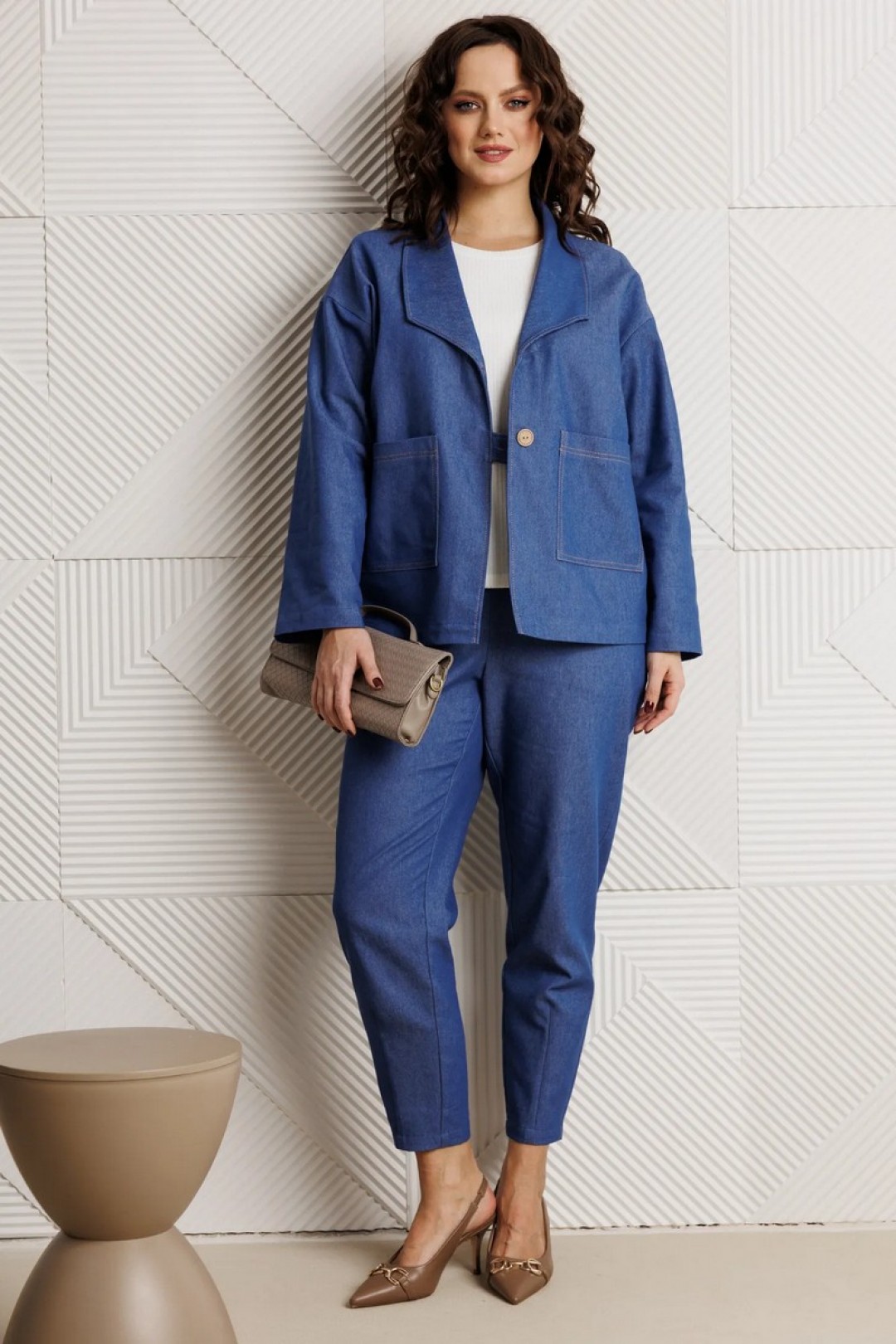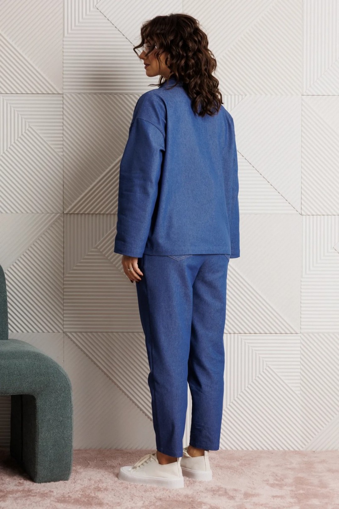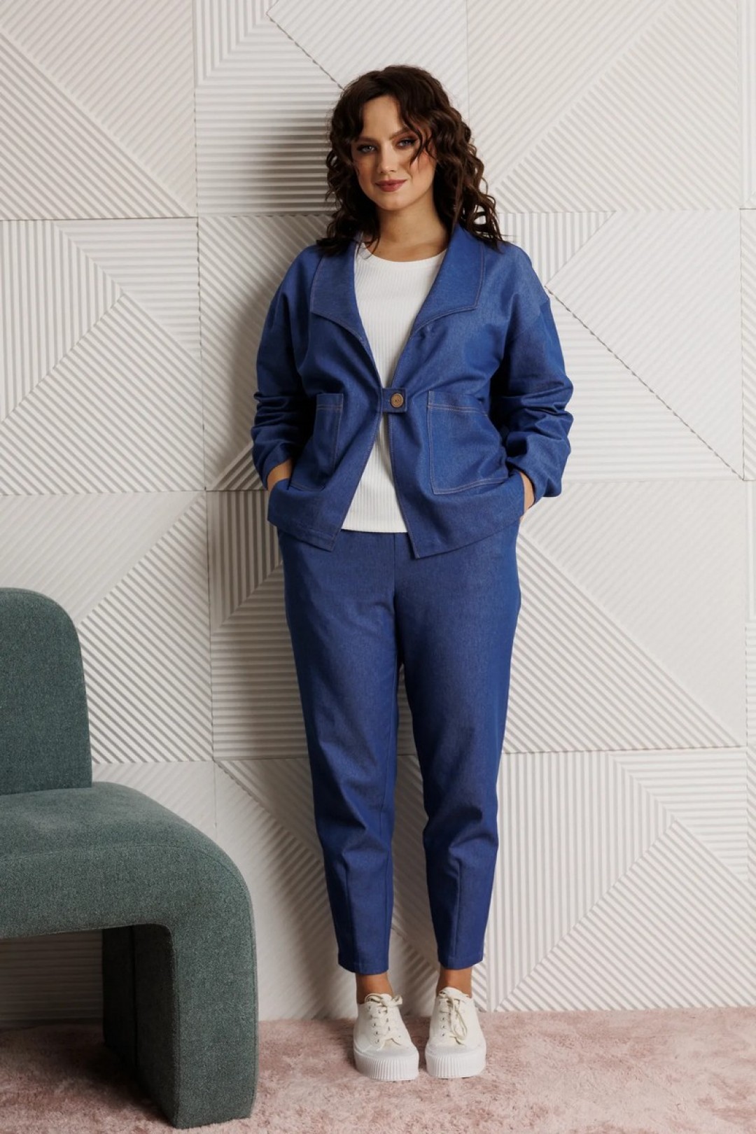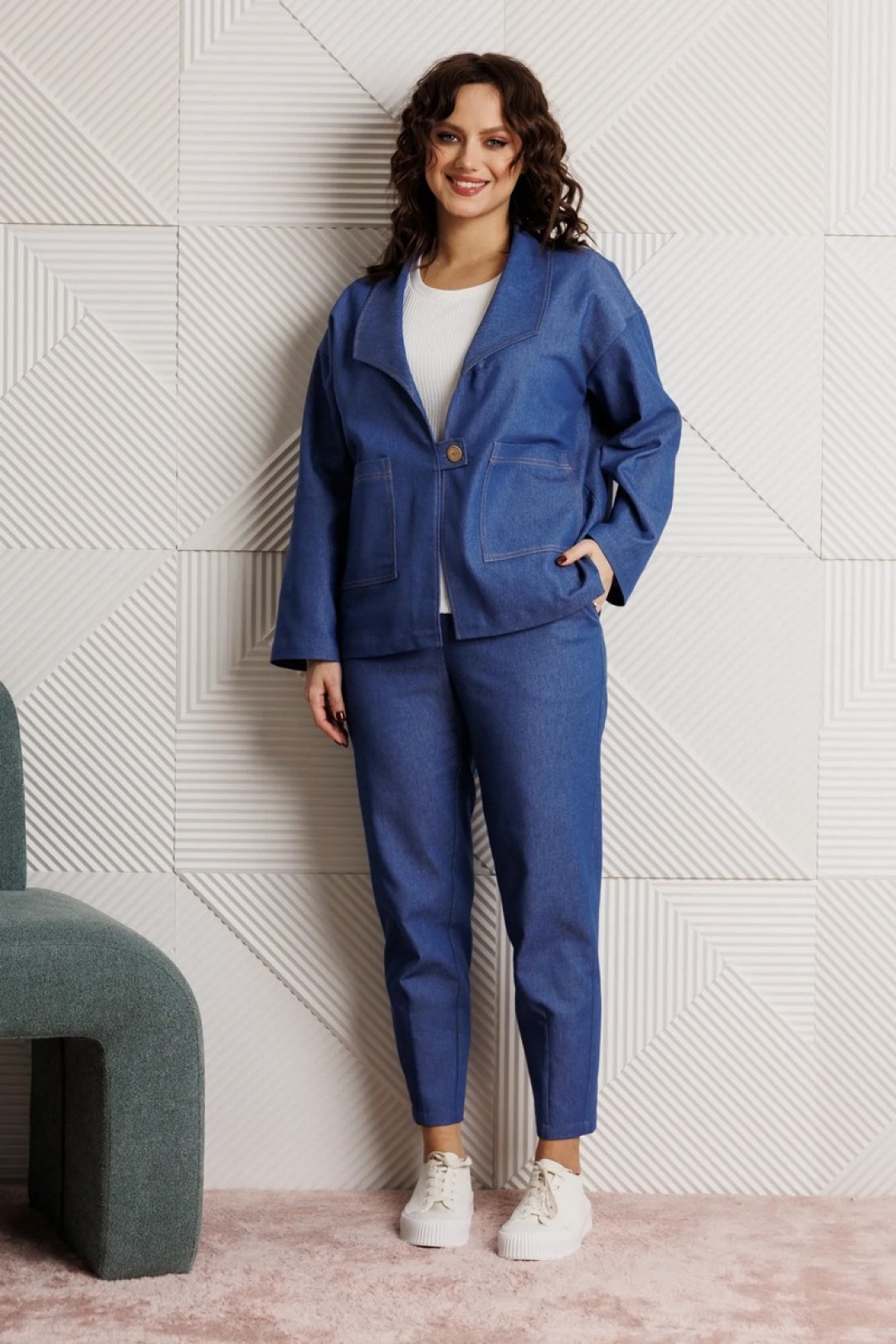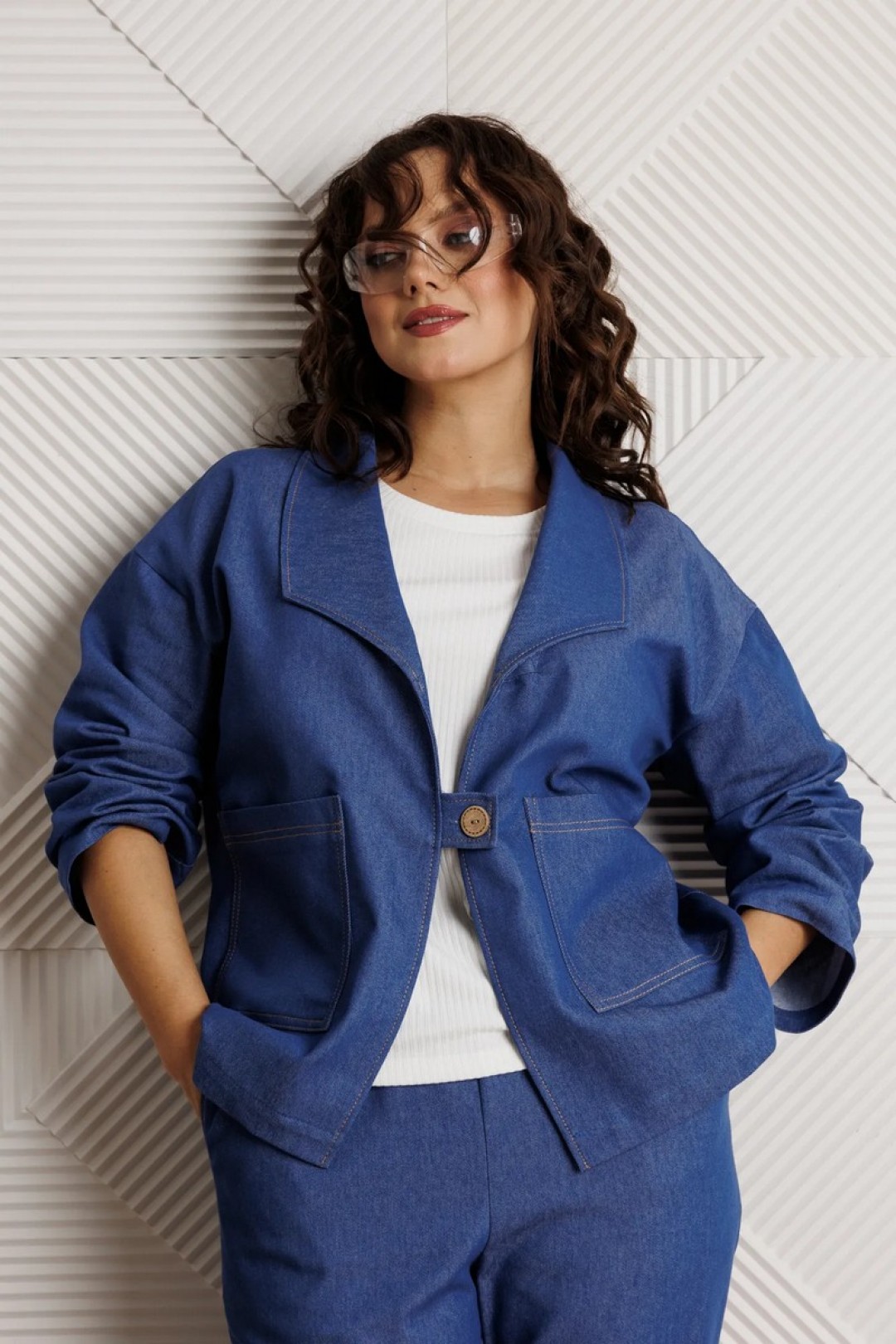Жакет прямого силуэта «оверсайз» со спущенной линией плеча, выполнен из джинсовой ткани (тянется). По переду накладные карманы. Застежка встык на хлястик и отделочную пуговицу. Горловина с глубоким отворотом, оформлена воротником типа «Шаль». Рукав одношовный.