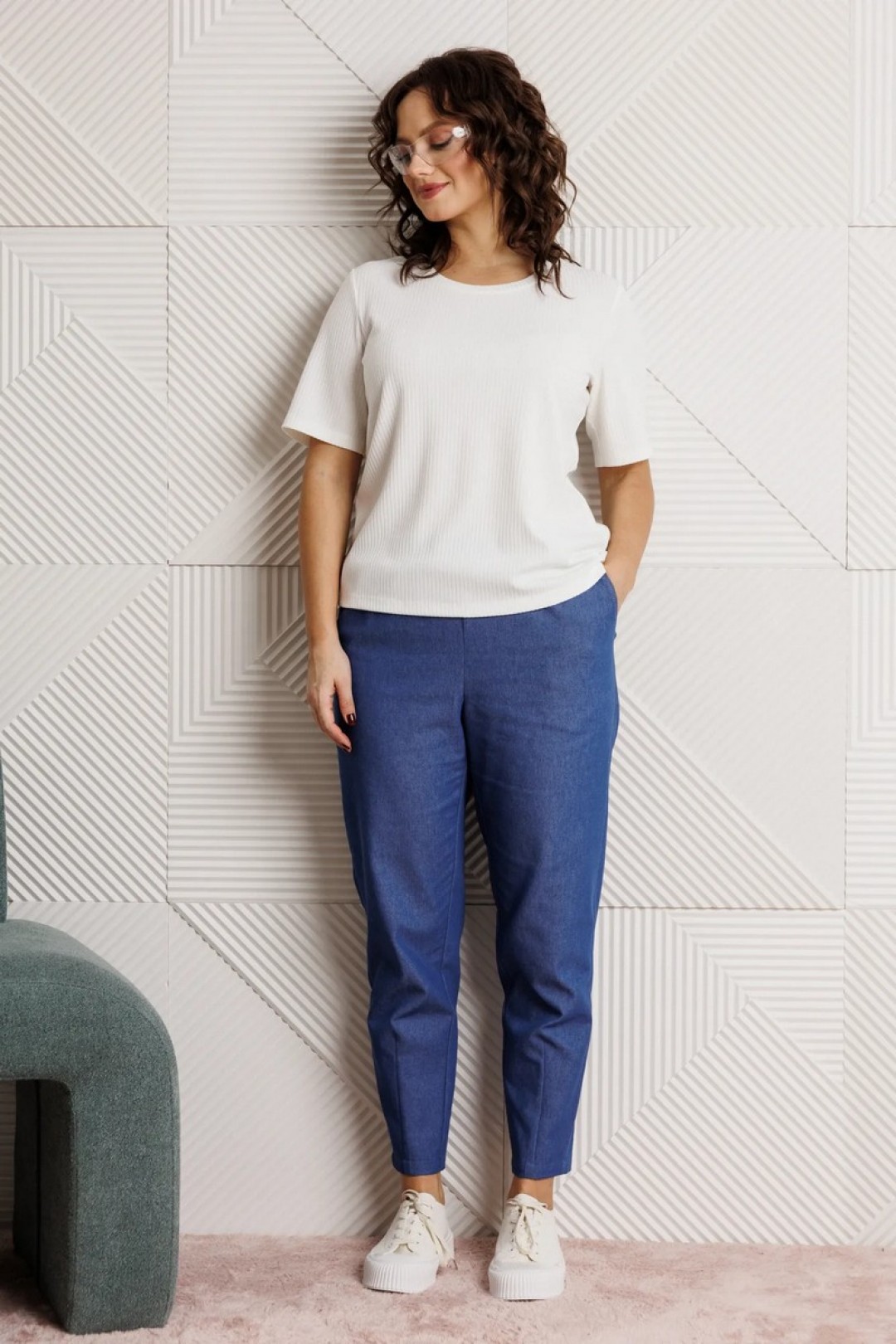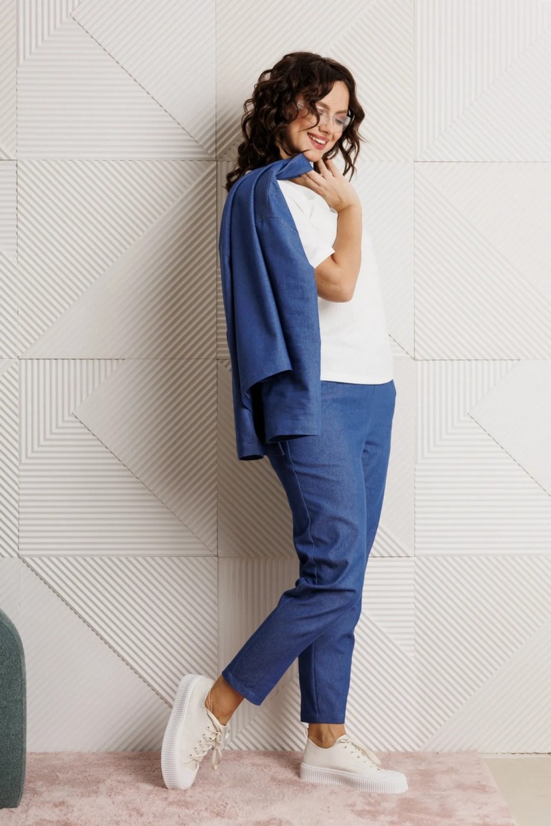 Брюки зауженные книзу с высокой посадкой, выполнены из джинсовой ткани (тянется). Верхний срез оформлен поясом с эластичной резинкой. Низ брюк с застроченными вытачками. В боковых швах наклонные карманы. По задним половинкам отрезные кокетки и накладные карманы