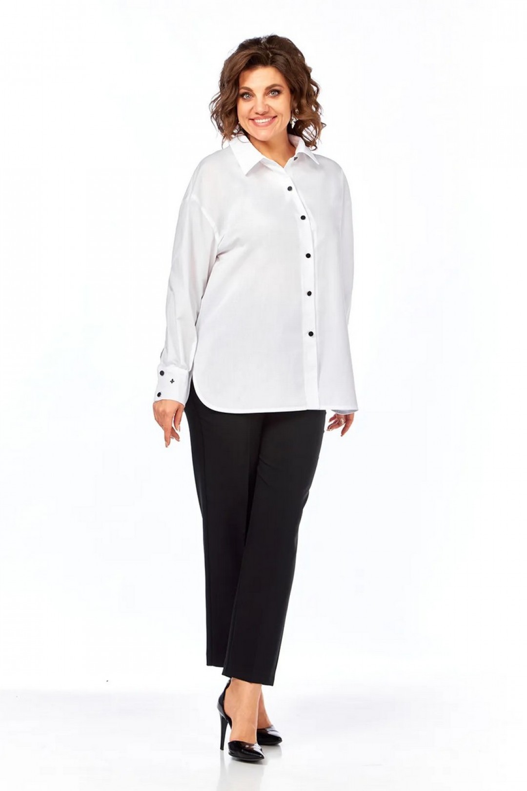 Блузка свободного кроя, выполнена из х/б ткани. Воротник рубашечного типа, застежка центральная на петли и пуговицы. Рукава спущенные на манжетах с застежкой на петли и пуговицы.