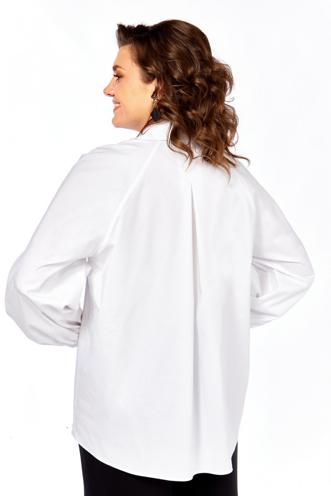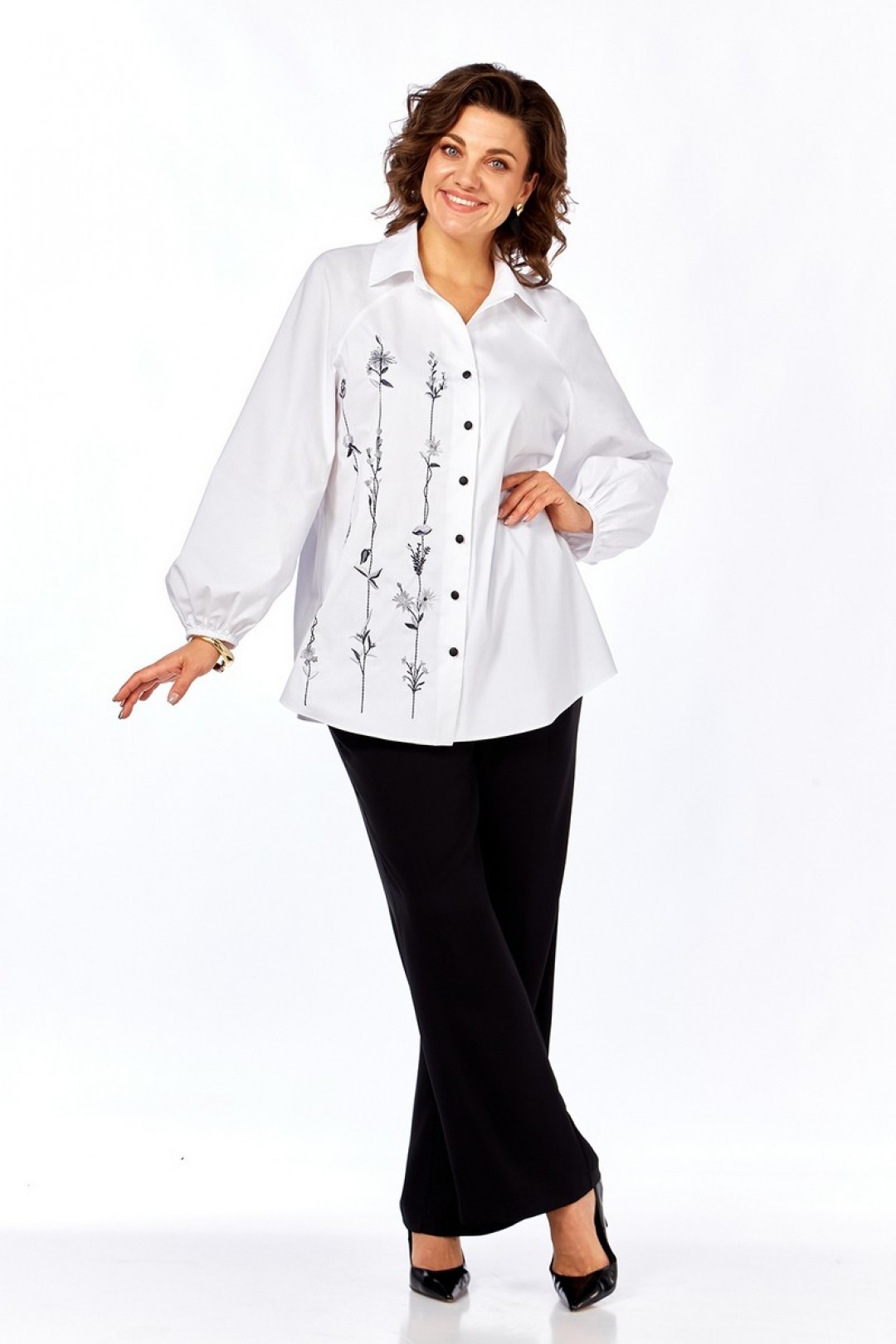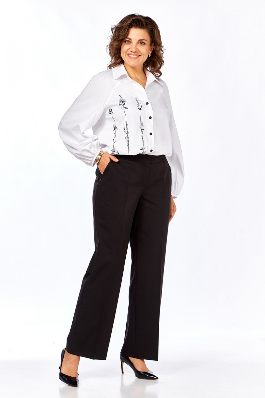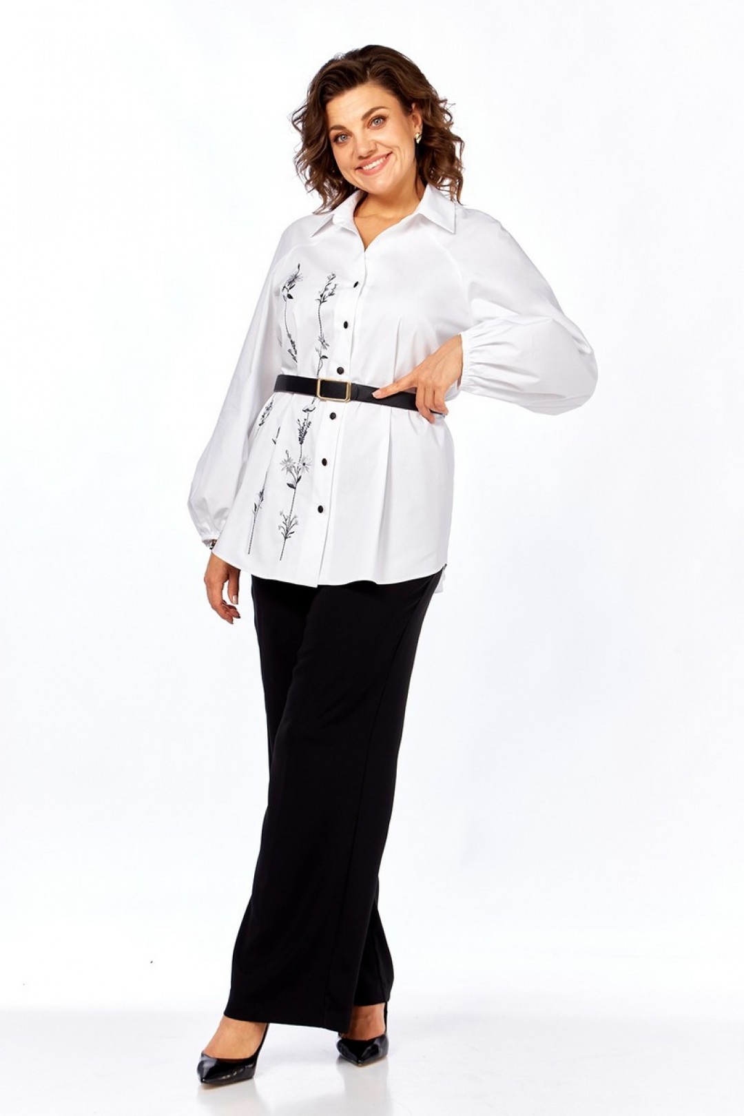 Блузка женская свободного кроя из рубашечной ткани. Воротник стояче-отложной, застежка центральная на петли и пуговицы. На полочке дизайнерская вышивка. Спинка со встречной складкой. Рукава-реглан, с резинкой по низу. Низ блузки фигурной формы. В комплекте-ремень. Брюки прямого силуэта из костюмно-плательной ткани. Пояс на резинке. В брюках обработаны карманы.