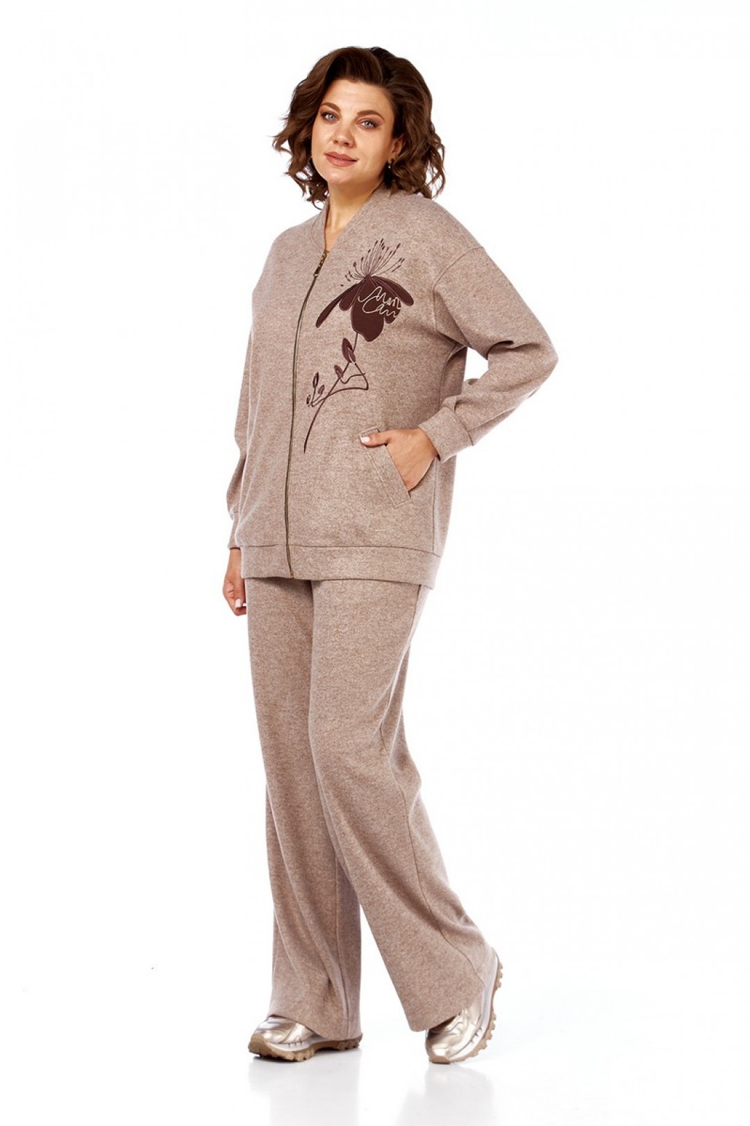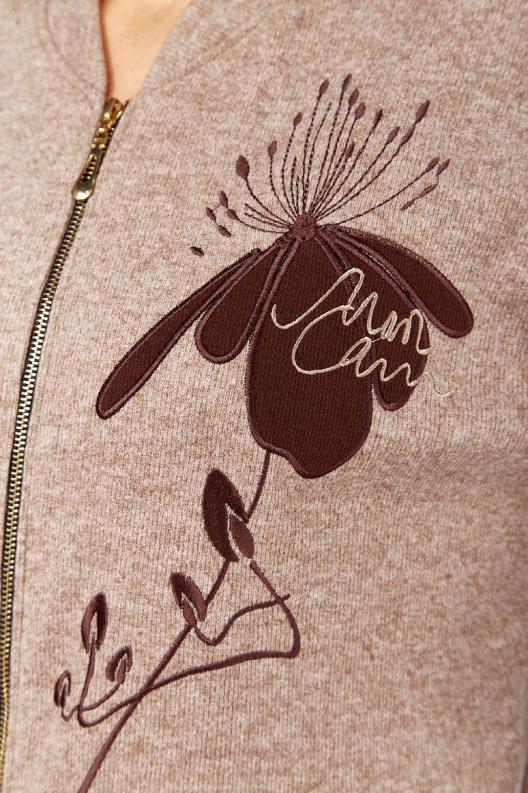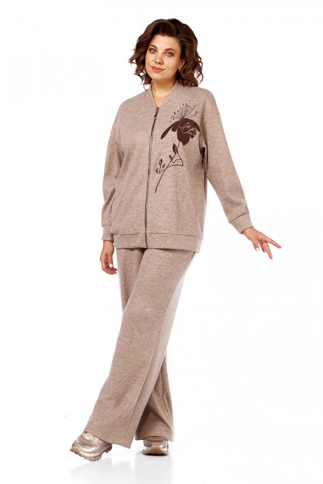 Выполнен из трикотажного полотна. Бомбер свободного силуэта, горловина обработана стойкой, застежка центральная на тесьму-молнию. По переду обработаны прорезные карманы с листочкой. Спинка на кокетке. По низу бомбера притачной пояс. Рукава спущенные по низу на манжетах. Изделие дополнено дизайнерской вышивкой. Брюки прямого силуэта с притачным поясом на эластичной тесьме , со шнуром. В передних деталях брюк обработаны карманы.
