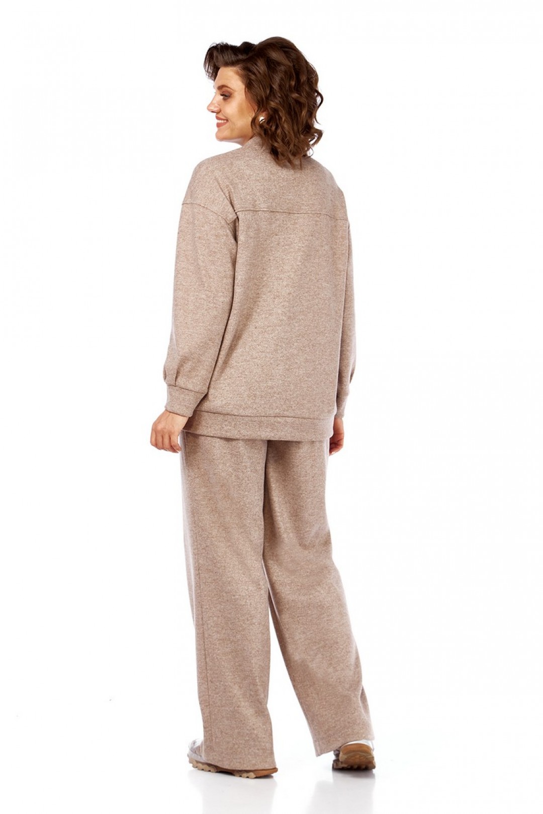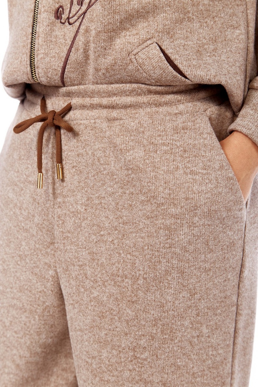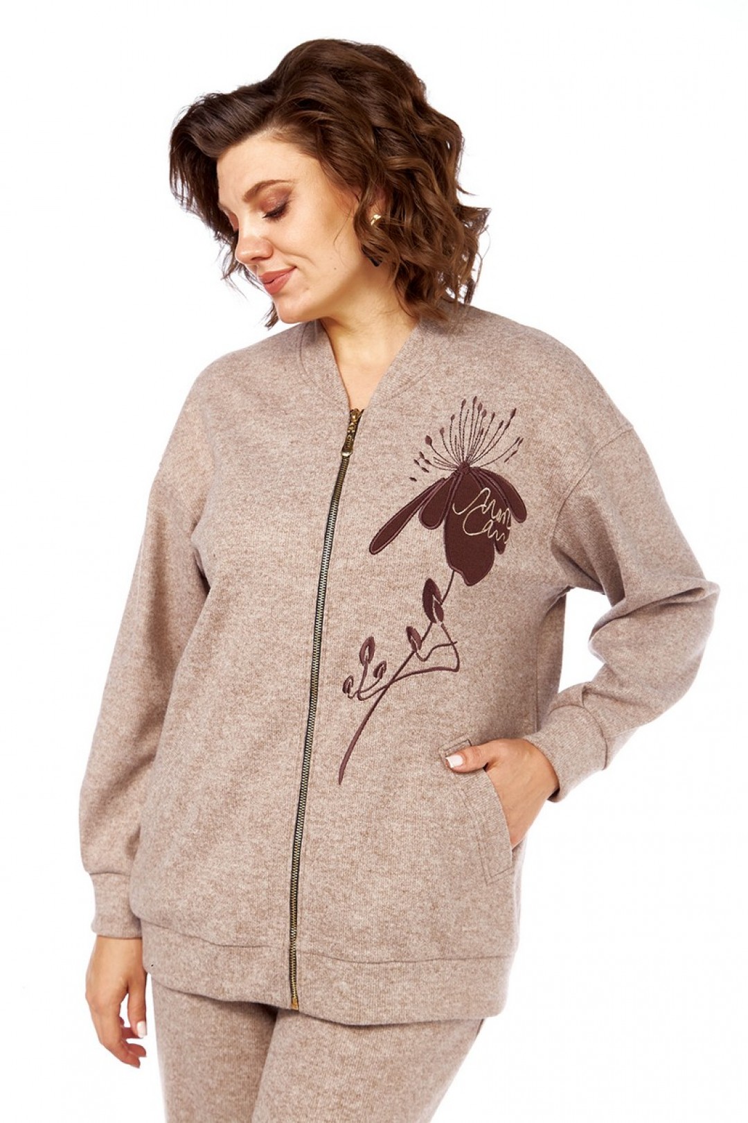 Выполнен из трикотажного полотна. Бомбер свободного силуэта, горловина обработана стойкой, застежка центральная на тесьму-молнию. По переду обработаны прорезные карманы с листочкой. Спинка на кокетке. По низу бомбера притачной пояс. Рукава спущенные по низу на манжетах. Изделие дополнено дизайнерской вышивкой. Брюки прямого силуэта с притачным поясом на эластичной тесьме , со шнуром. В передних деталях брюк обработаны карманы.