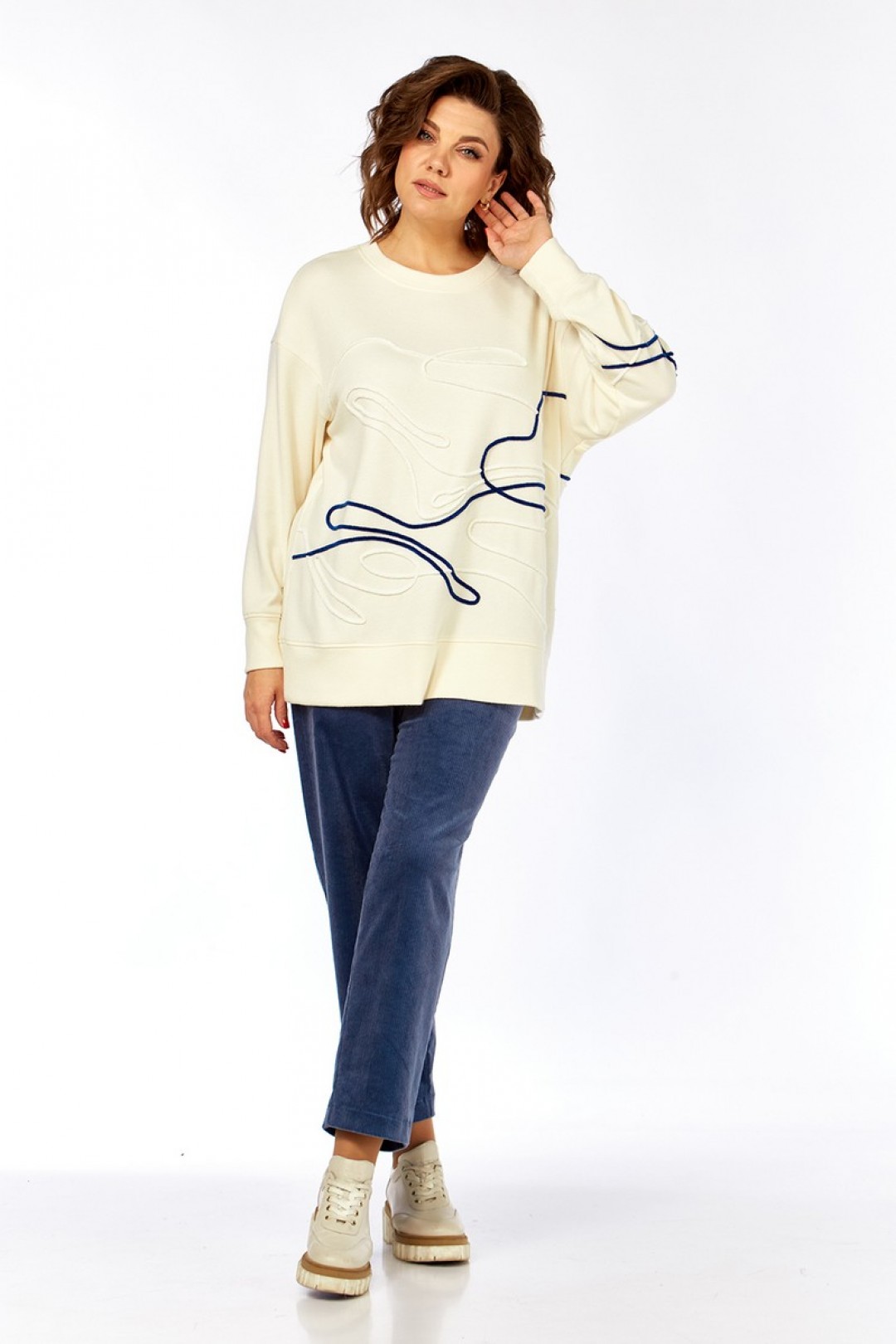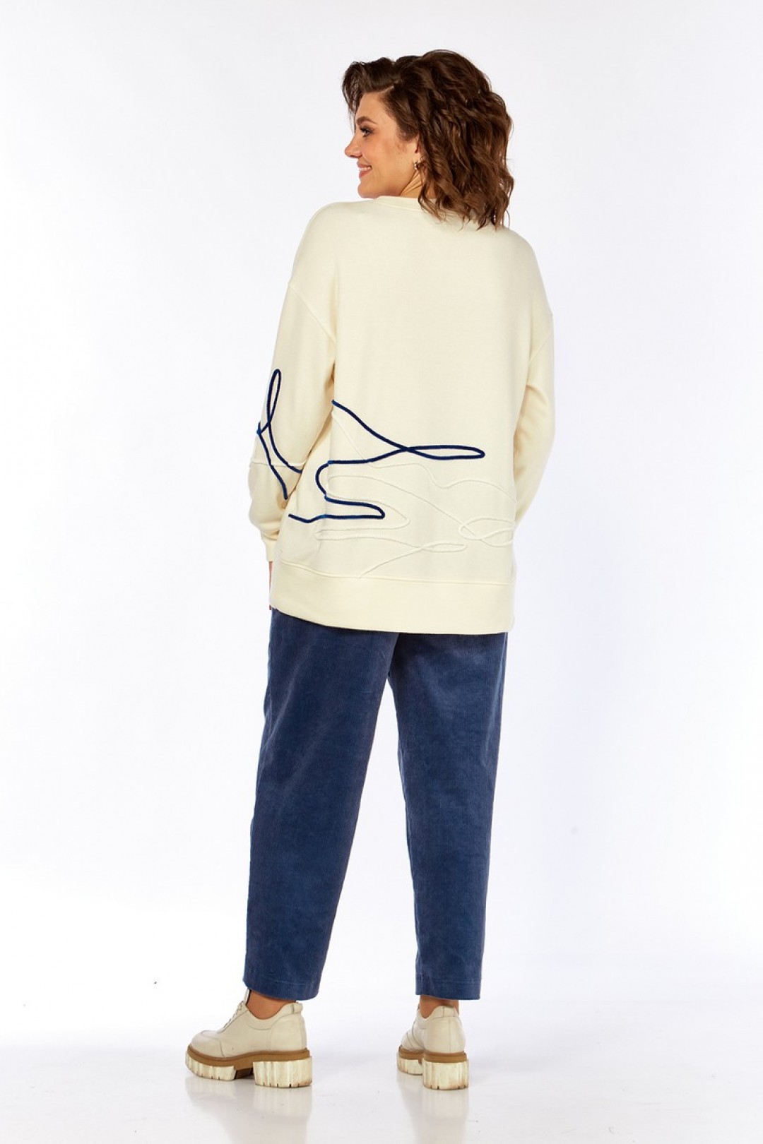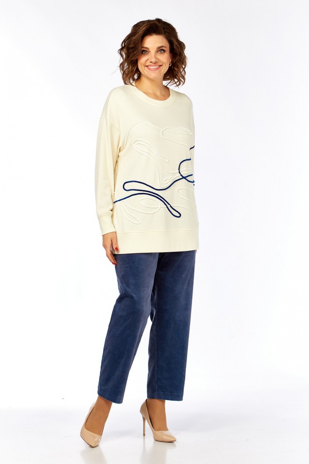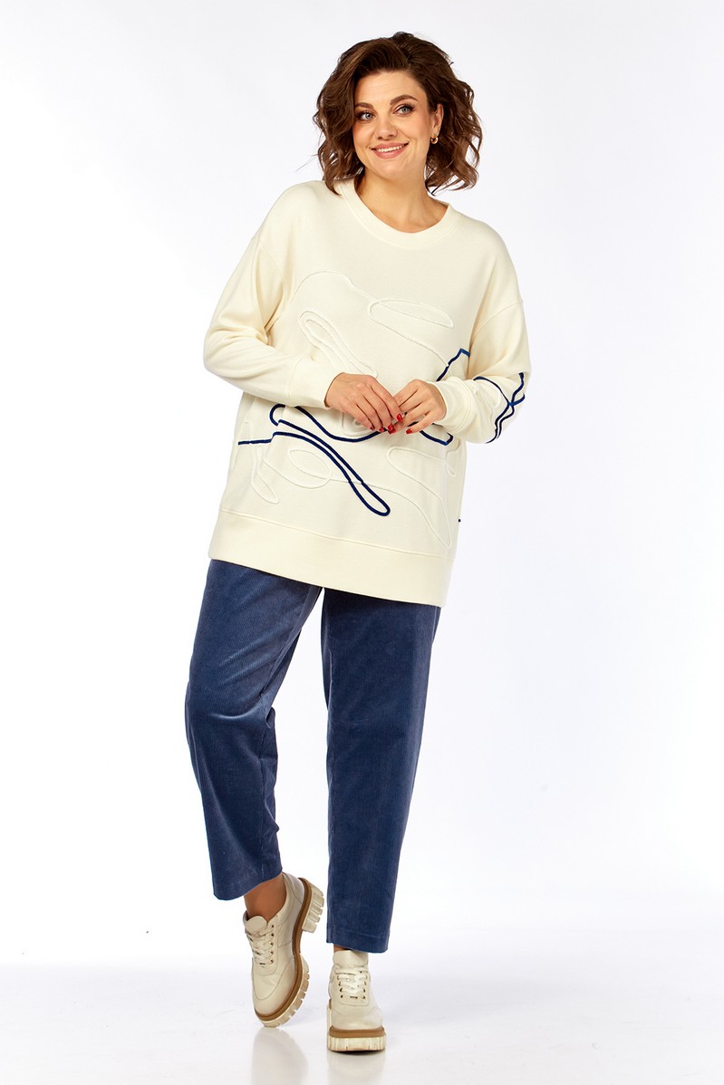Комплект брючный, состоит из джемпера и брюк. Джемпер свободного кроя изготовлен из трикотажного полотна. Горловина круглой формы. На полочке спинки и рукаве — вышивка шнуром. Рукава спущенные, с манжетами по низу. Брюки, классической посадки, заужены к низу. Выполнены из ткани вельвет. Пояс притачной, частично на резинке. Застежка на тесьму-молнию, петлю и пуговицу. В брюках обработаны карманы.