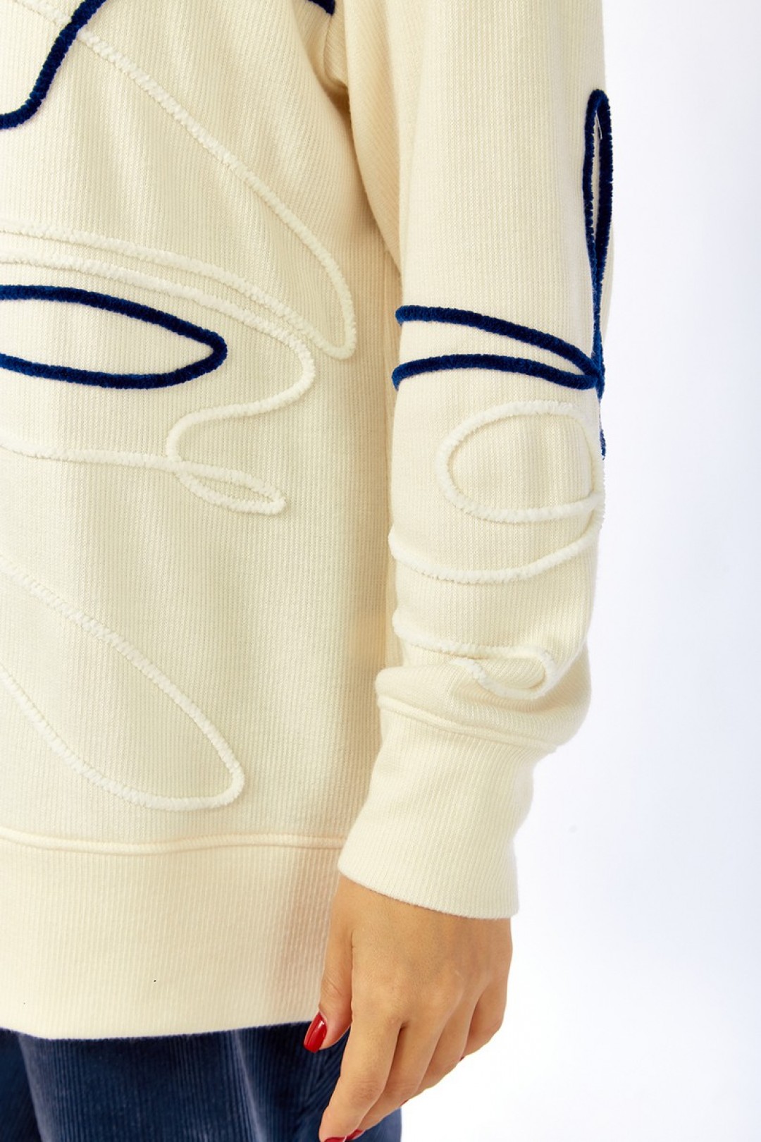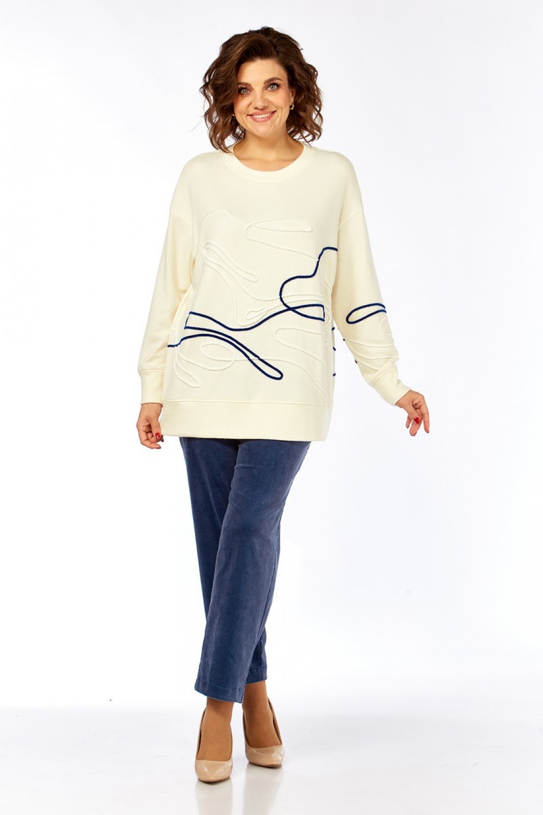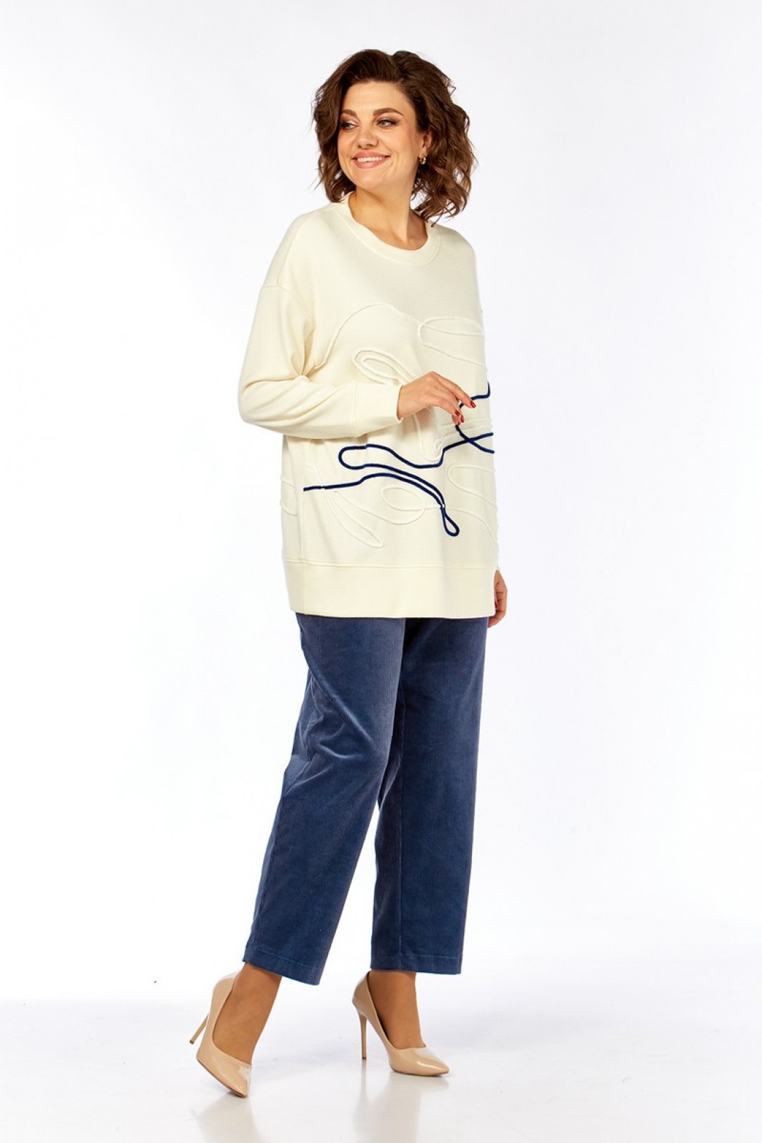 Комплект брючный, состоит из джемпера и брюк. Джемпер свободного кроя изготовлен из трикотажного полотна. Горловина круглой формы. На полочке спинки и рукаве — вышивка шнуром. Рукава спущенные, с манжетами по низу. Брюки, классической посадки, заужены к низу. Выполнены из ткани вельвет. Пояс притачной, частично на резинке. Застежка на тесьму-молнию, петлю и пуговицу. В брюках обработаны карманы.