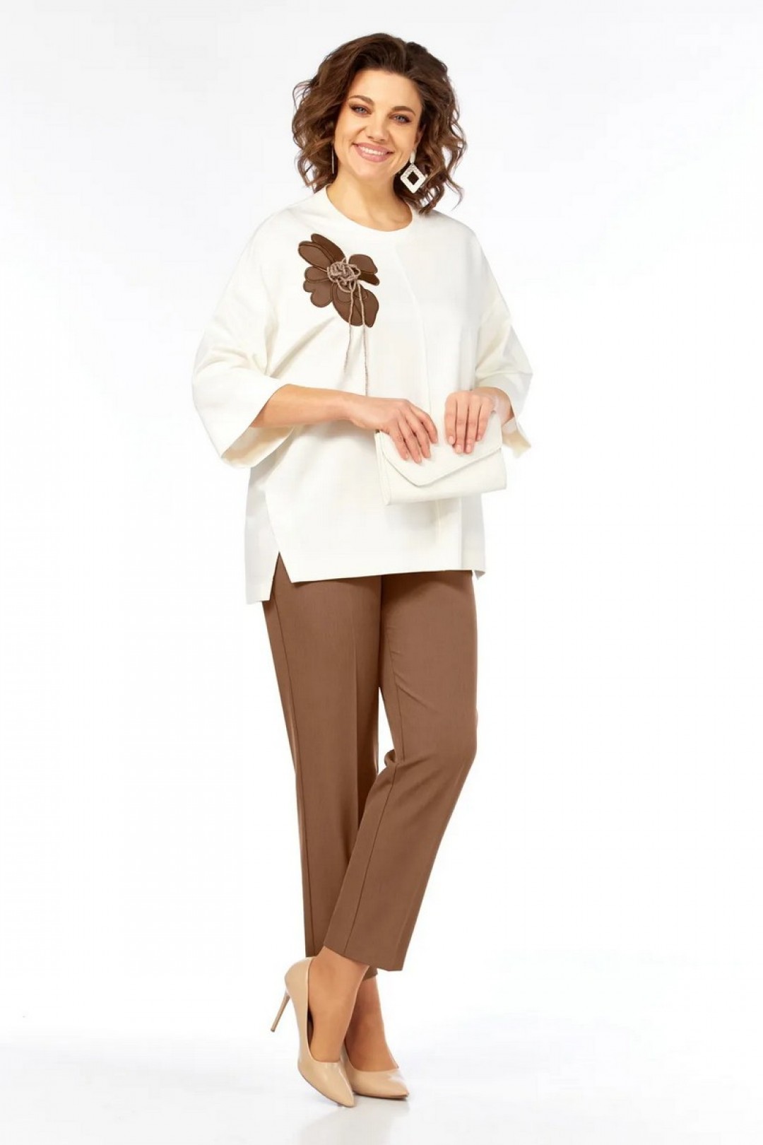 Комплект брючный 2-х предметный, состоит из джемпера и брюк. Джемпер свободного силуэта, выполнен из трикотажного полотна. Горловина округлой формы обработана бейкой. Перед и спинка разрезные по центру и обработаны декоративным швом. Рукава спущенные. В боковых швах обработаны фигурные шлицы. Джемпер декорирован дизайнерской вышивкой — аппликацией. Брюки классической посадки с притачным поясом со вставками эластичной тесьмы. Застежка на петлю и пуговицу. В передних деталях брюк имеются карманы с подрезным бочком