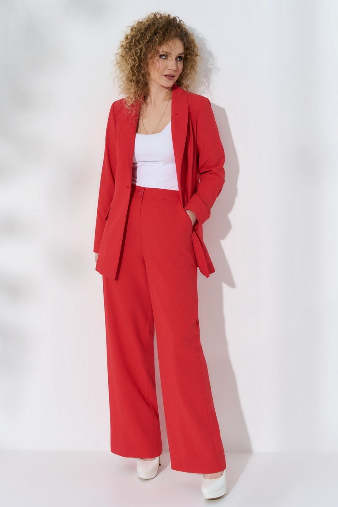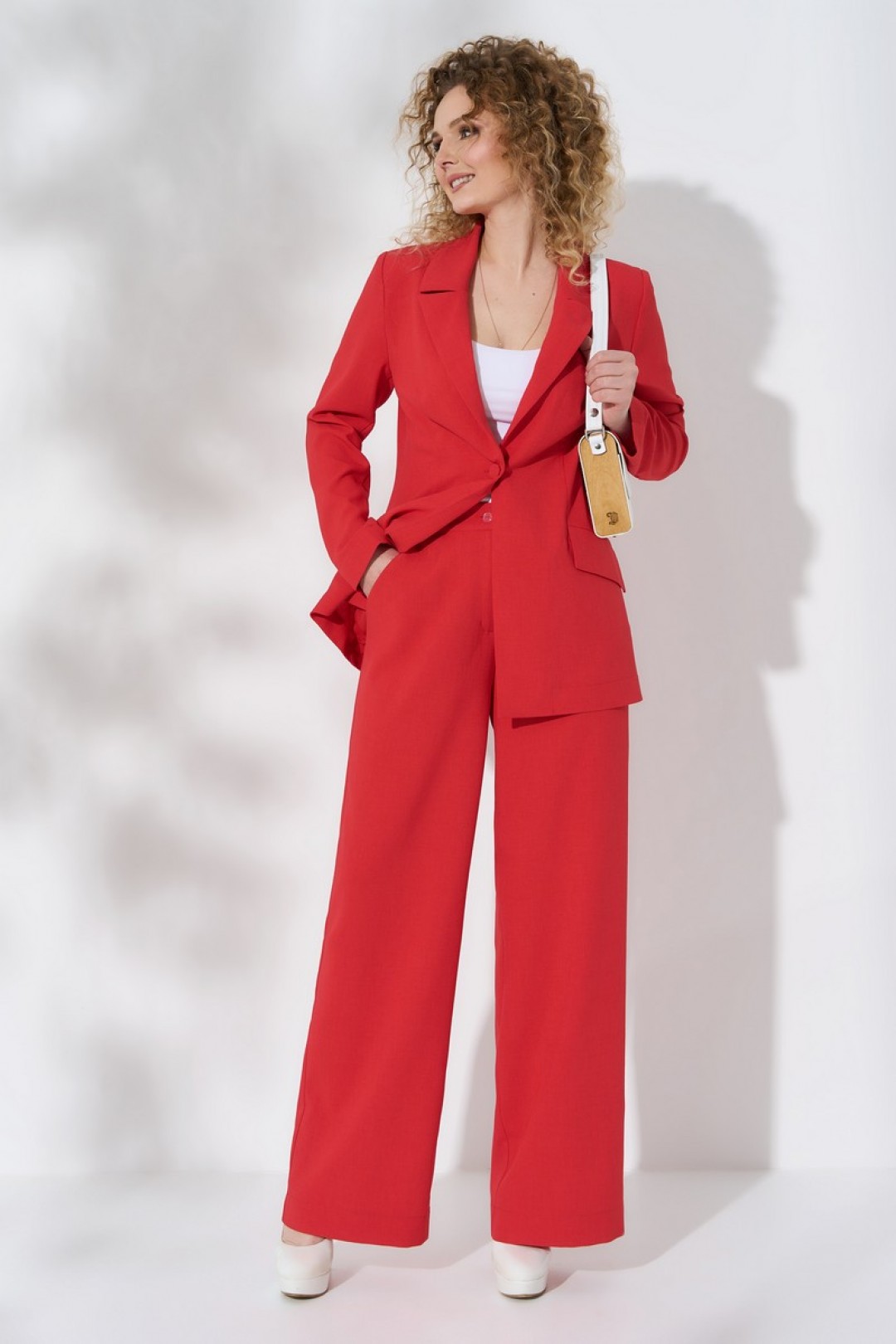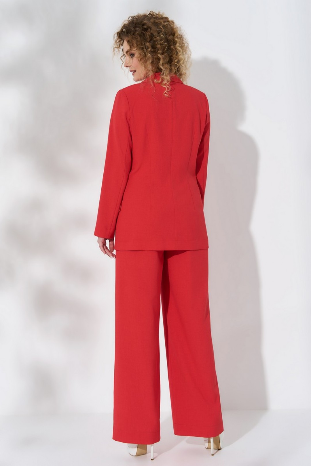 Жакет прилегающего кроя, по полочке жакета расположены прорезные карманы с клапанами. Горловина - отложной воротник с лацканами. Рукав втачной длинный. Застежка петля-пуговица. Брюки прямого кроя с высокой посадкой, на притачном поясе со вставками эластичной тесьмы. В боковых швах брюк-палаццо имеются карманы. Застежка молния на гульфике, петля-пуговица. Жакет без подкладки.