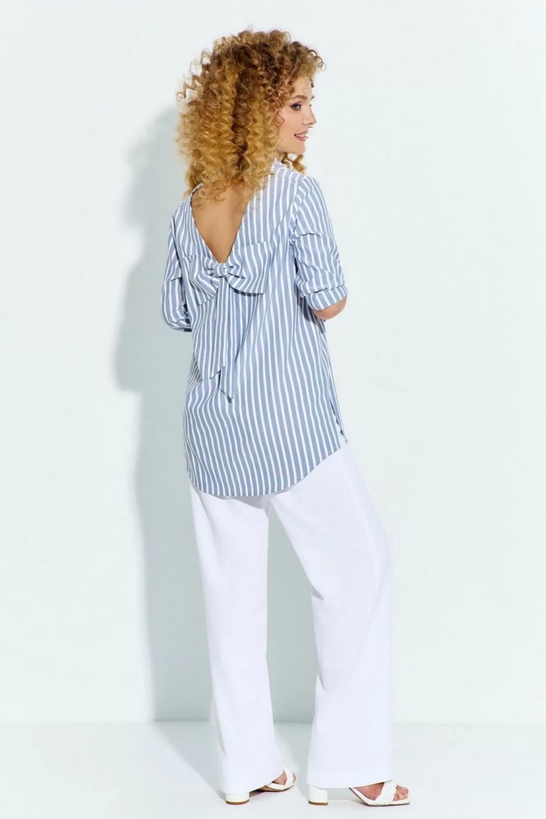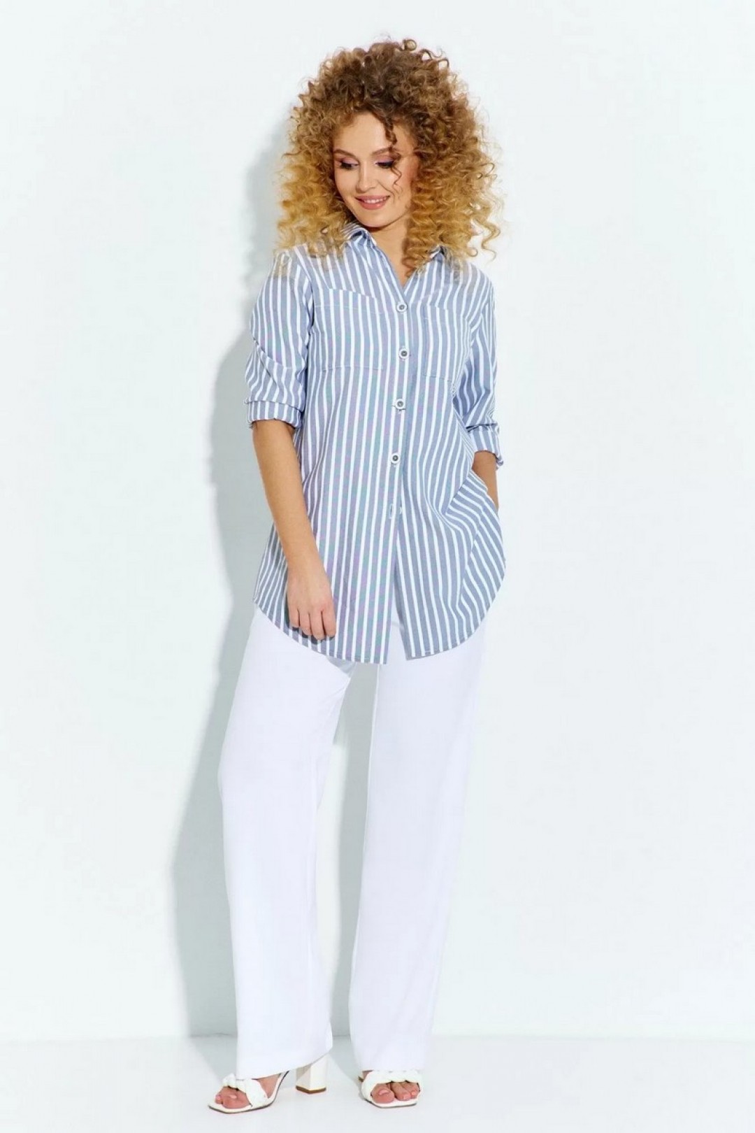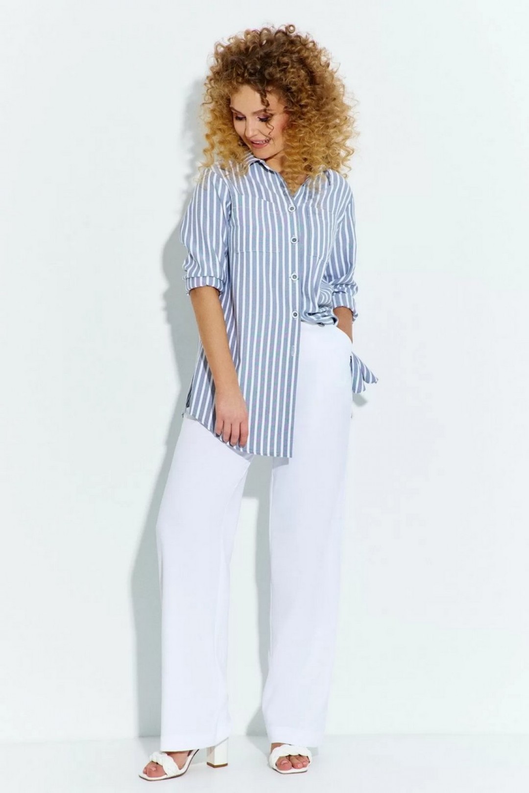 Костюм женский с рубашкой в полоску выполнен из костюмной ткани. В комплект входит: рубашка и брюки. Рубашка свободного кроя, по полочке изделия расположены накладные карманы. Рукав изделия длинный. Горловина отложной воротник на стойке. По спинке изделия расположена кокетка и декоративный вырез с бантом. Застежка на рубашке : петли-пуговицы. Брюки прямого кроя на притачном поясе с резинкой. в боковых швах брюк имеются карманы, застежка молния на гульфике.