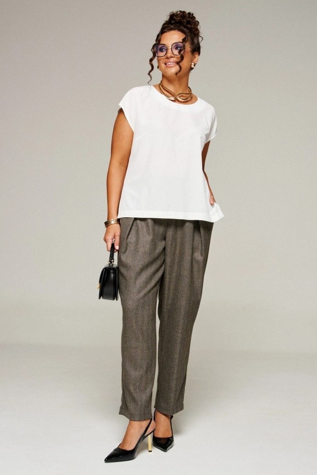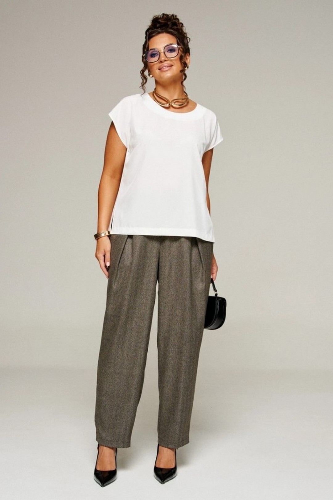 Брюки свободного силуэта расширенные вверху и слегка зауженные к низу, длиной до щиколотки, с двумя верхними боковыми карманами и двумя заложенными глубокими складками от пояса спереди. Высота сиденья классическая. Брюки на притачном поясе, по кругу которого вставлена резинка.