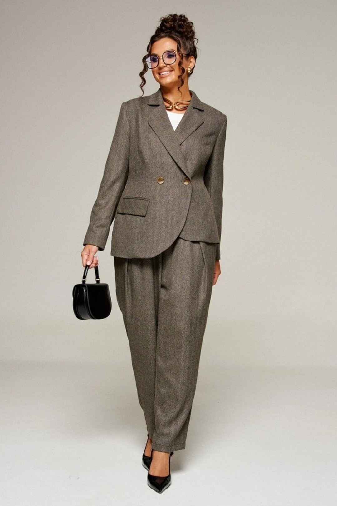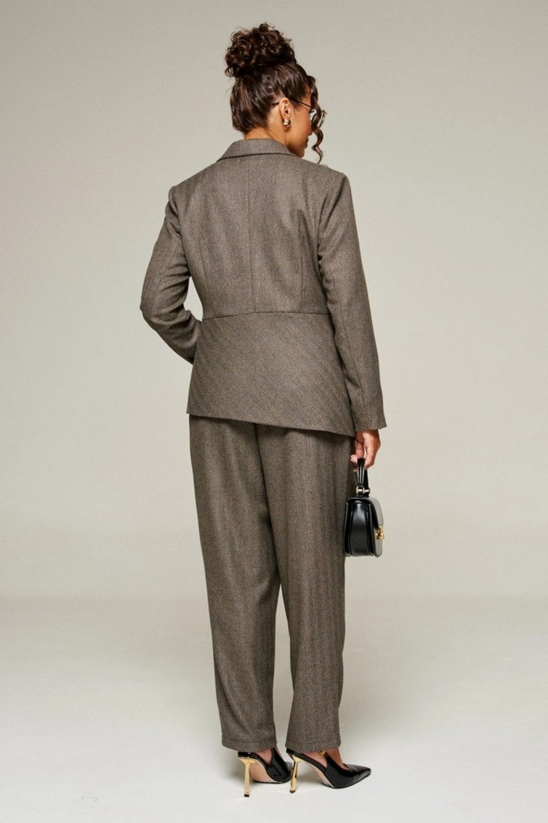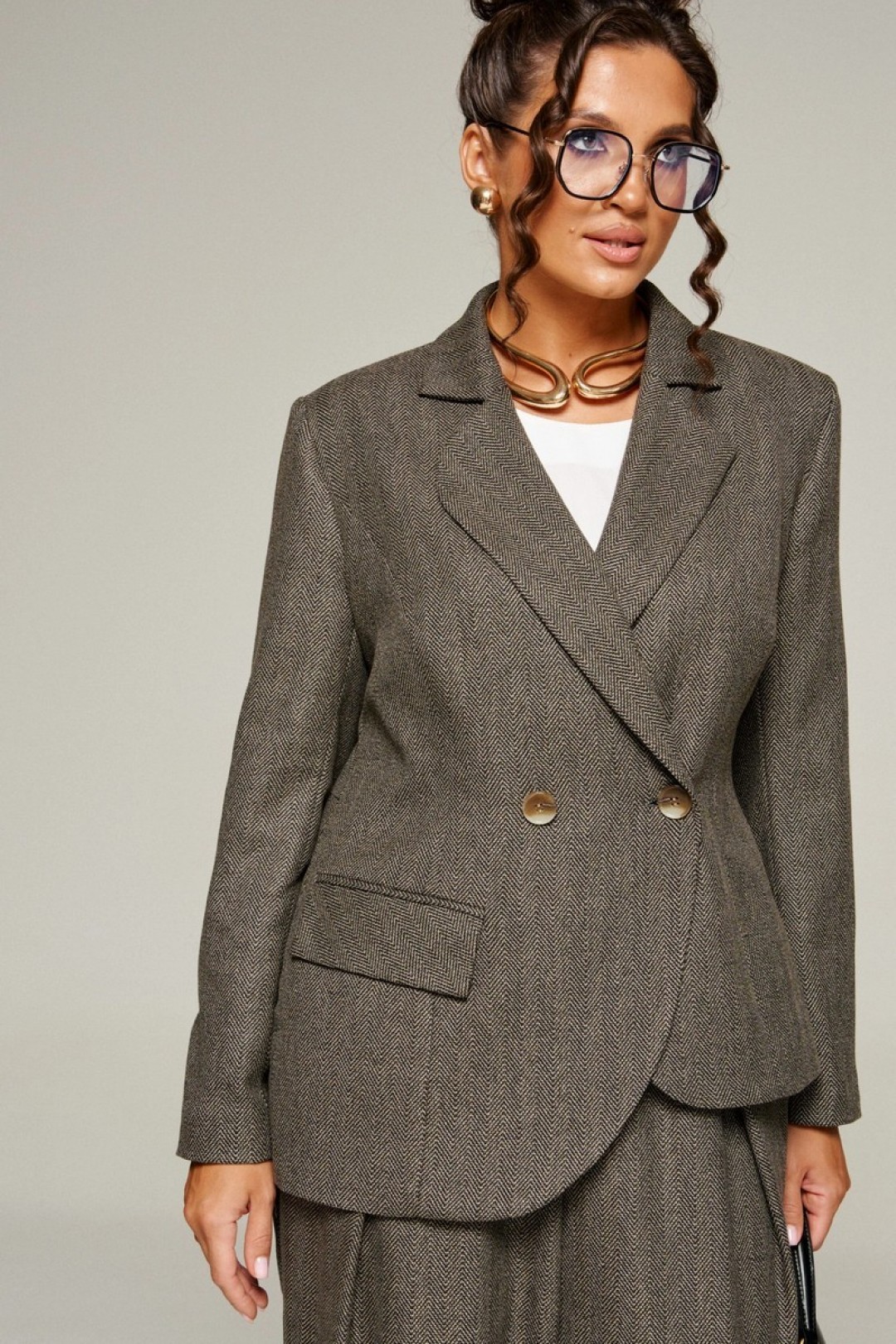 Жакет полуприлегающего силуэта, двубортный, асимметричный разноуровневый. На подкладке. Передняя часть из двух половинок, с вертикальными рельефами от проймы. На правой полочке расположен прорезной нижний карман с обтачкой и клапаном, вырез горловины оформлен пиджачным воротником с лацканом. Левая полочка укорочена и без дополнительных элементов. Спинка со средним швом и с вытачками от подреза на талии. Низ спинки асимметричный. Рукав втачной, двухшовный, длинный. Застёжка центральная на видимую и потайную петли и пуговицы. Низ борта округлый.