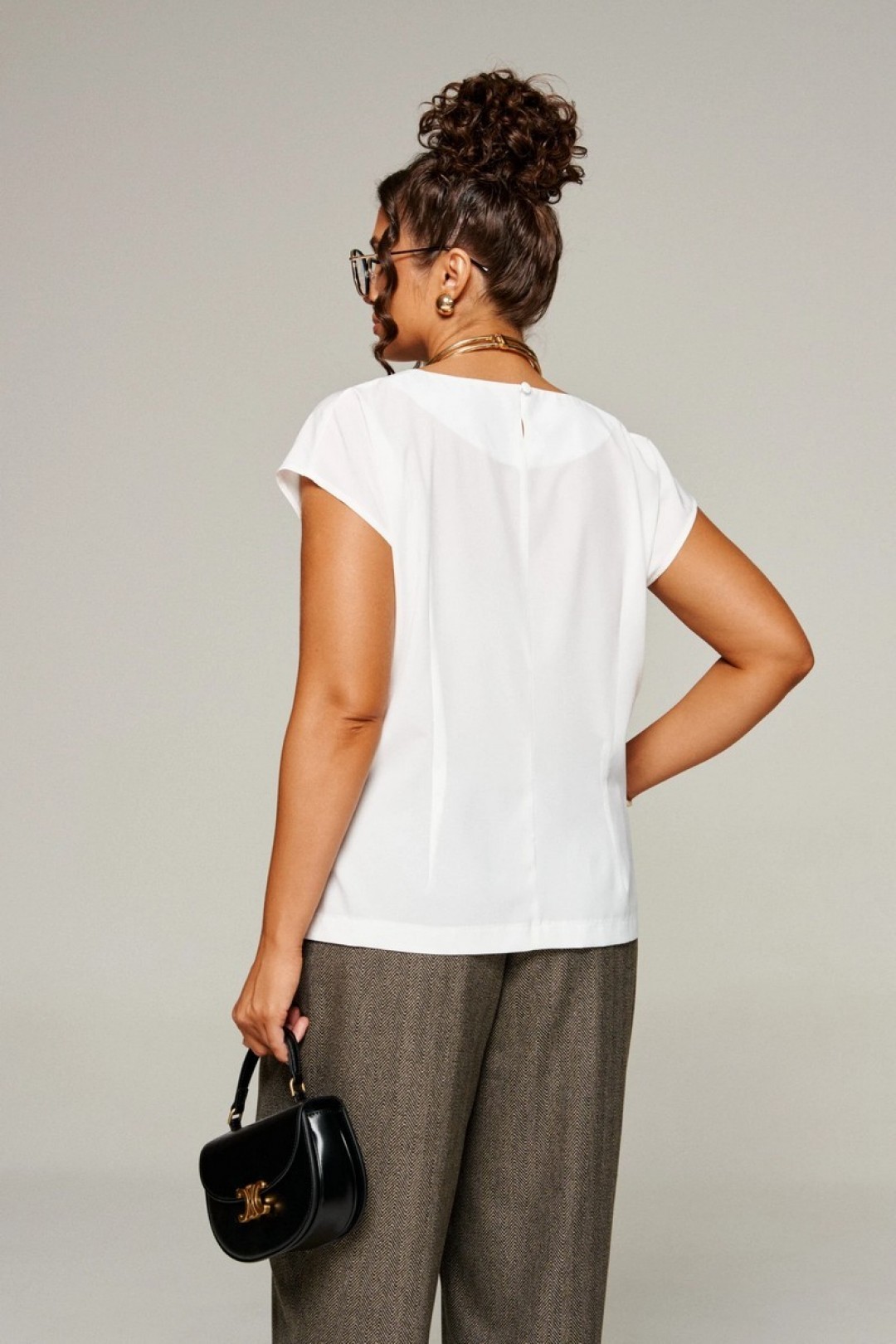 Блузка полуприлегающего силуэта. Горловина округлой формы. В боковых швах снизу разрезы. Перед цельный, с двумя нагрудными вытачками от бокового шва.
