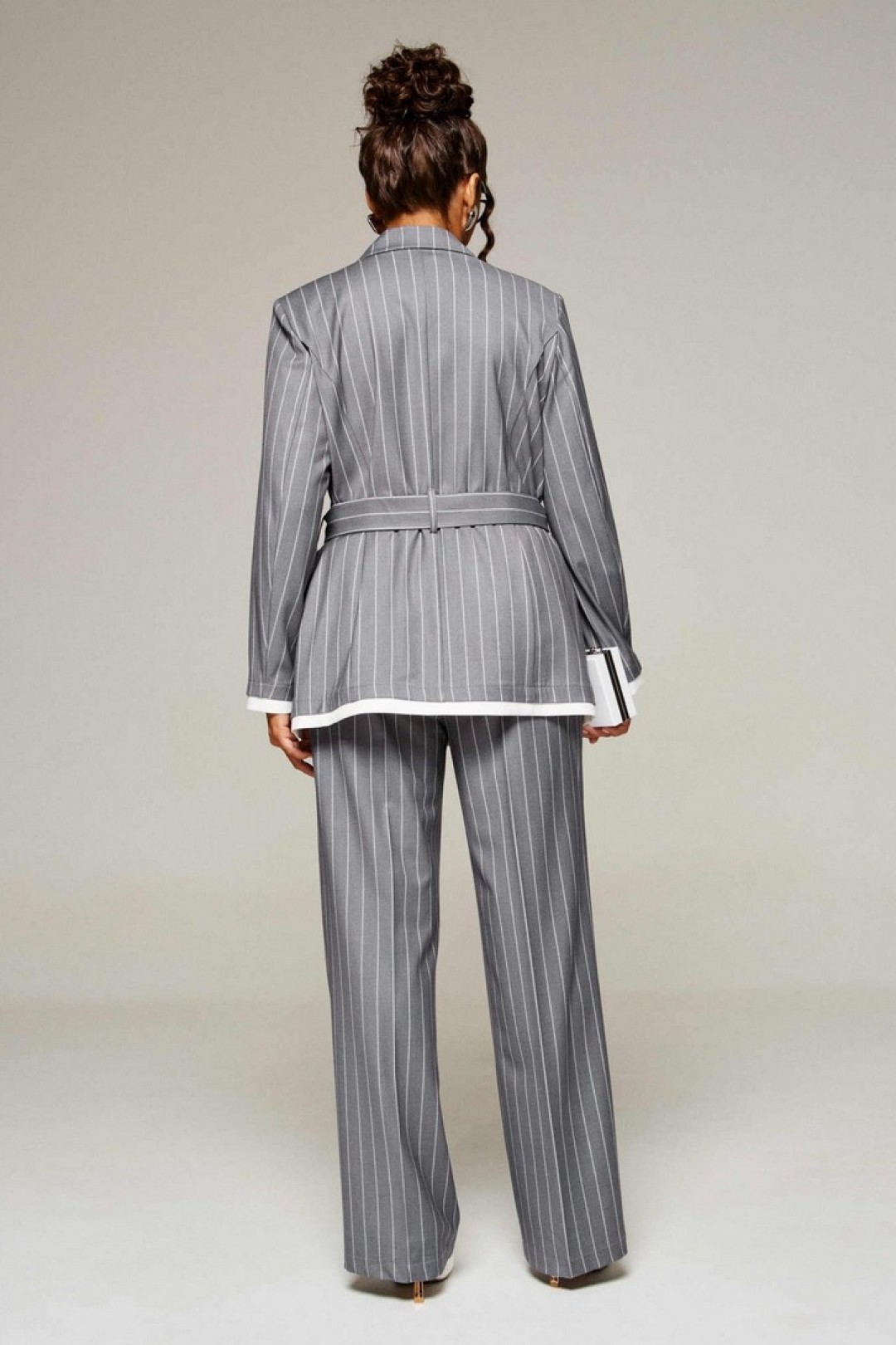 Жакет классический двубортный прямого силуэта длиной ниже бедер и с декоративными элементами в виде контрастных беек. К жакету прилагается пояс-завязка.