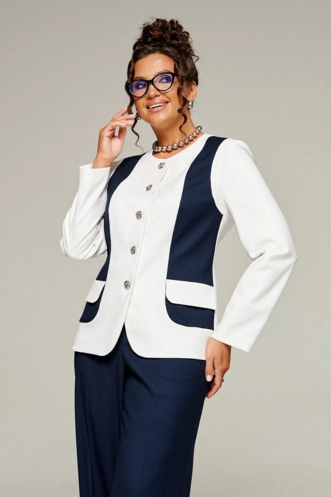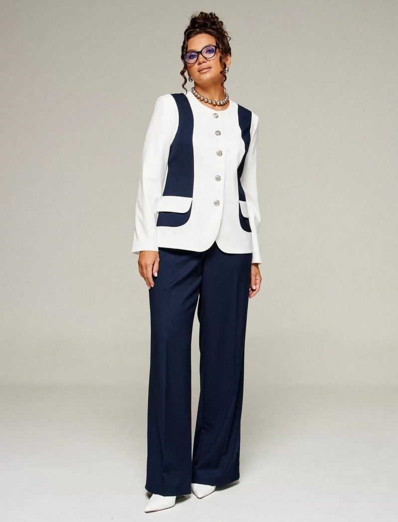 Костюм женский 2-ух предметный: жакет и брюки в деловом стиле. Выполнен из костюмного полотна с нежной фактурой в контрастном сочетании актуальных оттенков.