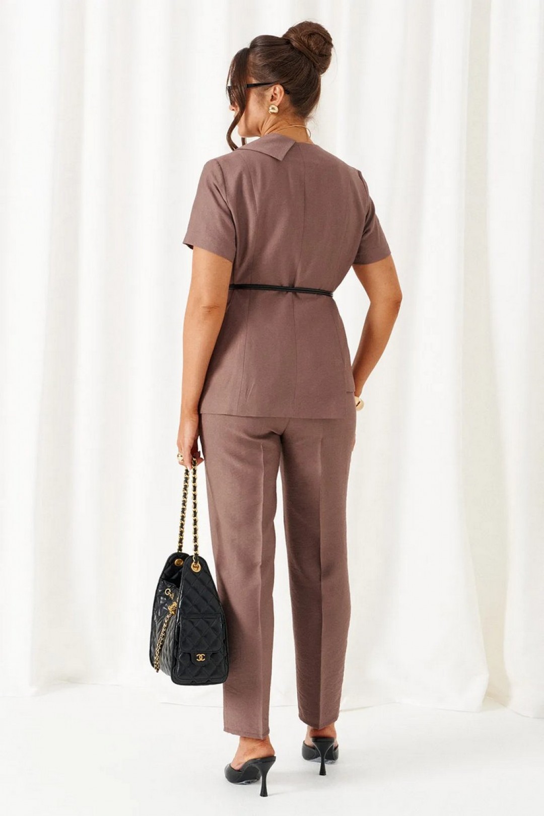 Брюки длинной до щиколотки, слегка заужены к низу. Посадка классическая.