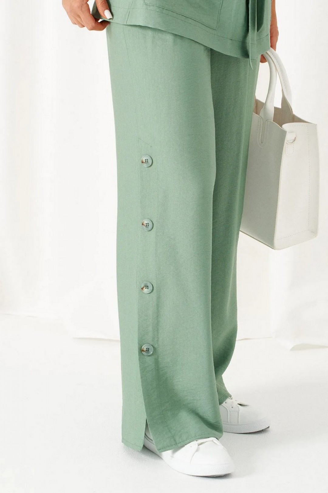В боковом шве на одной брючине ниже уровня колена выполнена шлица с закреплением на декоративные пуговицы, вторая брючина классического кроя.