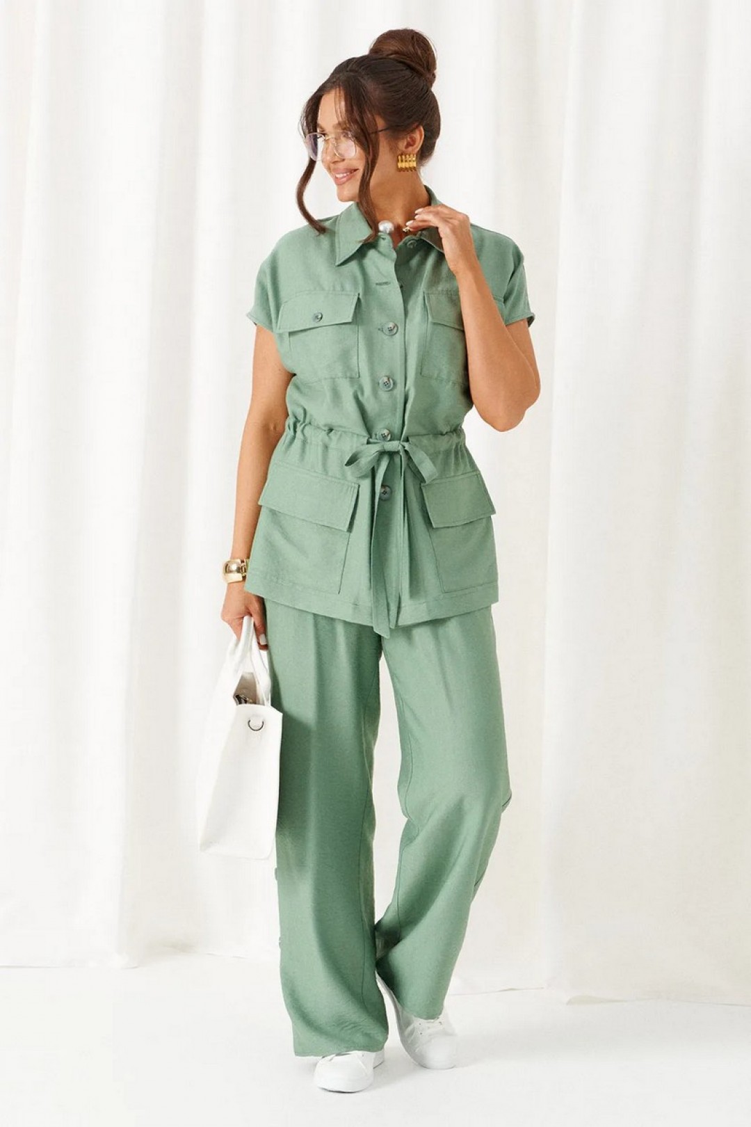Стильный костюм состоит из жакета-рубашки и брюк, выполнен из мягкой ткани с волокнами льна и вискозы, практичен в носке.