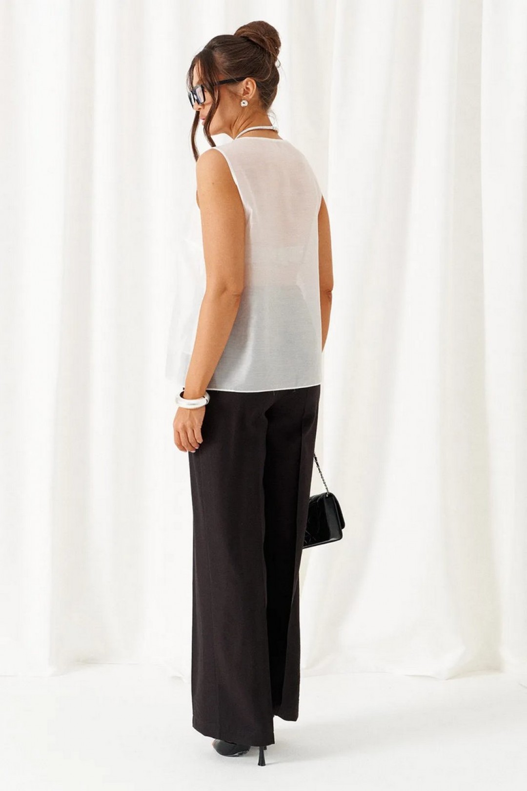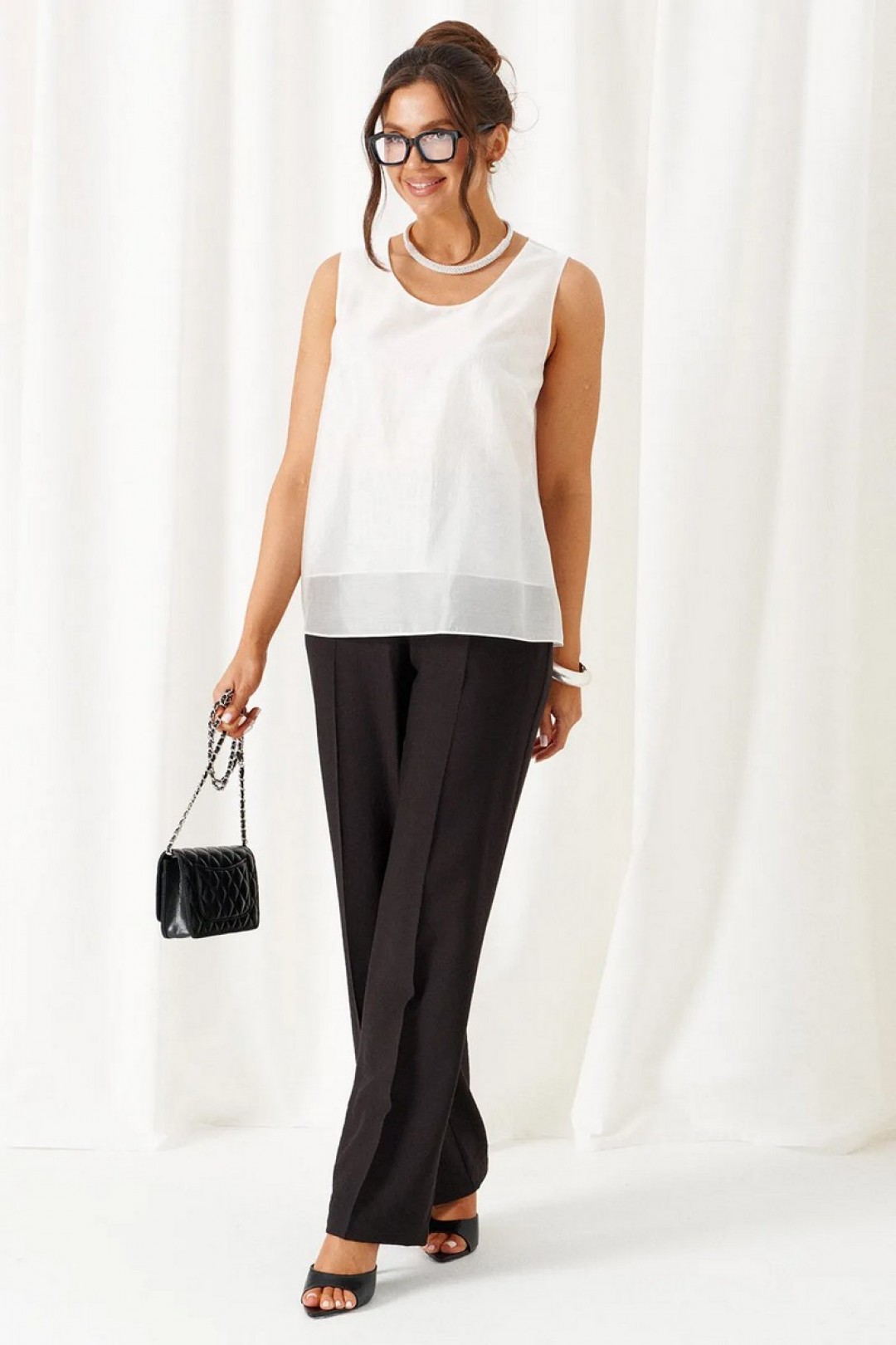 Брюки на поясе, в задней части которого для удобного прилегания по талии вставлена резинка. Топ полуприлегающего силуэта.