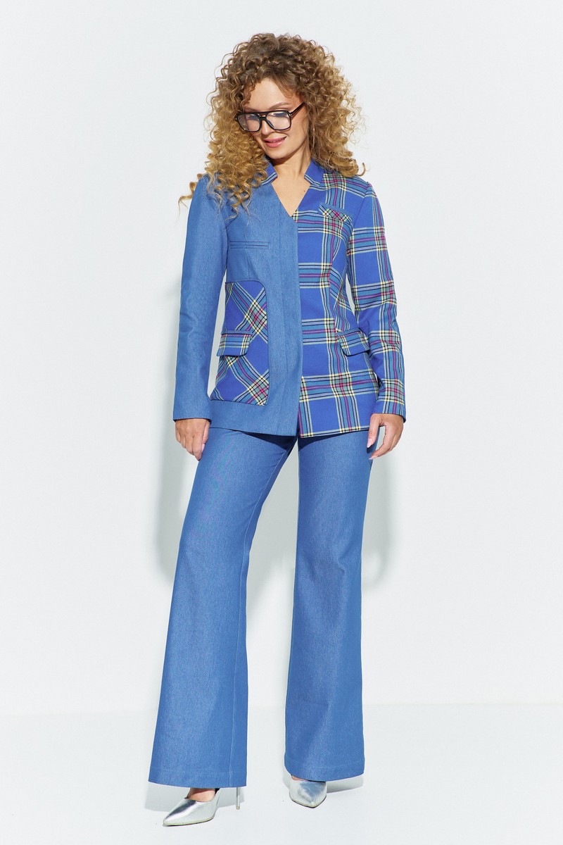 Костюм женский 2х-предметный, состоит из жакета и брюк. Жакет полуприлегающего силуэта выполнен из сочетания тканей Джинса и костюмной ткани, по полочке жакета расположена накладная деталь с функциональным прорезным карманом ""рамка"", и декоративные фальш-карманы в области груди. Рукав втачной длинный. Горловина обработана плоско лежащим воротником-стойкой. Застежка жакета - потайная (супатная) на петли-пуговицы. Жакет на полной подкладке. Брюки классического кроя, с небольшим клешем к низу, с высокой посадкой, выполнены из джинсовой ткани. Пояс в брюках втачной в боковых швах имеются карманы, застежка молния на гульфике и петля-пуговица.