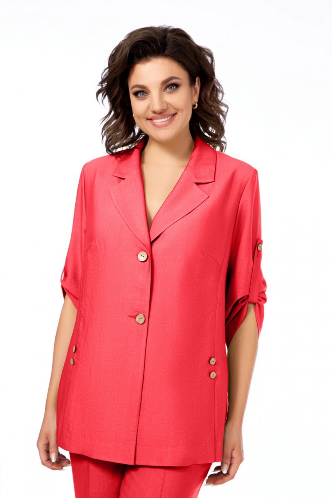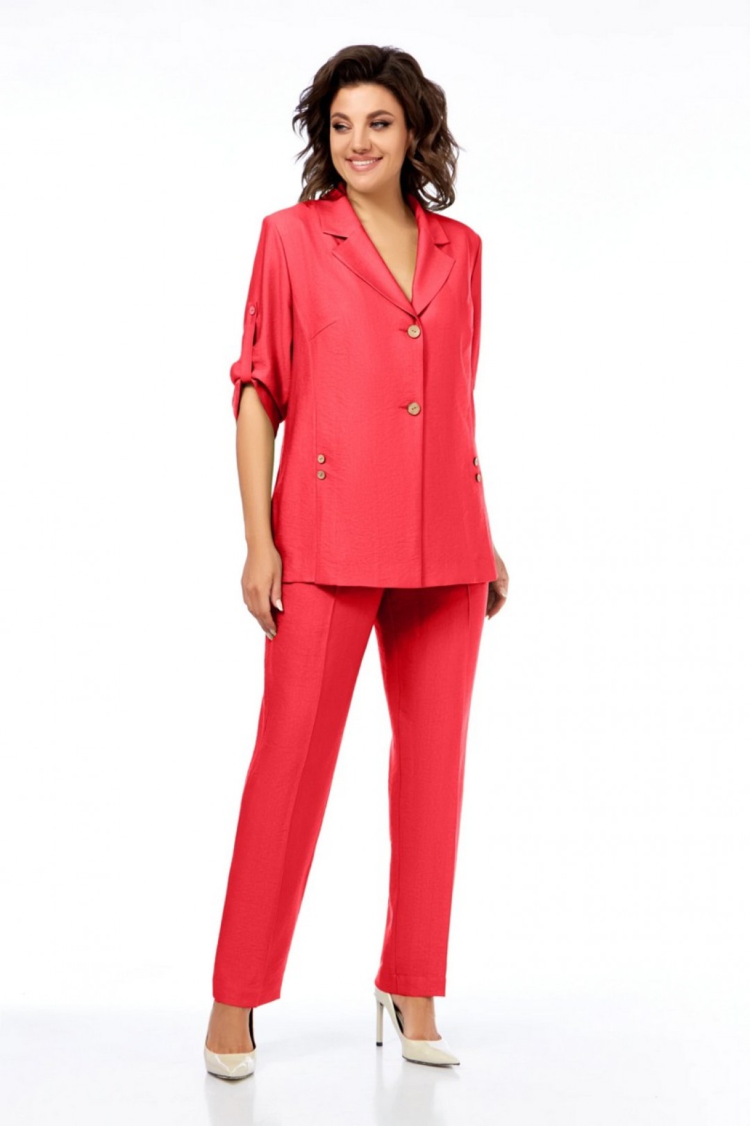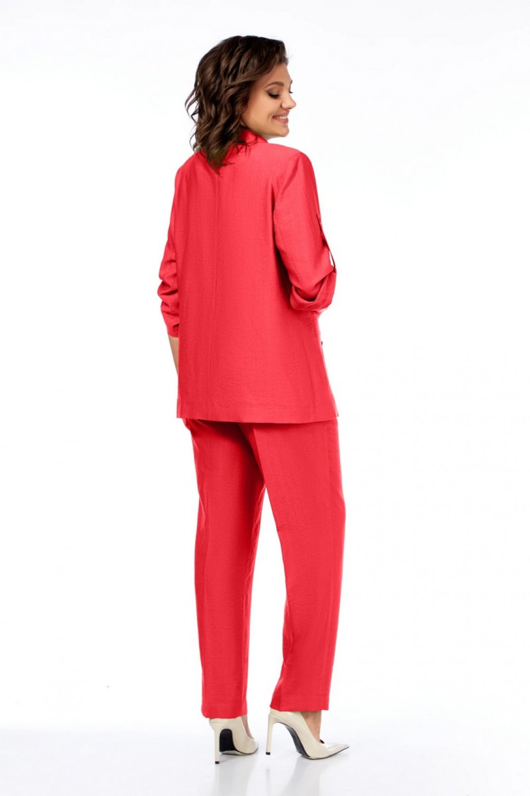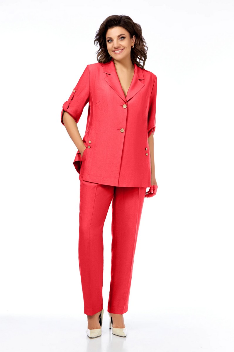 Жакет полуприлегающего силуэта, с пиджачным воротником, застежка на две пуговицы. На полочке шлицы с декоративными шлицами. Спинка со средним швом. Рукав втачной, длиной три четверти, регулируется патой. Брюки прямые, пояс на резинке, карманы в боковых швах.