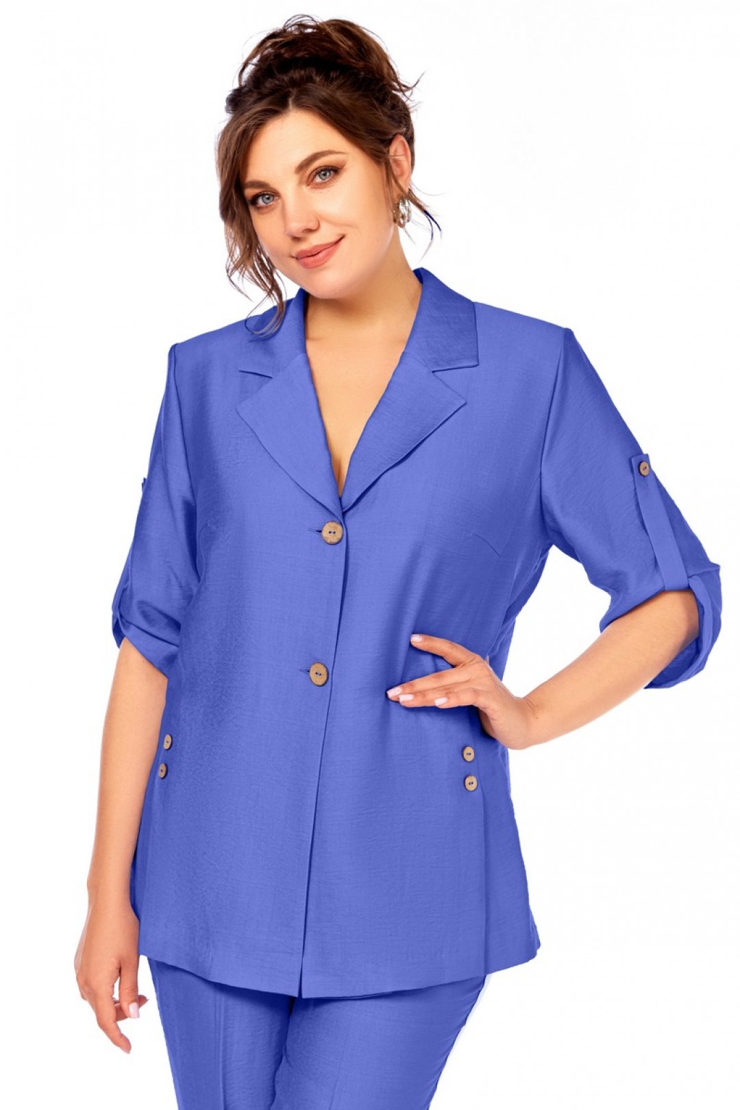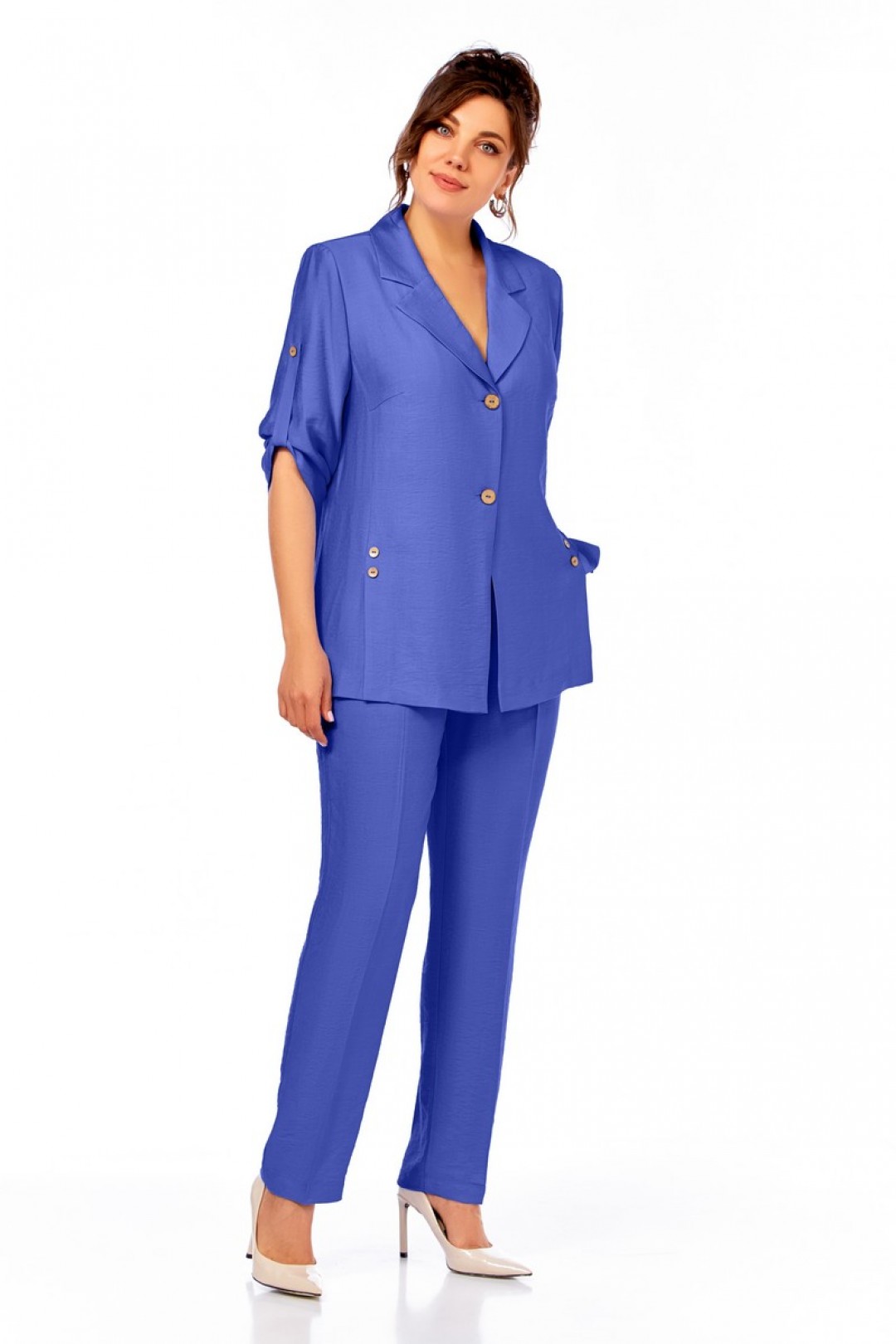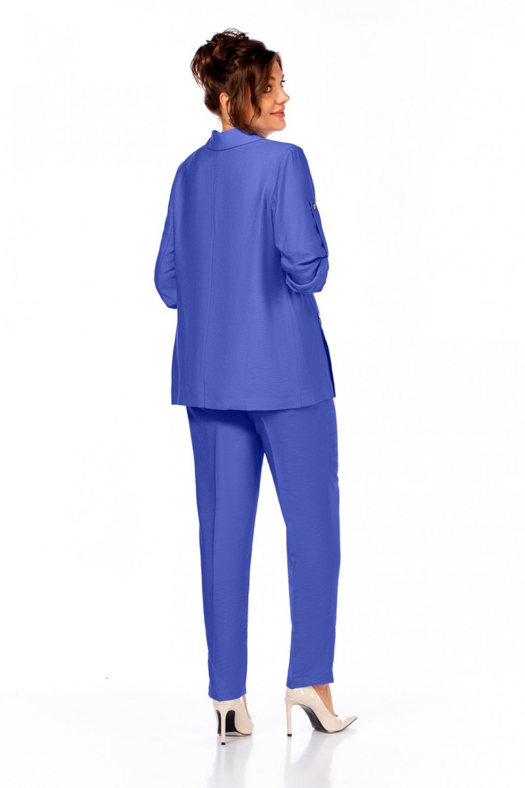 Жакет полуприлегающего силуэта, с пиджачным воротником, застежка на две пуговицы. На полочке шлицы с декоративными шлицами. Спинка со средним швом. Рукав втачной, длиной три четверти, регулируется патой. Брюки прямые, пояс на резинке, карманы в боковых швах.