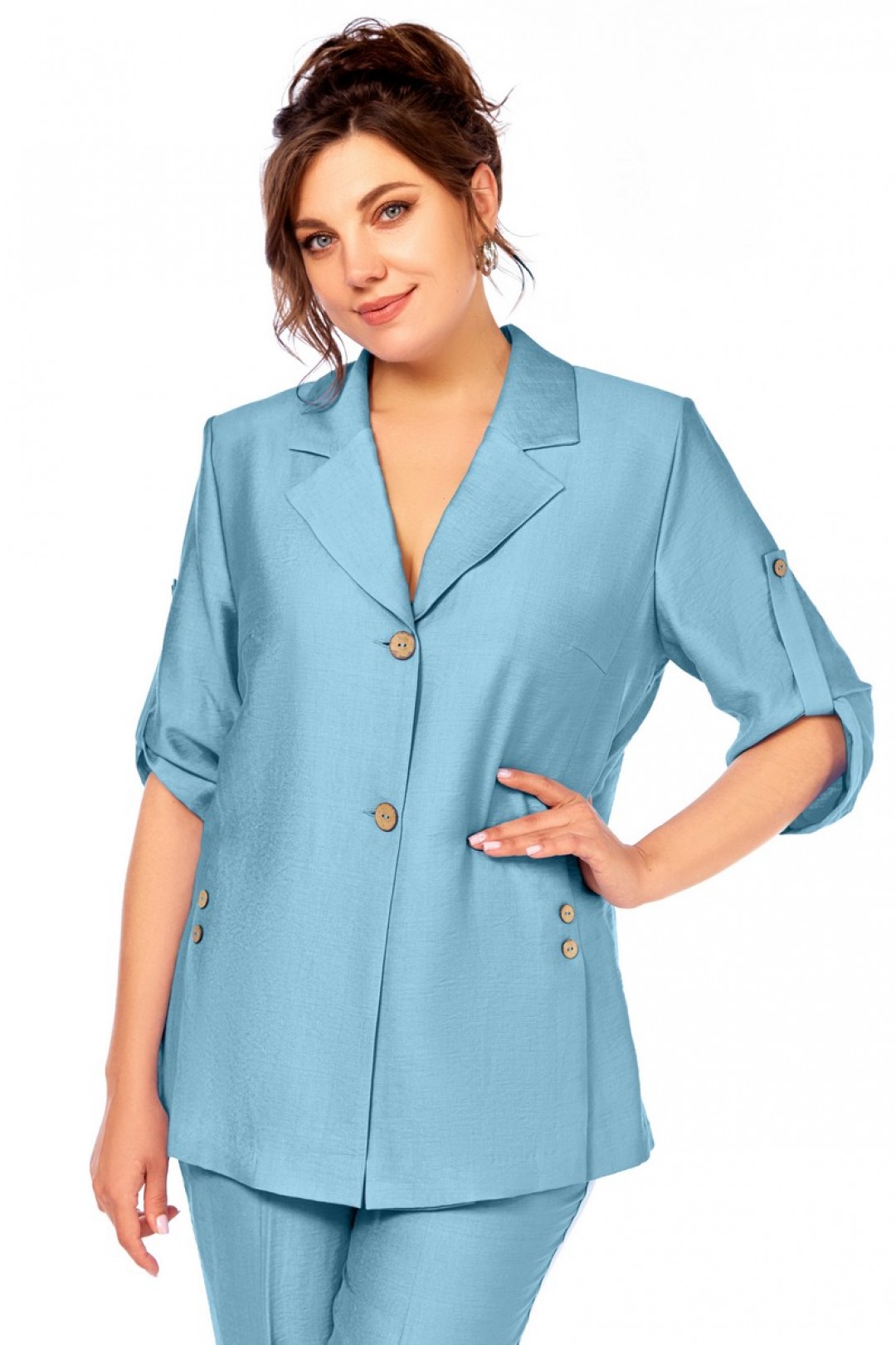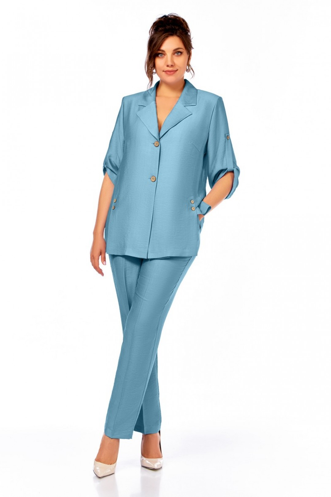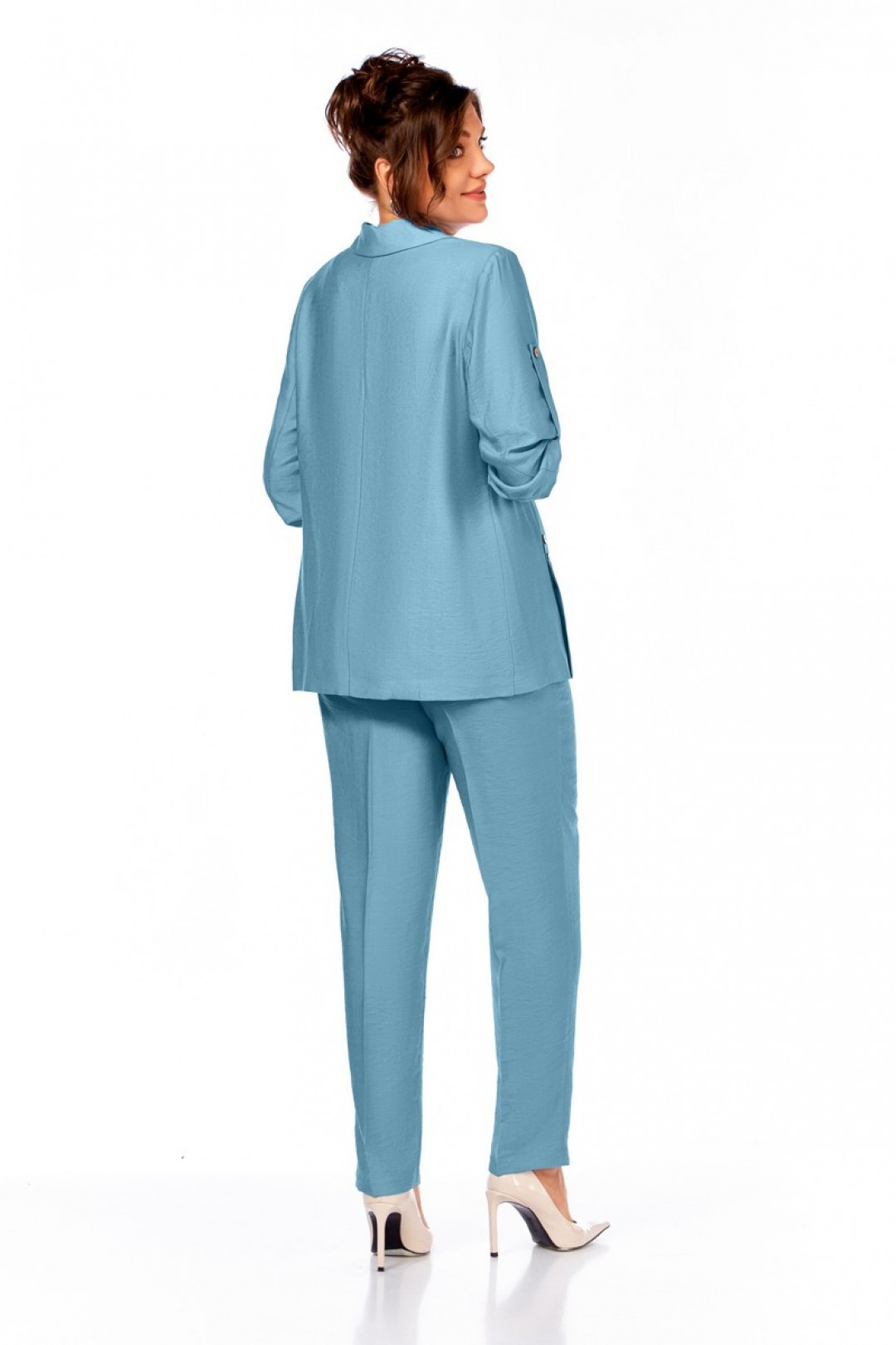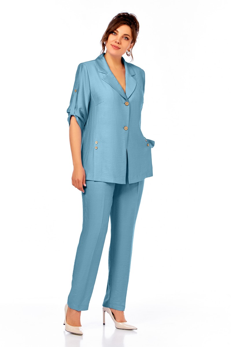 Жакет полуприлегающего силуэта, с пиджачным воротником, застежка на две пуговицы. На полочке шлицы с декоративными шлицами. Спинка со средним швом. Рукав втачной, длиной три четверти, регулируется патой. Брюки прямые, пояс на резинке, карманы в боковых швах.