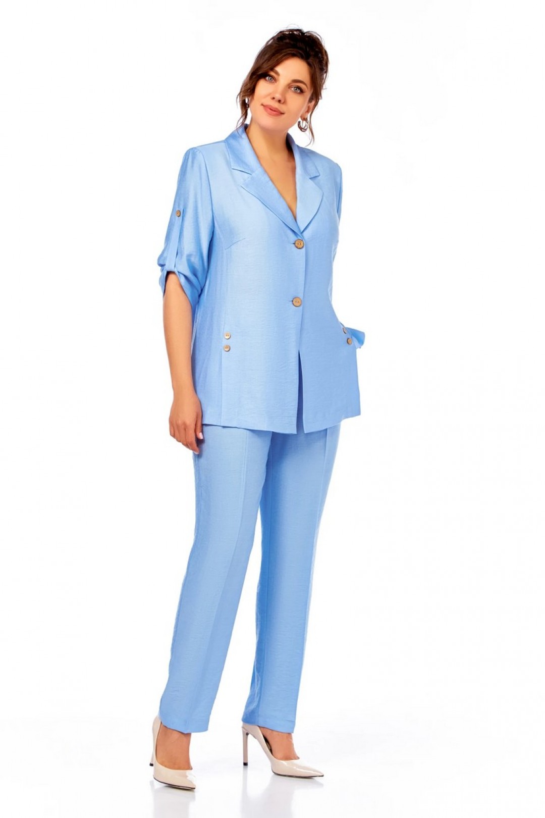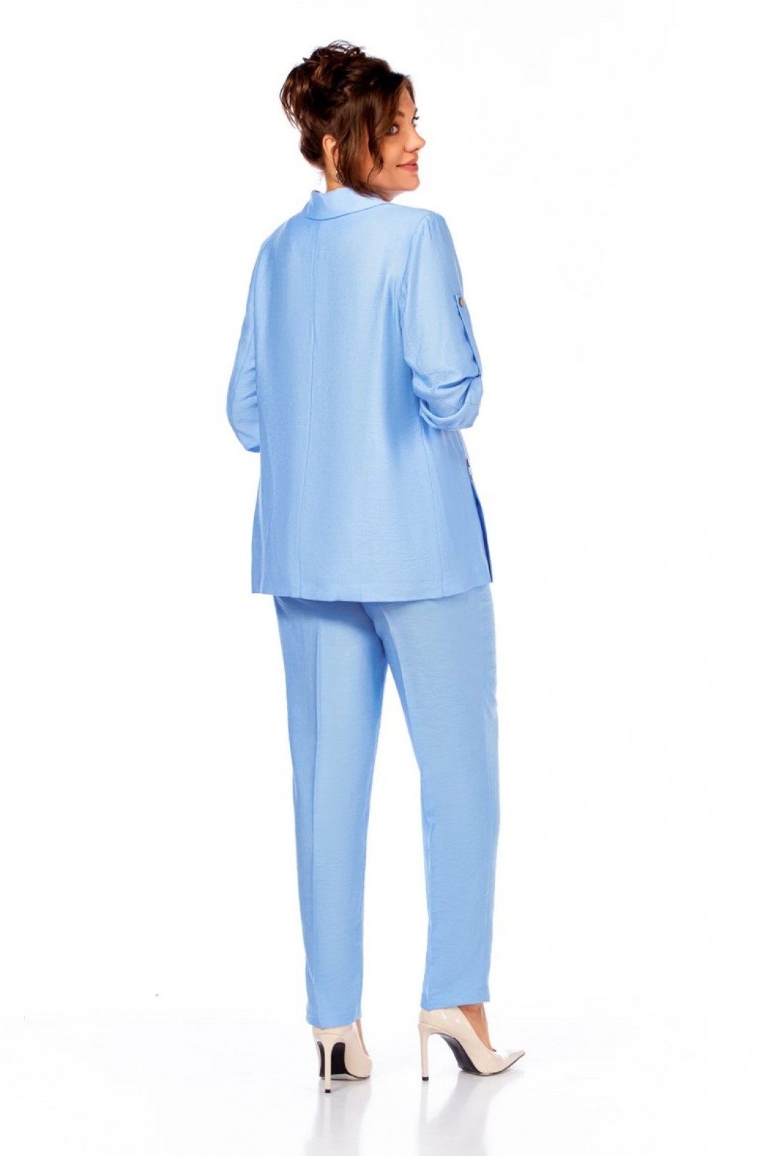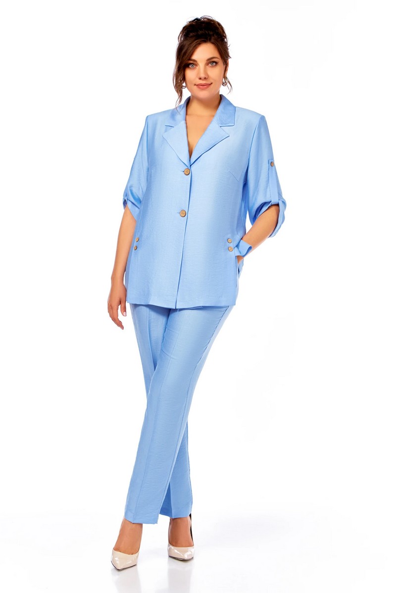 Жакет полуприлегающего силуэта, с пиджачным воротником, застежка на две пуговицы. На полочке шлицы с декоративными шлицами. Спинка со средним швом. Рукав втачной, длиной три четверти, регулируется патой. Брюки прямые, пояс на резинке, карманы в боковых швах.