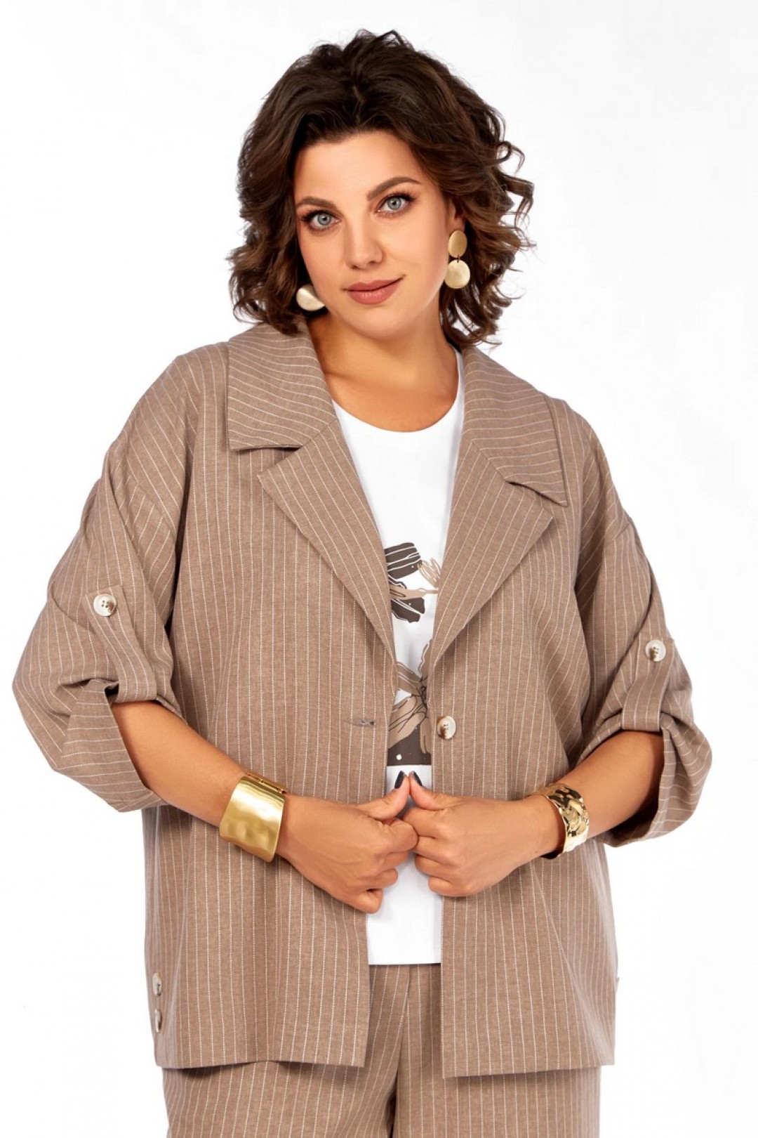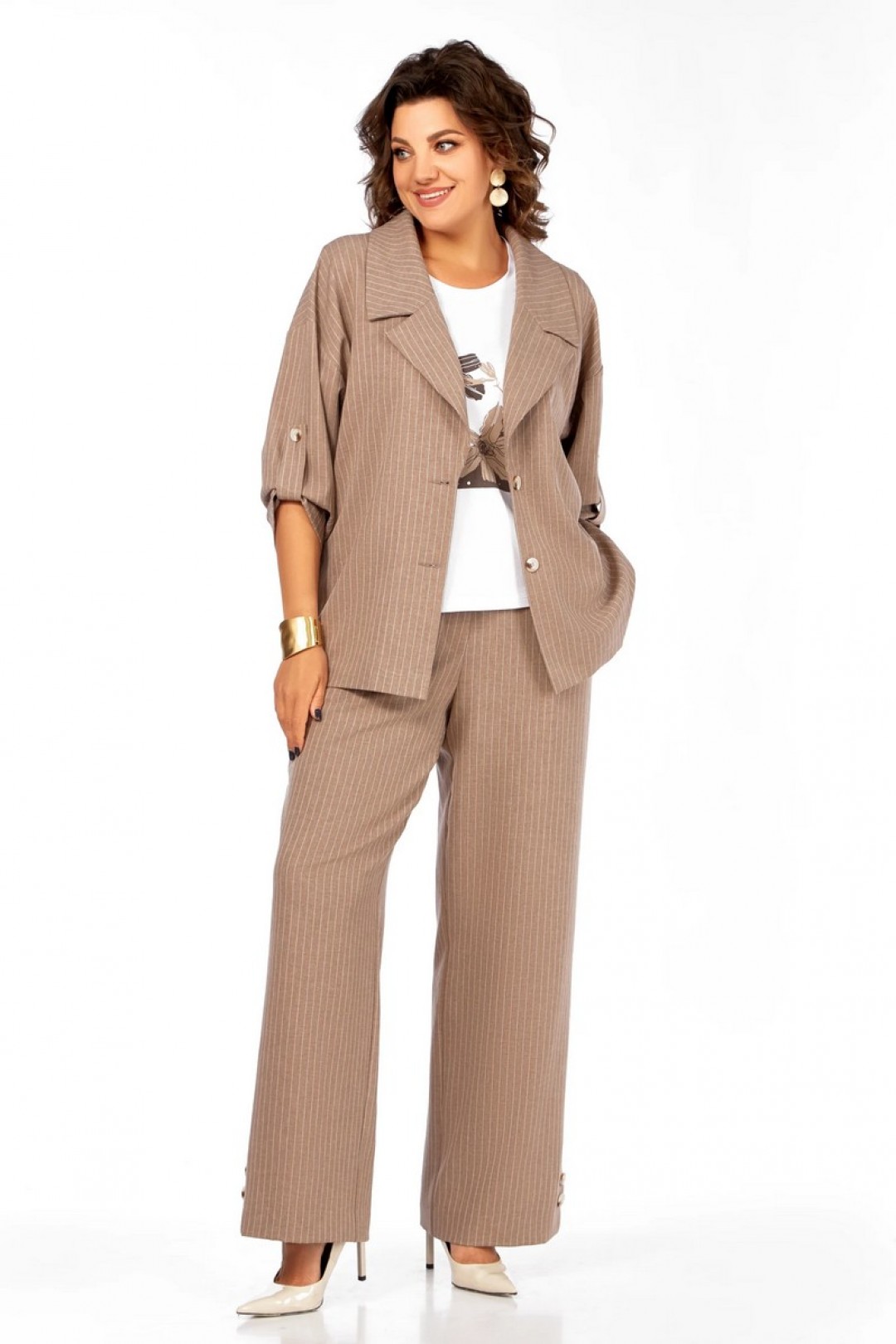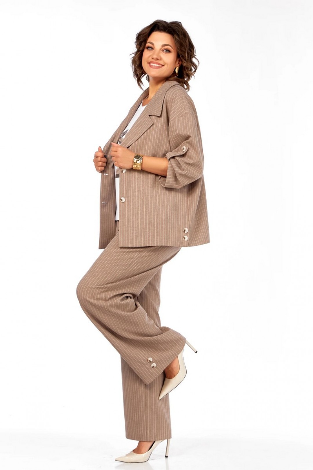 Стильный комплект 3-ка. Жакет прямого силуэта, воротник с лацканали, застежка на две пуговицы, в боковых швах имитация шлиц с двумя пуговицами. Рукав спущенного кроя, три-четверти с патой на 1 пуговицу. Брюки свободного кроя на резинке, карманы в боковых швах, по низу имитации шлиц и две пуговицы. Блуза из креповой ткани с интересным принтом.