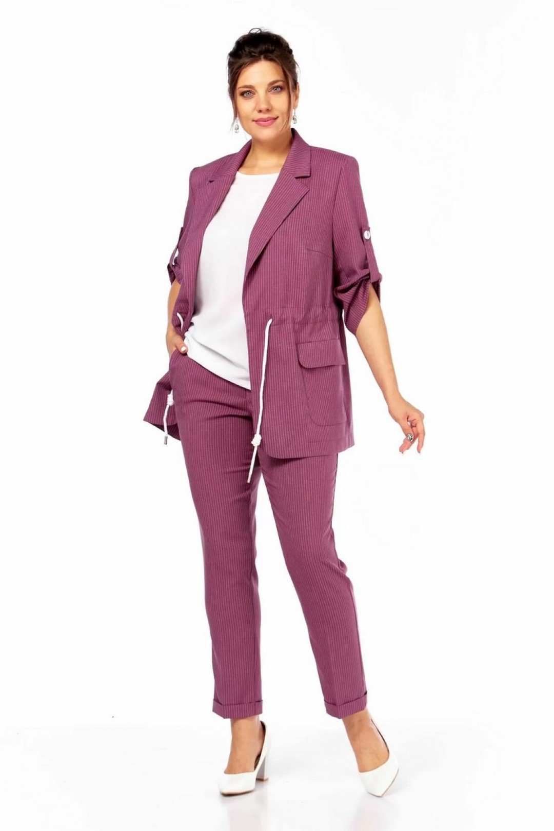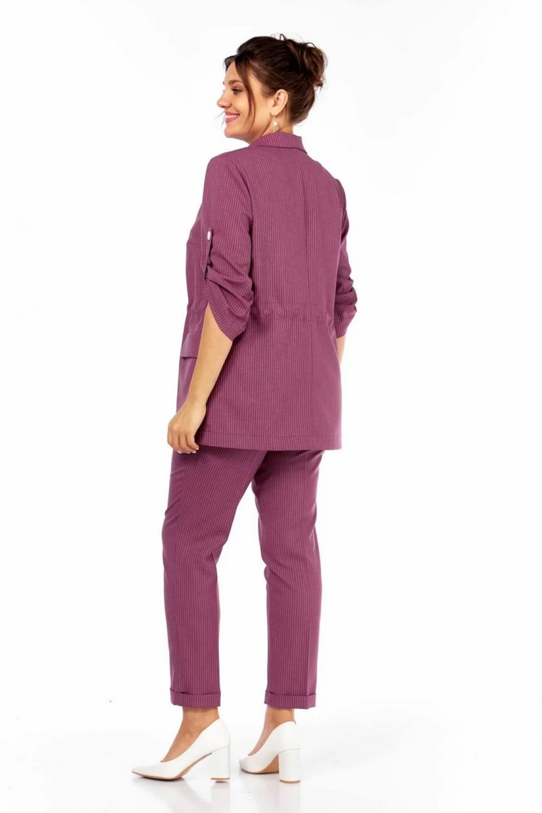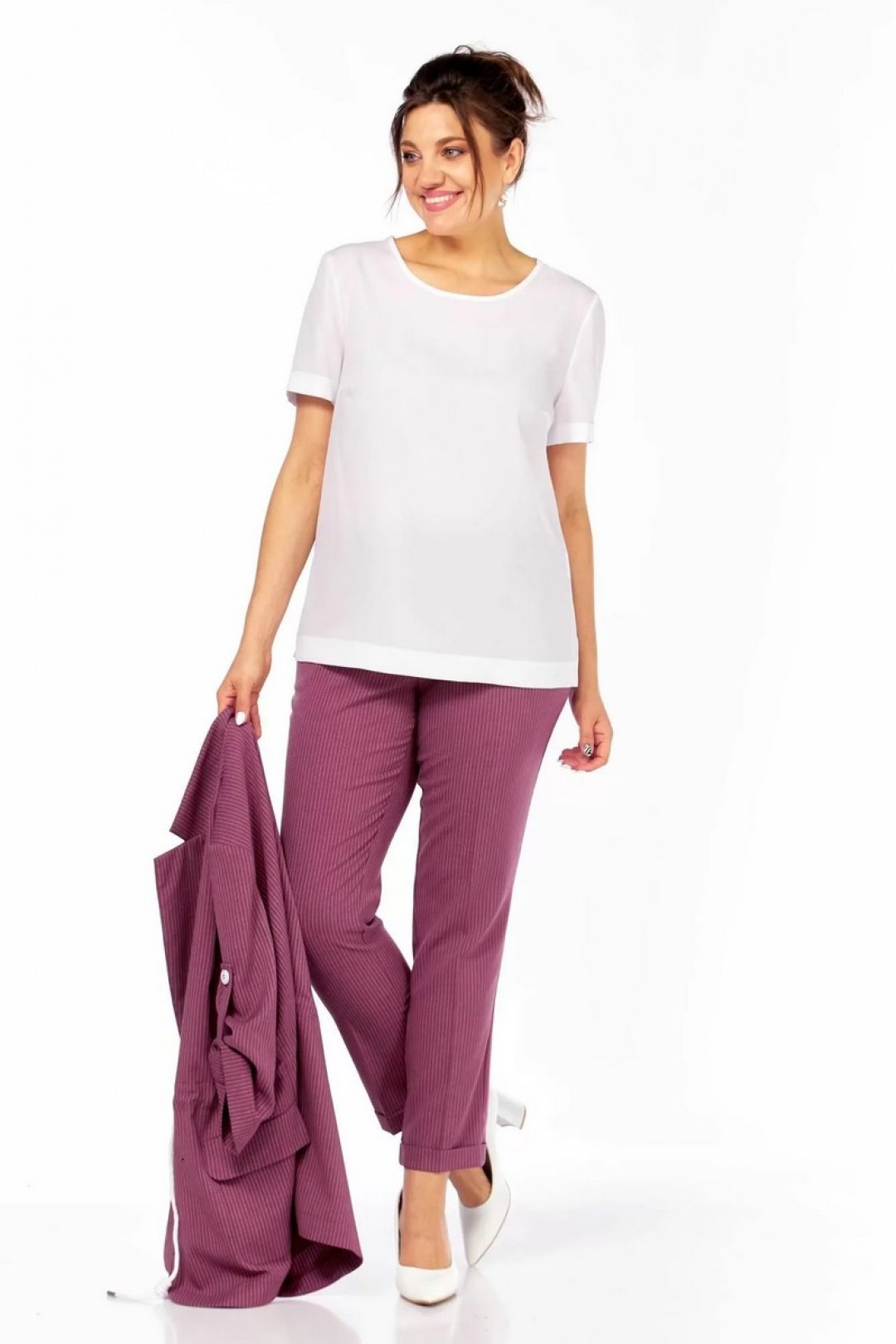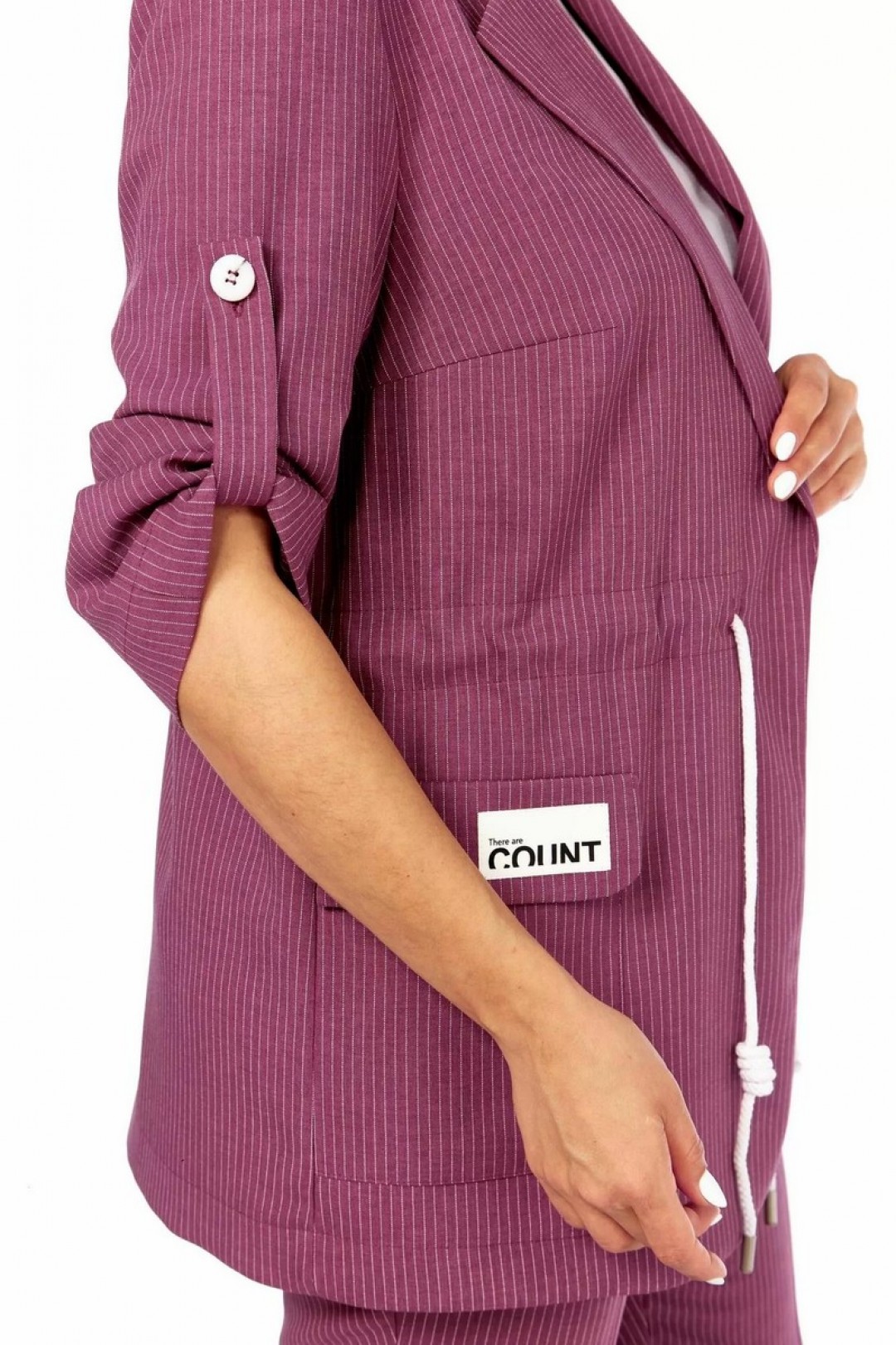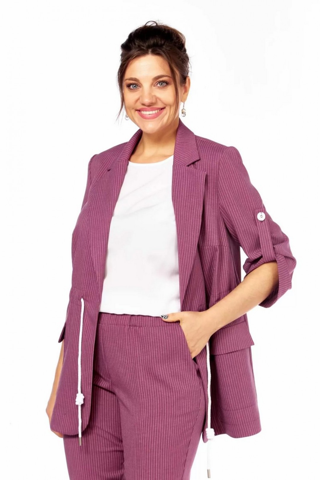 Летний комплект состоящий из жакета, брюк и блузы. Жакет прямого силуэта с пиджачным воротником, без подкладки и без застежки. По бокам накладные карманы с клапанами. На правом клапане декоративная нашивка. По талии кулиска. Рукава втачные, длиной три четверти с патами. Брюки прямые, зауженные к низу, с отворотом, пояс притачной на эластичной тесьме с кулиской, боковые карманы . Блуза прямого силуэта, рукав короткий.