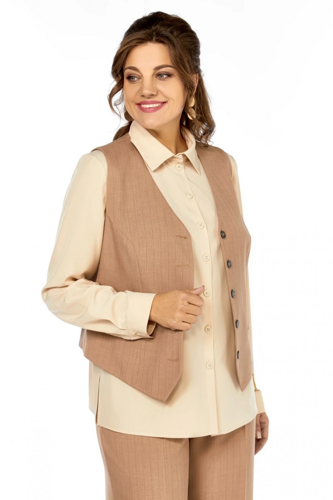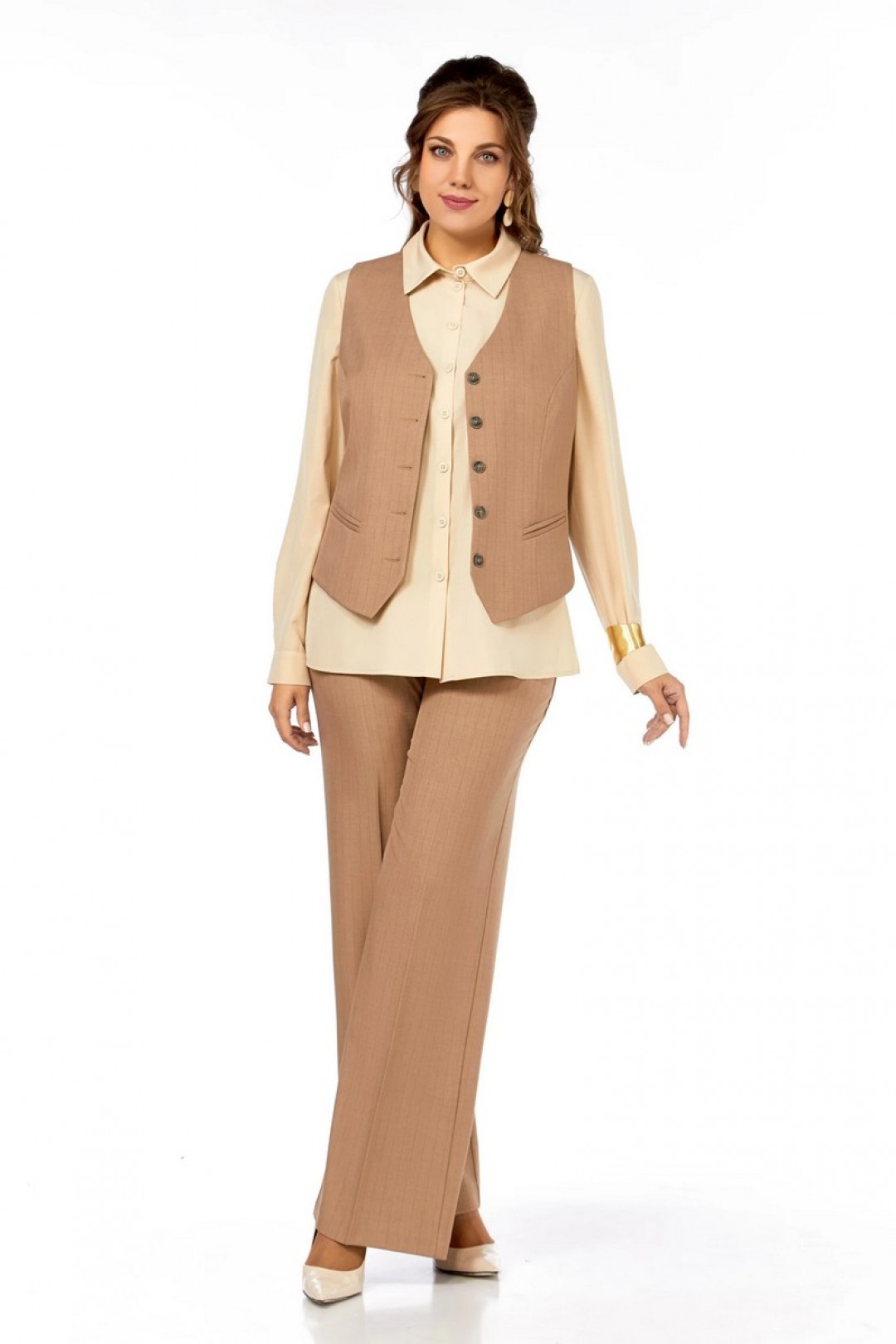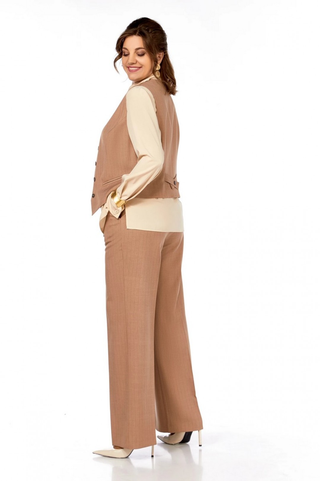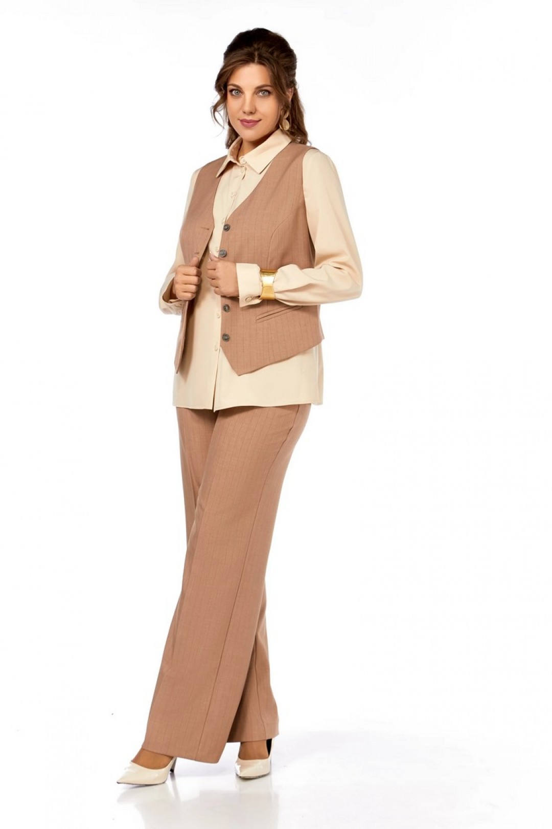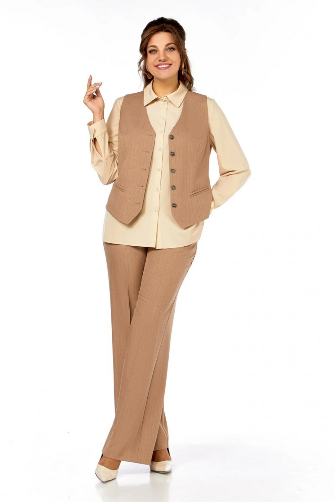 Полуприлегающий силуэт, жилет с V-образной формой горловины, на переде рельефы от проймы, имитация карманов в рамку, по спинке хлястик с пуговицей. Блузка с рубашечным воротником и застежкой на петли и пуговицы, нагрудные вытачки, рукав одношовный с манжетой. Разрезы в боковых швах. Брюки прямые, с карманами. Пояс по спинке на резинке. На переде и спинке заутюжены стрелки.
