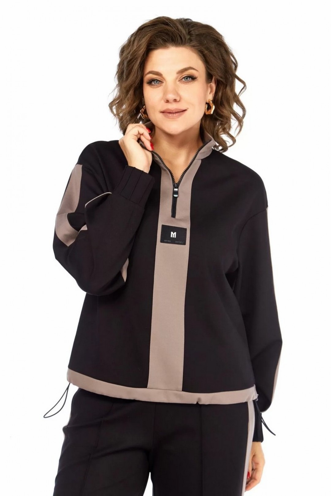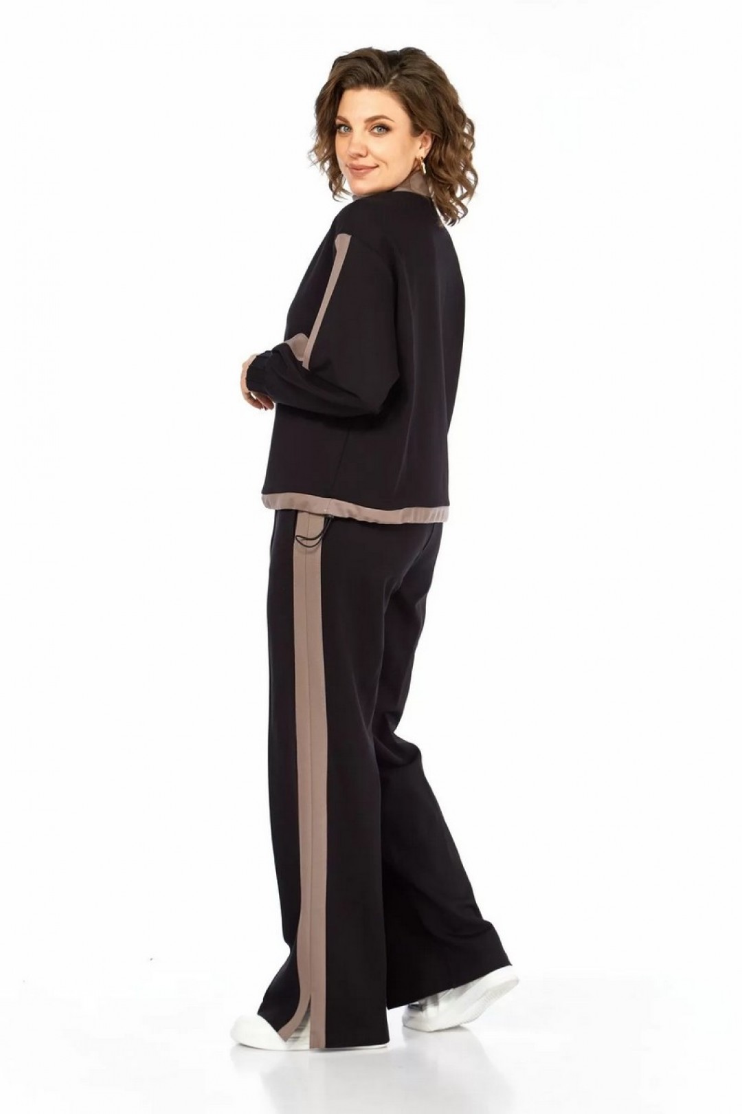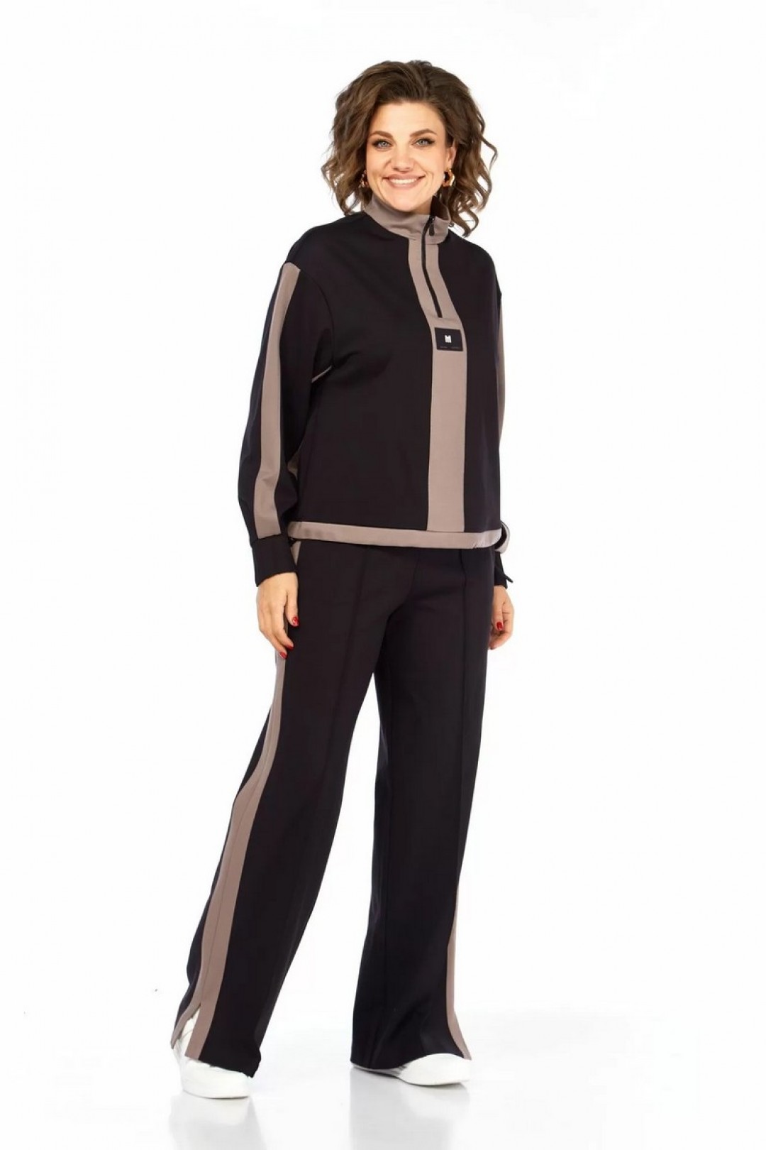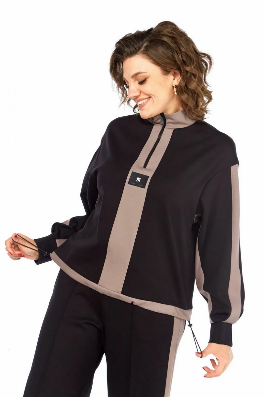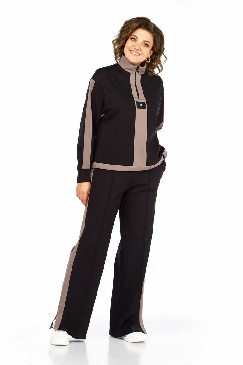 Костюм женский спорт-шик. Джемпер прямого силуэта, со спущенным рукавом. Воротник-стойка из отделочной ткани, планка по центру, в которой вставлена молния, декаротивная нашивка. Рукав с планками из отделочной ткани и декоративные защипы на манжетах. По низу кулиска с фиксаторами. Брюки прямые, по переду застрочены стрелки, по внешней стороне отделочные детали с разрезами по низу. Карманы в боковых швах, пояс на резинке.