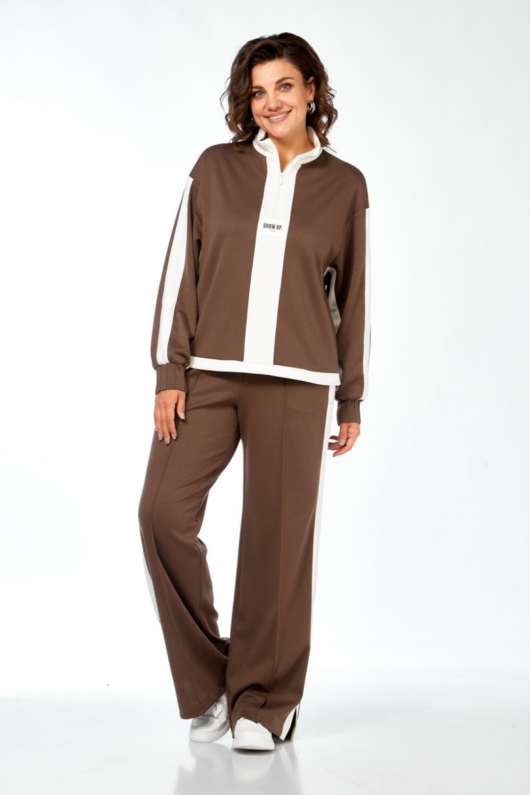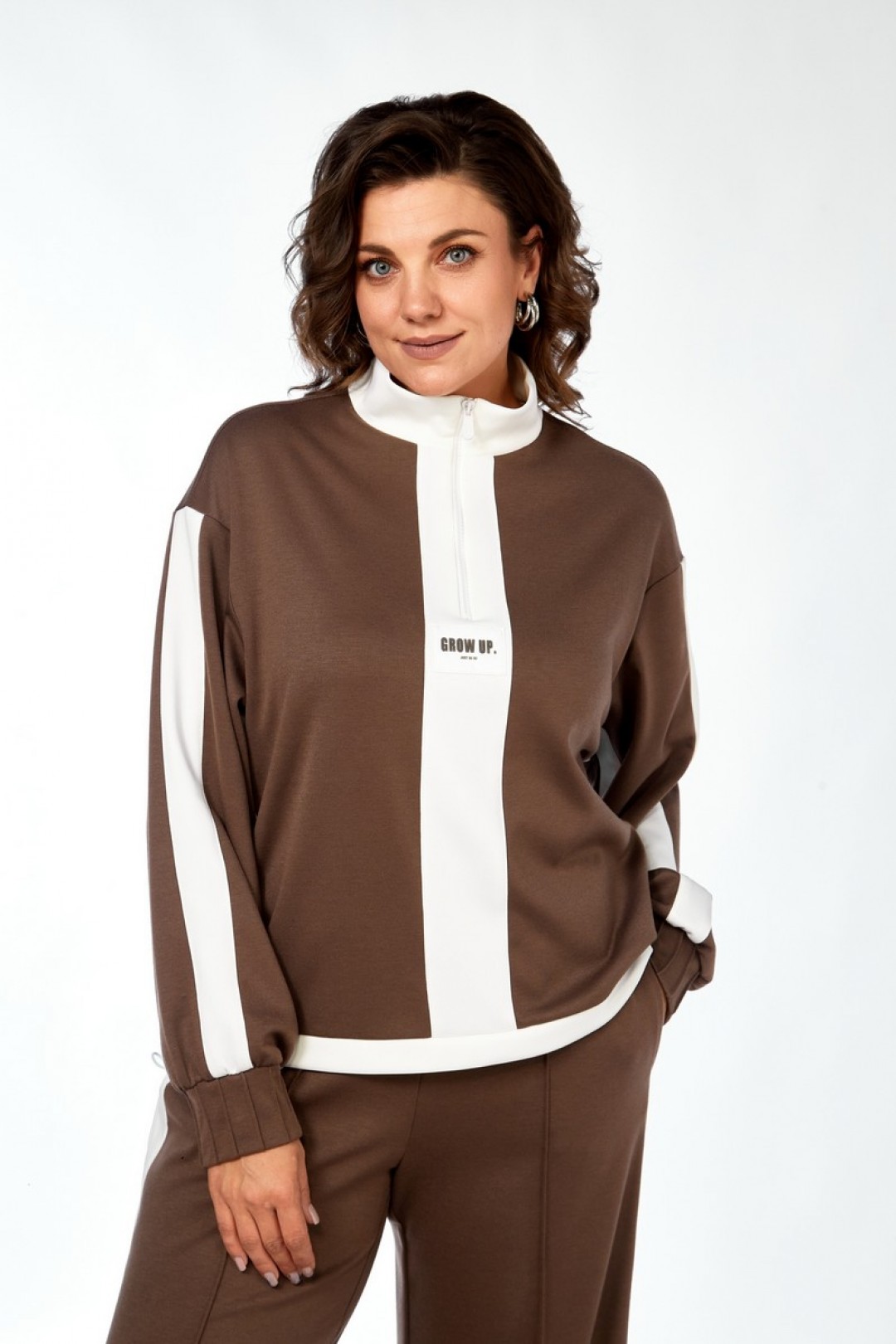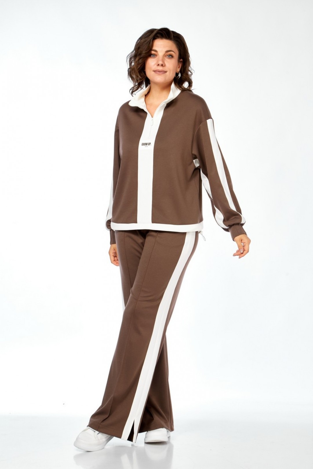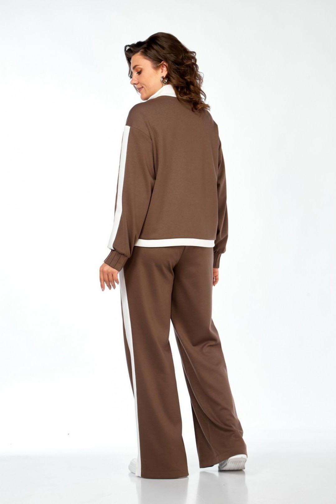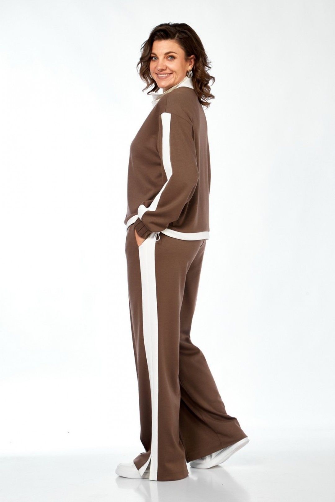Костюм женский спорт-шик. Джемпер прямого силуэта, со спущенным рукавом. Воротник-стойка из отделочной ткани, планка по центру, в которой вставлена молния, декаротивная нашивка. Рукав с планками из отделочной ткани и декоративные защипы на манжетах. По низу кулиска с фиксаторами. Брюки прямые, по переду застрочены стрелки, по внешней стороне отделочные детали с разрезами по низу. Карманы в боковых швах, пояс на резинке.
