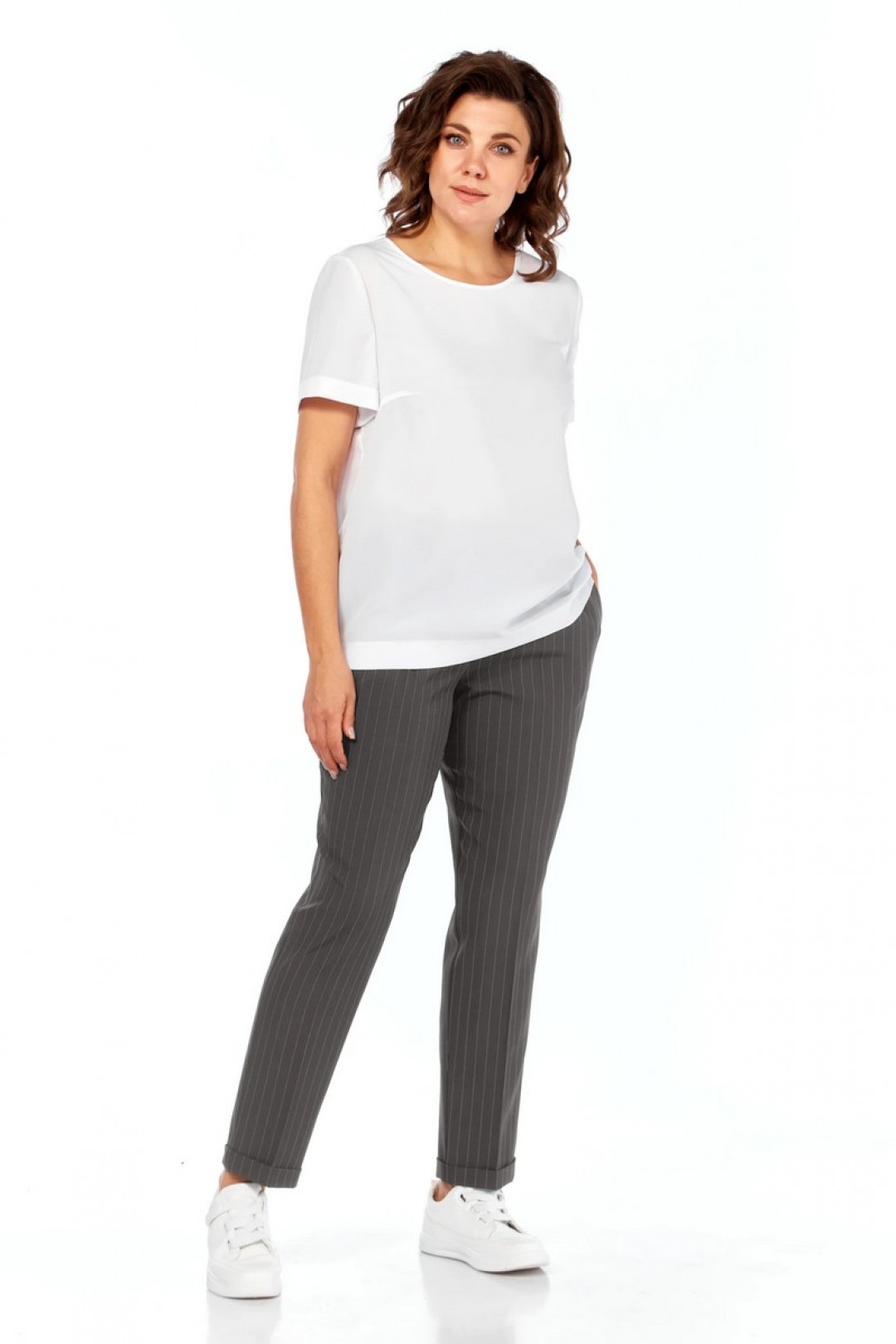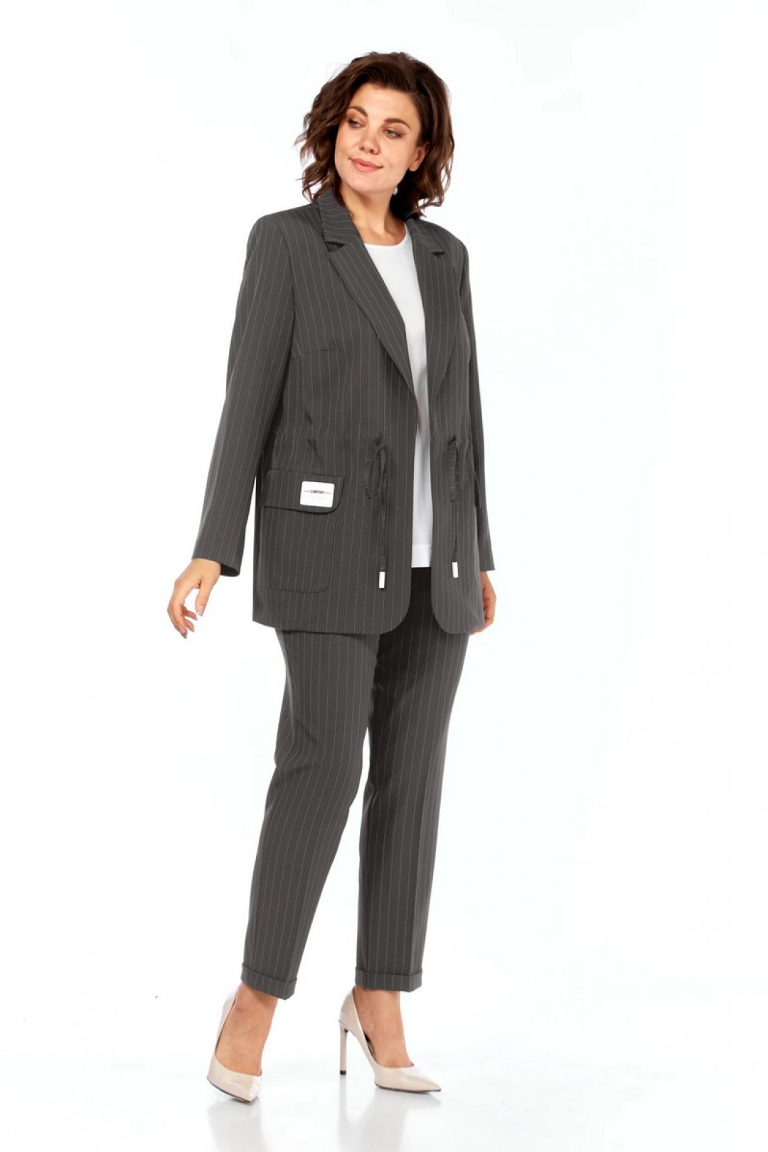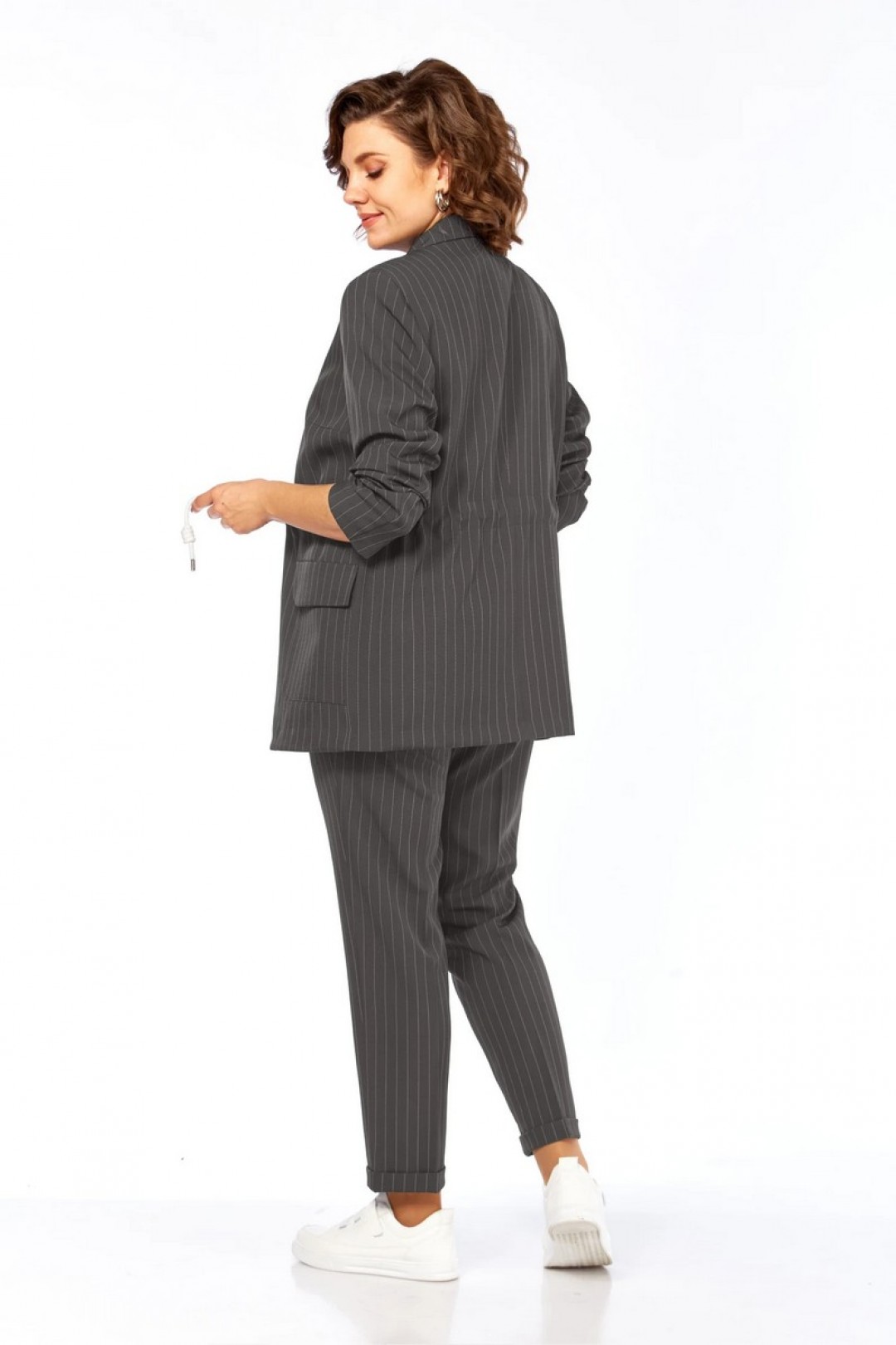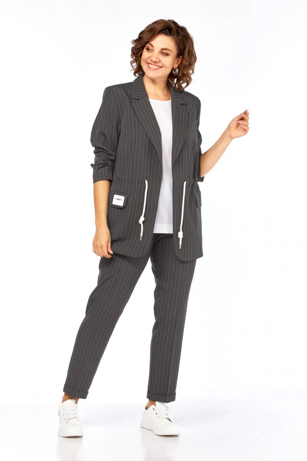 Жакет прямого силуэта с пиджачным воротником, подкладка на полочке, без застежки. По бокам накладные карманы с клапанами. На правом клапане декоративная нашивка. По талии кулиска. Рукава втачные, длиной три четверти с патами. Брюки прямые, зауженные к низу, с отворотом, пояс притачной на эластичной тесьме с кулиской, боковые карманы . Блуза прямого силуэта, рукав короткий. В комплекте два шнурка белый и в тон костюма.