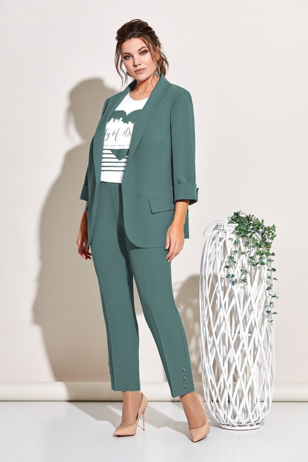 Стильный комплект, состоящий из жакета, брюк и блузы.