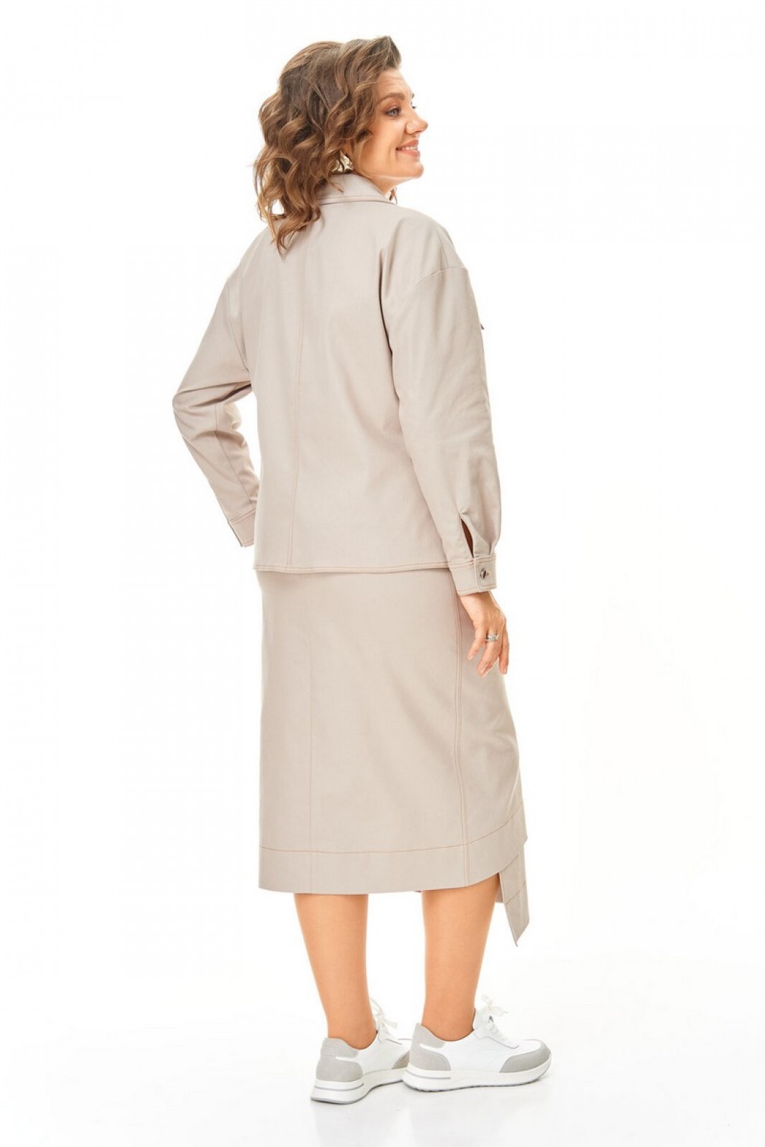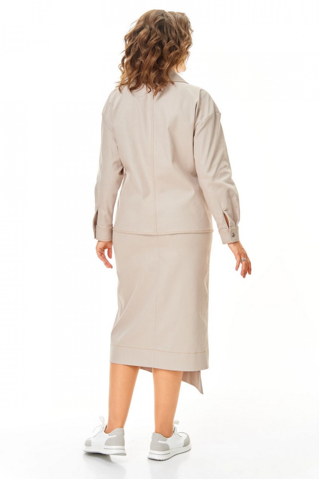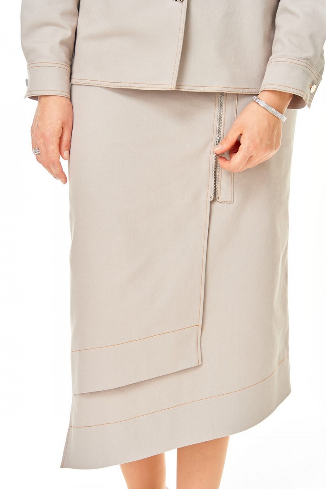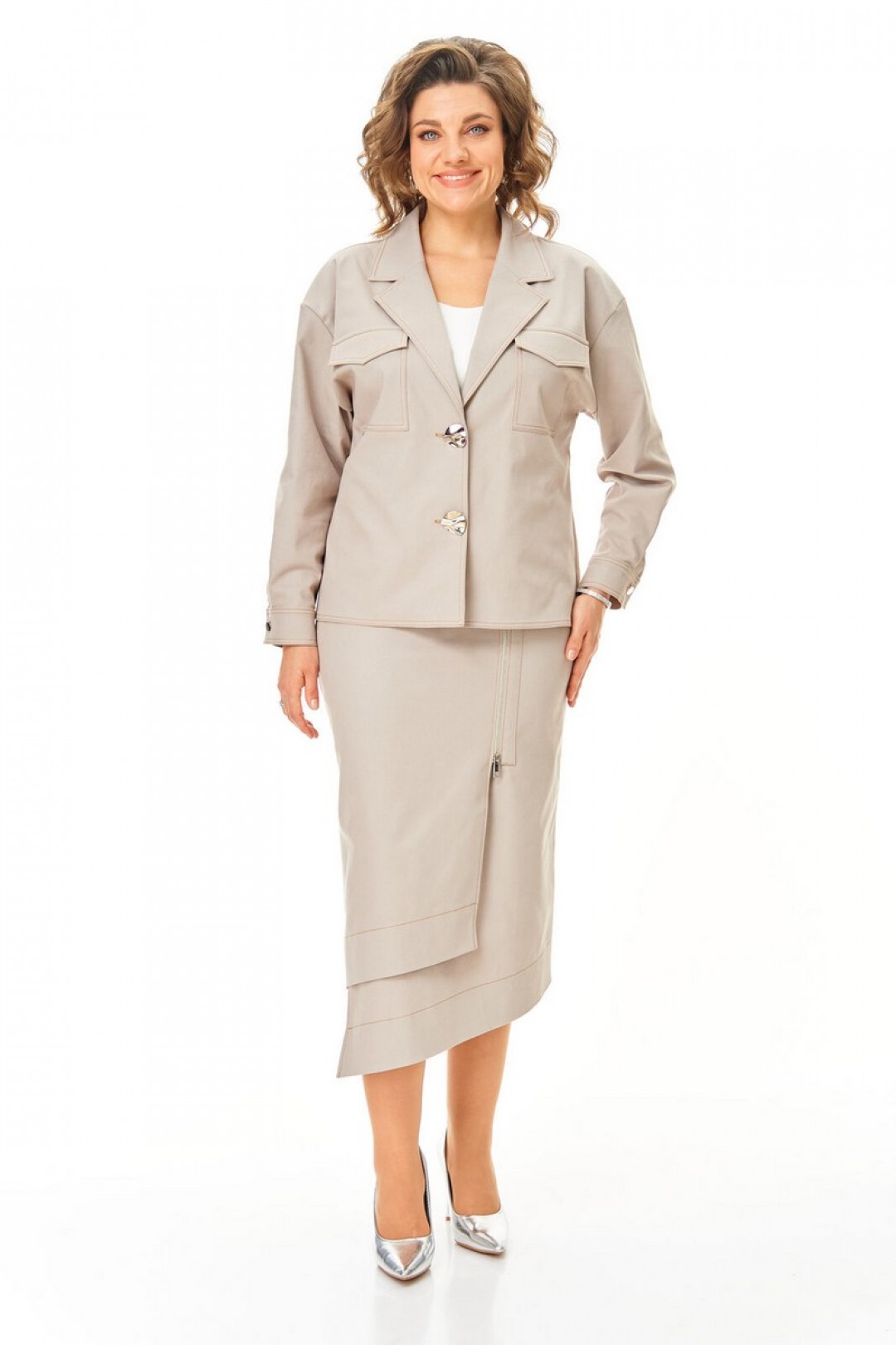 Костюм женский состоит из жакета и юбки. Жакет прямого свободного покроя со спущенной линией плеча.Застежка однобортная на авторские металлические пуговицы сложной формы.Воротник отложной пиджачного типа.Рукав длинный со складками и манжетой, застежка на петлю-пуговицу.По переду обработаны нагрудные карманы с клапаном.Спинка со средним швом.Юбка прямого силуэта, длина миди.В среднем шве заднего полотнища обработана застежка на потайную тесьму-молнию.Перед состоит из двух разноуровневых частей типа ""на запах"" с металлической молнией.Пояс притачной с резинкой в боковых швах.Отделочные строчки контрастного цвета.Вся фурнитура металлическая premium качества.