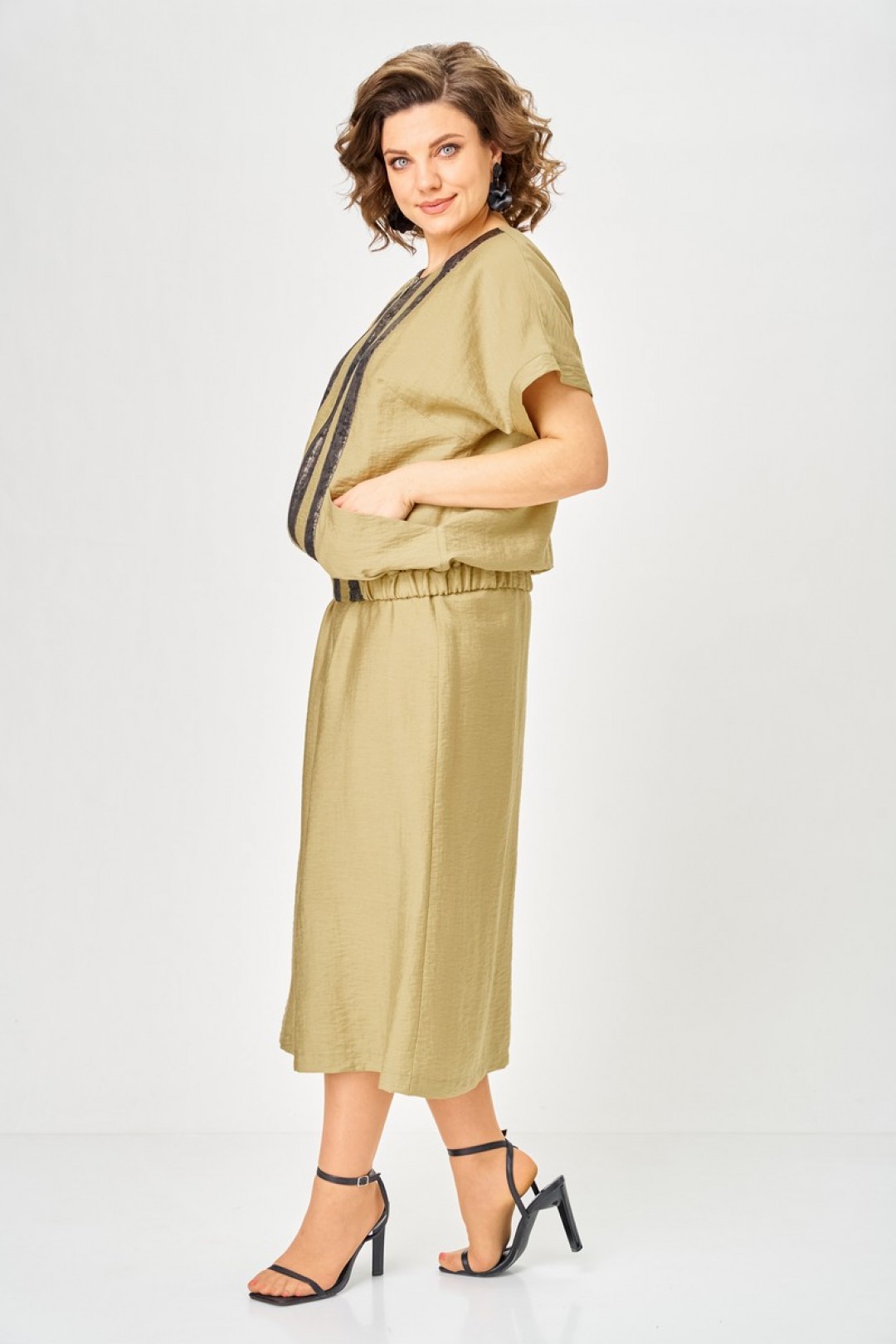 Костюм состоящий из жакета и юбки выполнен из однотонной ткани, в качестве отделки использована ткань с блеском.