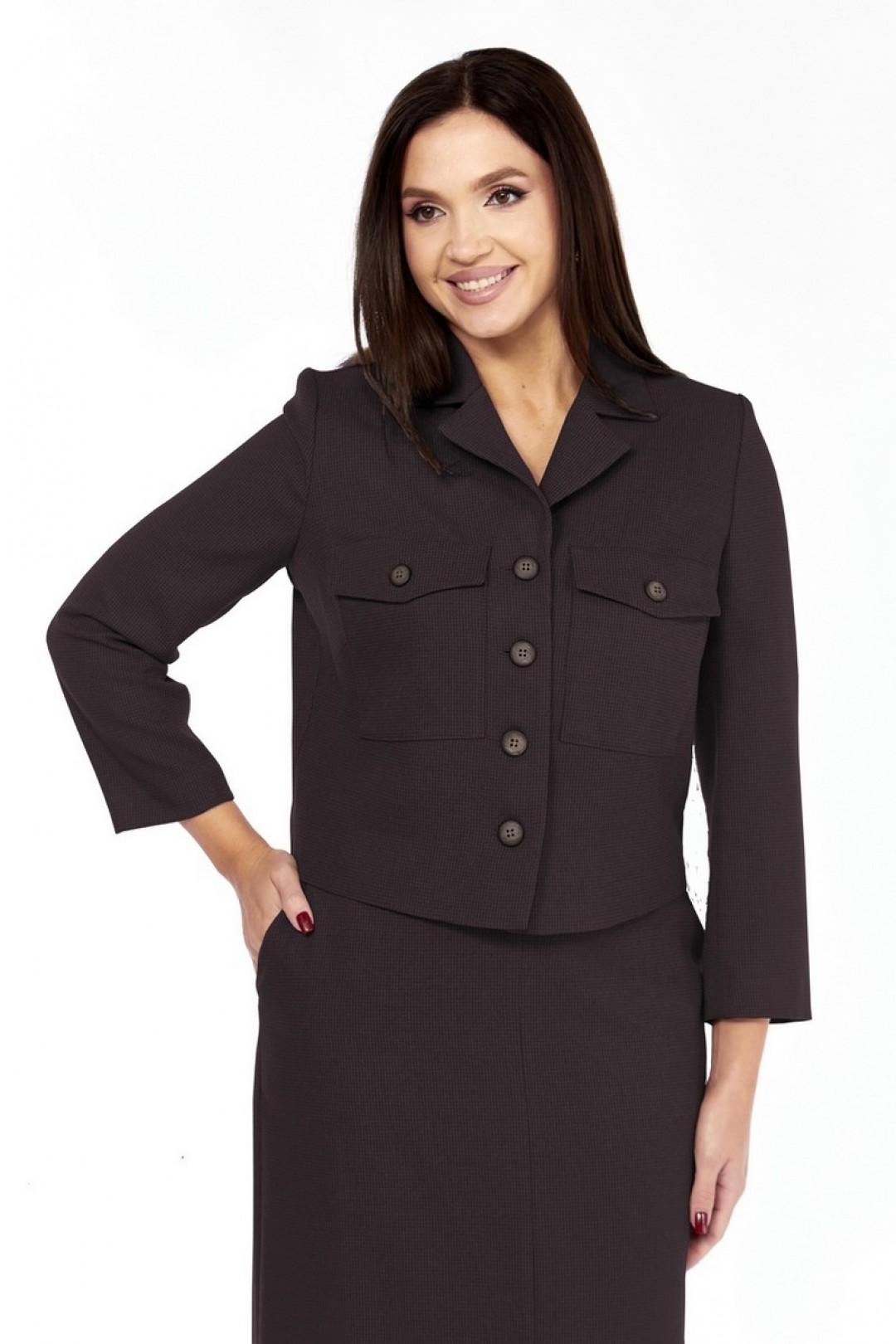 Жакет приталенного силуэта на подкладке спереди, со втачным рукавом длины ¾. Имеет отложной воротник с лацканами, по переду застежка на петли и пуговицы, на груди накладные карманы с клапанами, которые застегиваются на петлю и пуговицу.