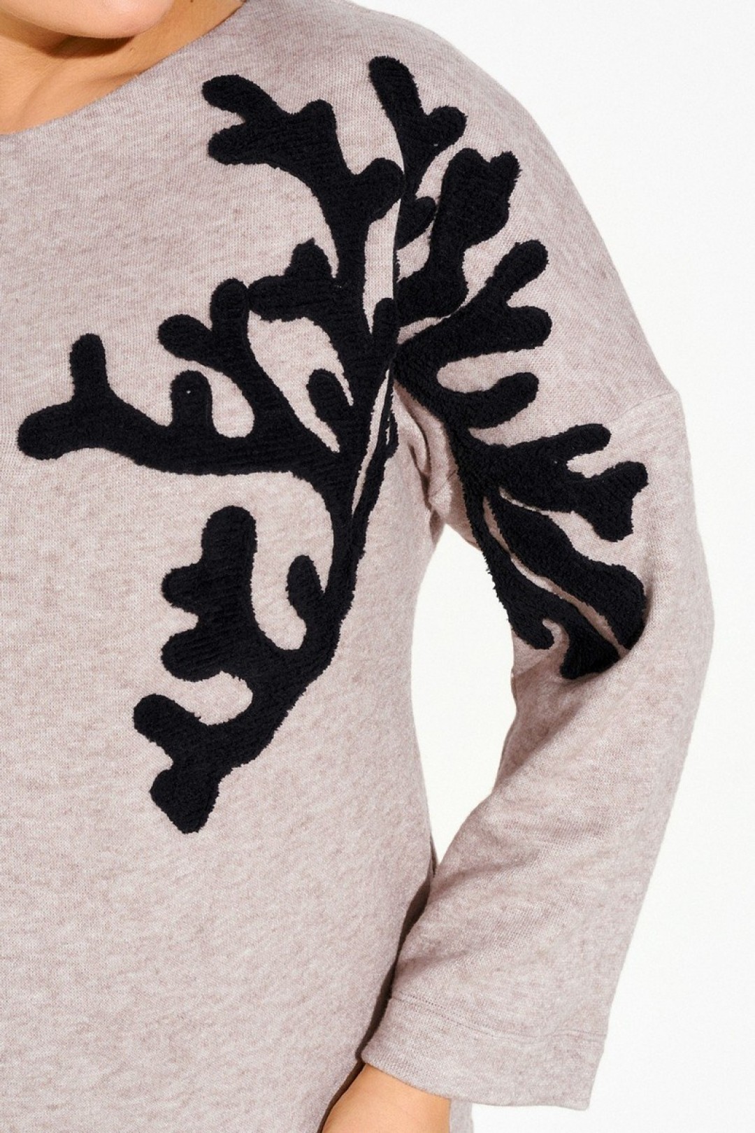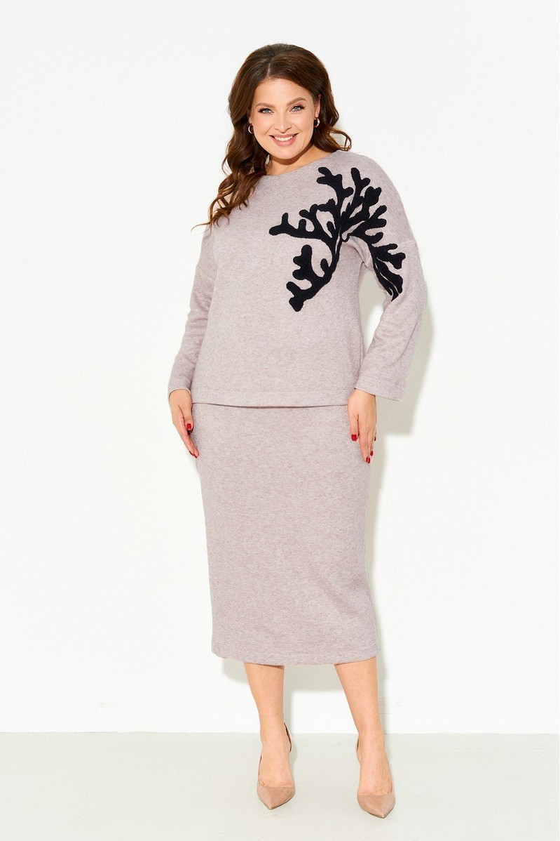 Джемпер полуприлегающего силуэта из мягкого трикотажного полотна с добавлением ангоры со втачными немного спущенными рукавами и округлым вырезом горловины. По переду дизайнерская вышивка. Юбка полуприлегающего силуэта, зауженная книзу, на эластичной подкладке с притачным поясом на резинке; по спинке шлица. Рекомендована бережная стирка при t 30; глажение при максимальной температуре прессующей поверхности утюга не более 110 С.