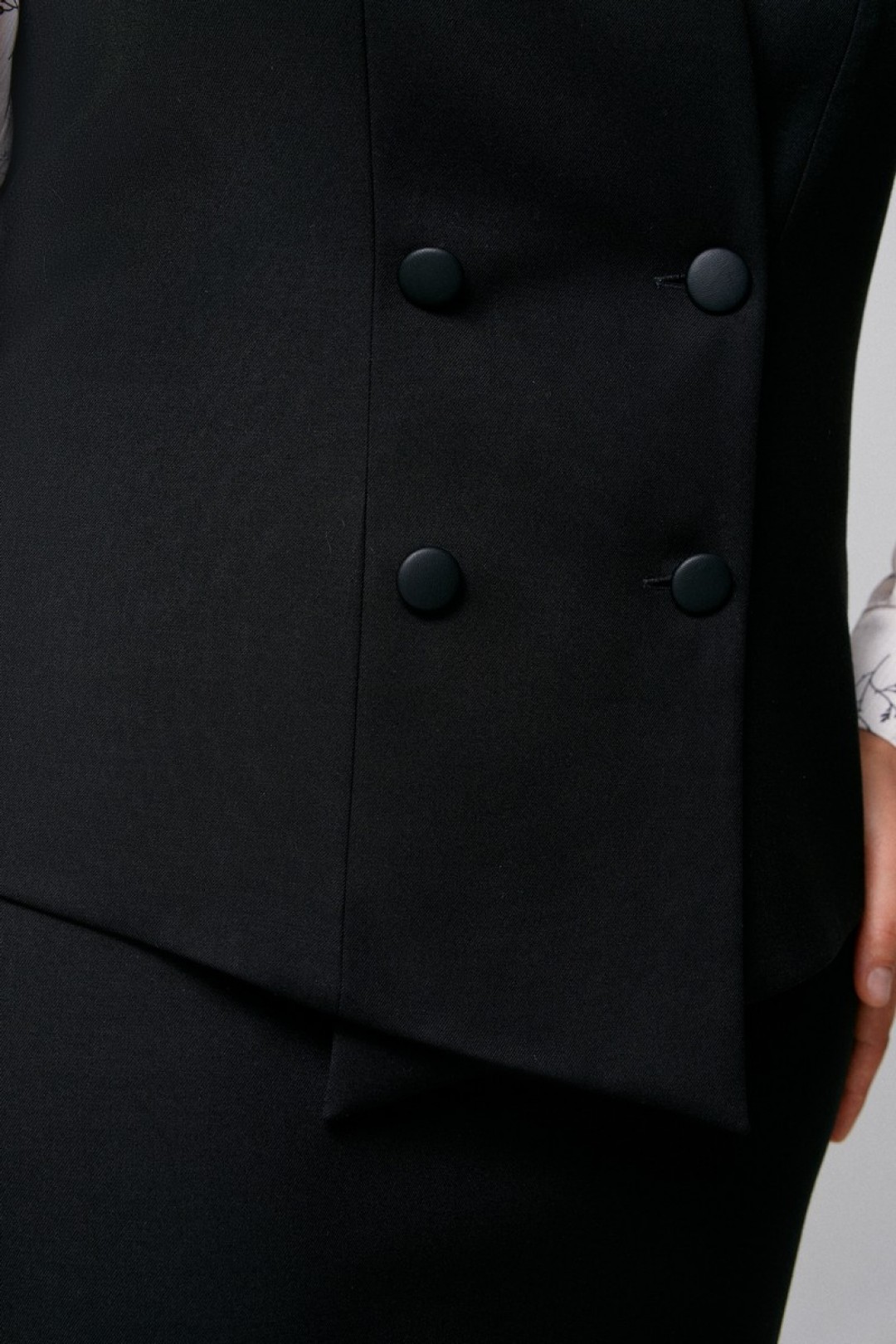 Жилет двубортный до середины бедра полуприлегающего силуэта на подкладке с горловиной V-образной формы и фигурным вырезом застегивается на петли и пуговицы. Юбка классическая "карандаш" на подкладке с завышенной линией талии на поясе-обтачке застегивается на тесьму-молнию и имеет сзади шлицу. Юбка и жилет выпорнены из высококачественной ткани с содержанием вискозы 70%.