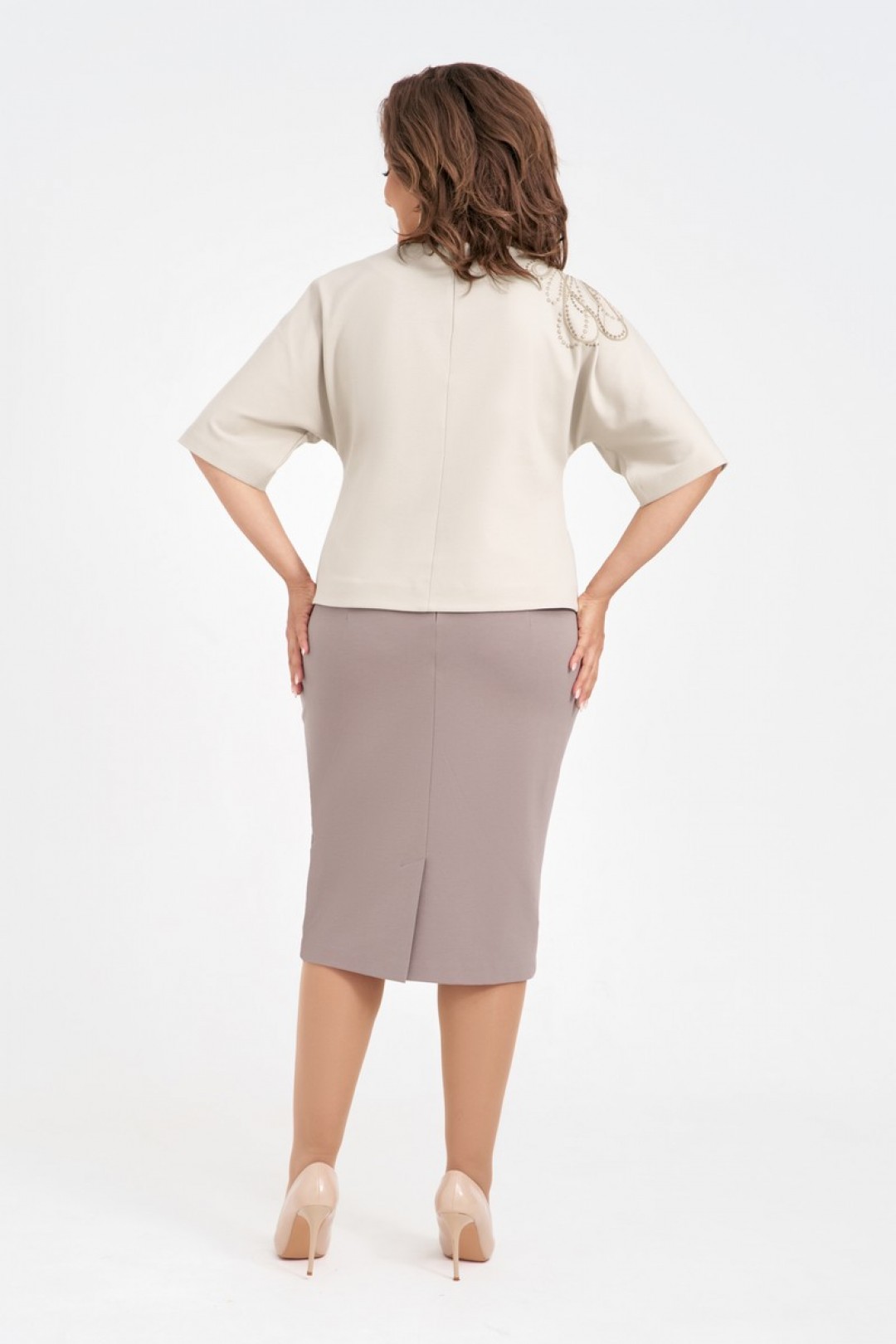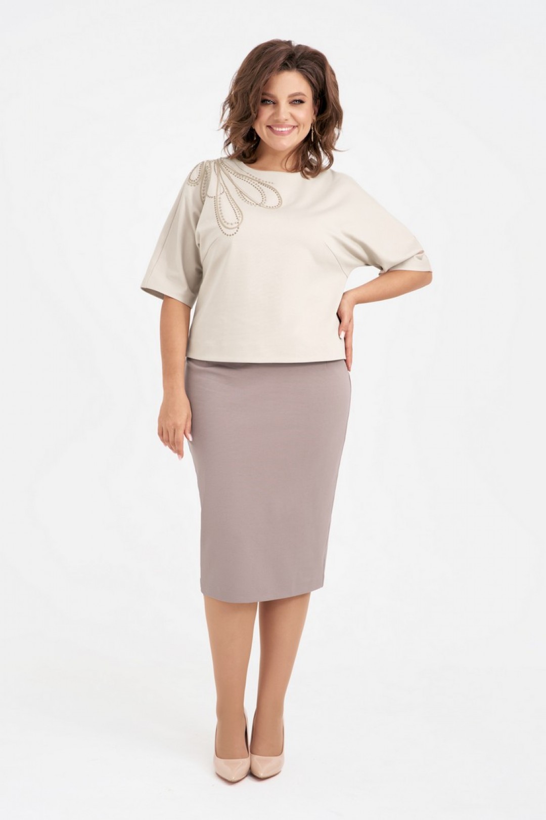 Женский костюм, состоящий из джемпера и юбки, выполнен из мягкого трикотажа, который держит форму.