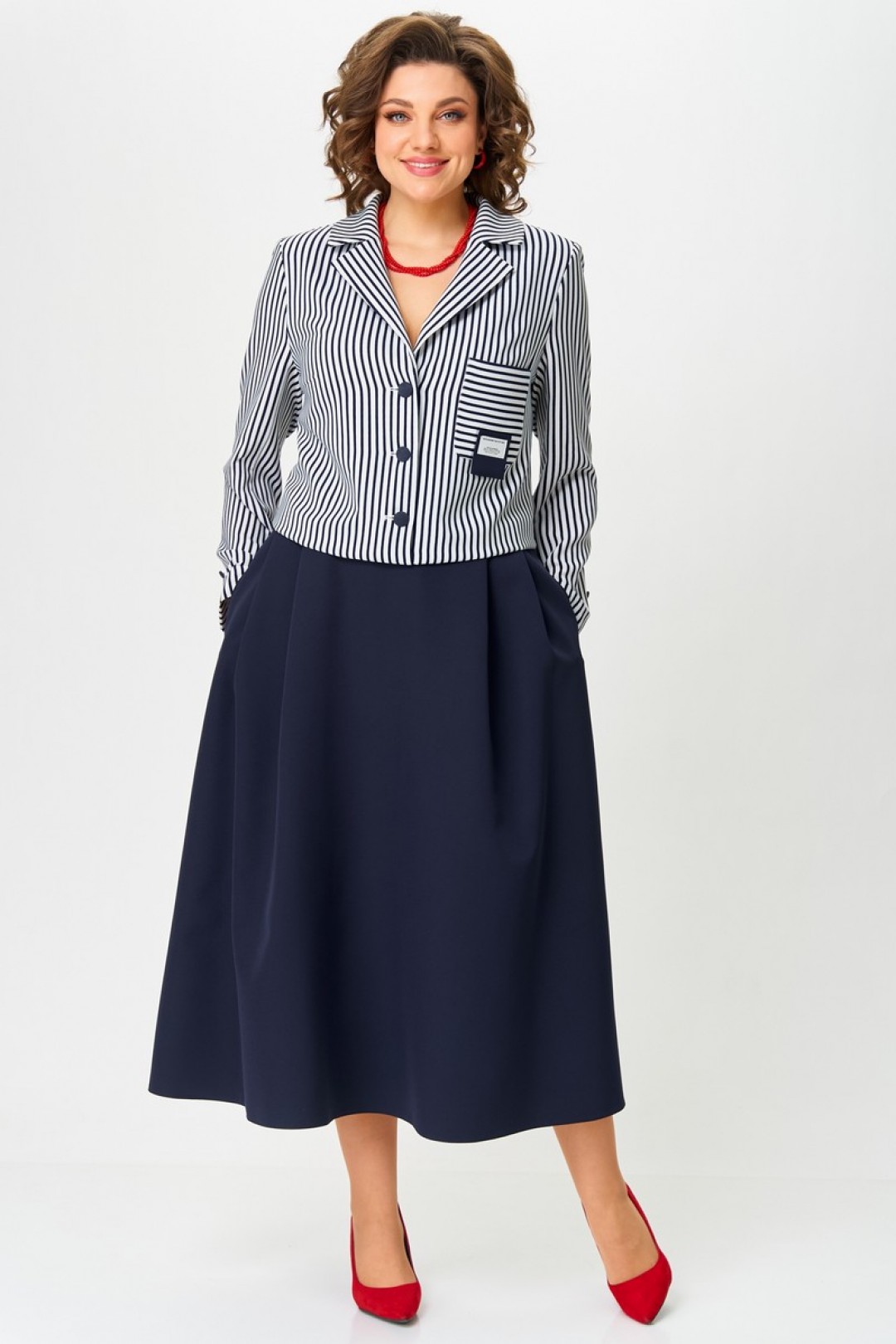 Элегантный женский жакет без подкладки с воротником пиджачного типа и застежкой на 3-и петли и пуговицы. По левой части переда накладной карман с декоративной нашивкой. Рукав втачной двухшовный со шлицей по низу и петлями с пуговицами. Юбка А-образного силуэта со складками по переду, в боковых швах карманы. Юбка на подкладке. Для максимально комфортной посадки по бокам пояса вставлена эластичная резинка.