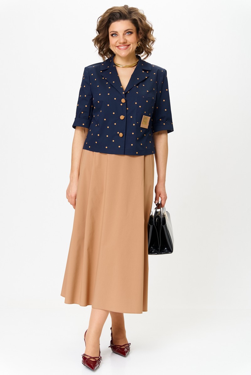 Комплект женский состоит из жакета и юбки. Элегантный женский жакет без подкладки с воротником пиджачного типа и застежкой на 3-и петли и пуговицы. По левой части переда накладной карман с декоративной нашивкой. Рукав втачной двухшовный с манжетой по низу. Юбка А-образного силуэта со складками по переду, в боковых швах карманы. Для максимально комфортной посадки по бокам пояса вставлена эластичная резинка.