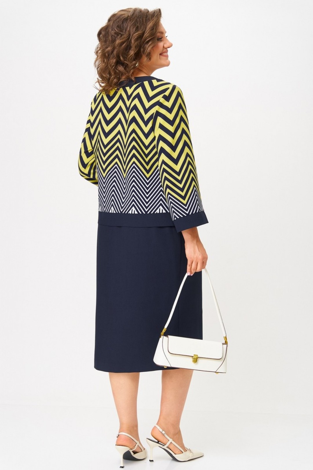 Стильный и гармоничный костюм состоит из блузки и юбки. Геометрический принт блузки притягивать к себе взгляд. Блузка прямого силуэта с нагрудными вытачками и декоративной отделкой по горловине, низу изделия и низу рукава. Рукав втачной одношовный. Спинка без особенностей. Юбка прямого силуэта со шлицей спереди по левой части. Пояс притачной с эластичной тесьмой по спинке, что обеспечивает максимально комфортную посадку на любой тип фигуры.
