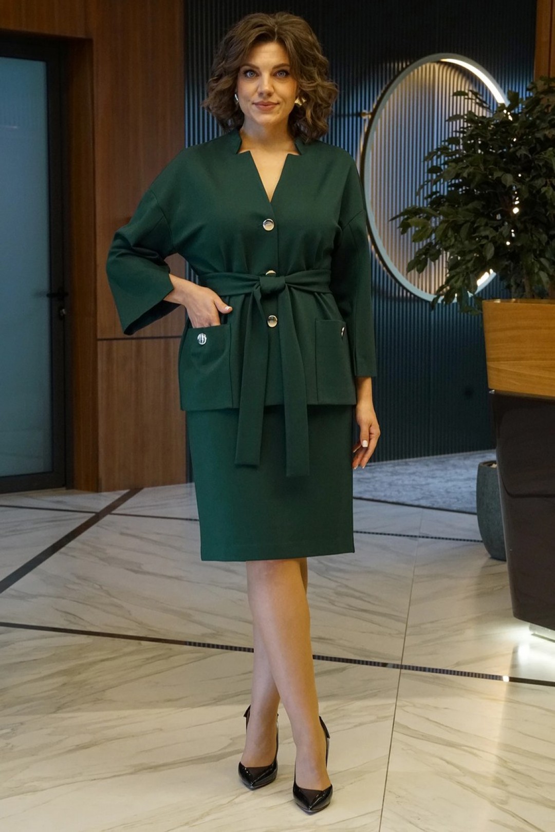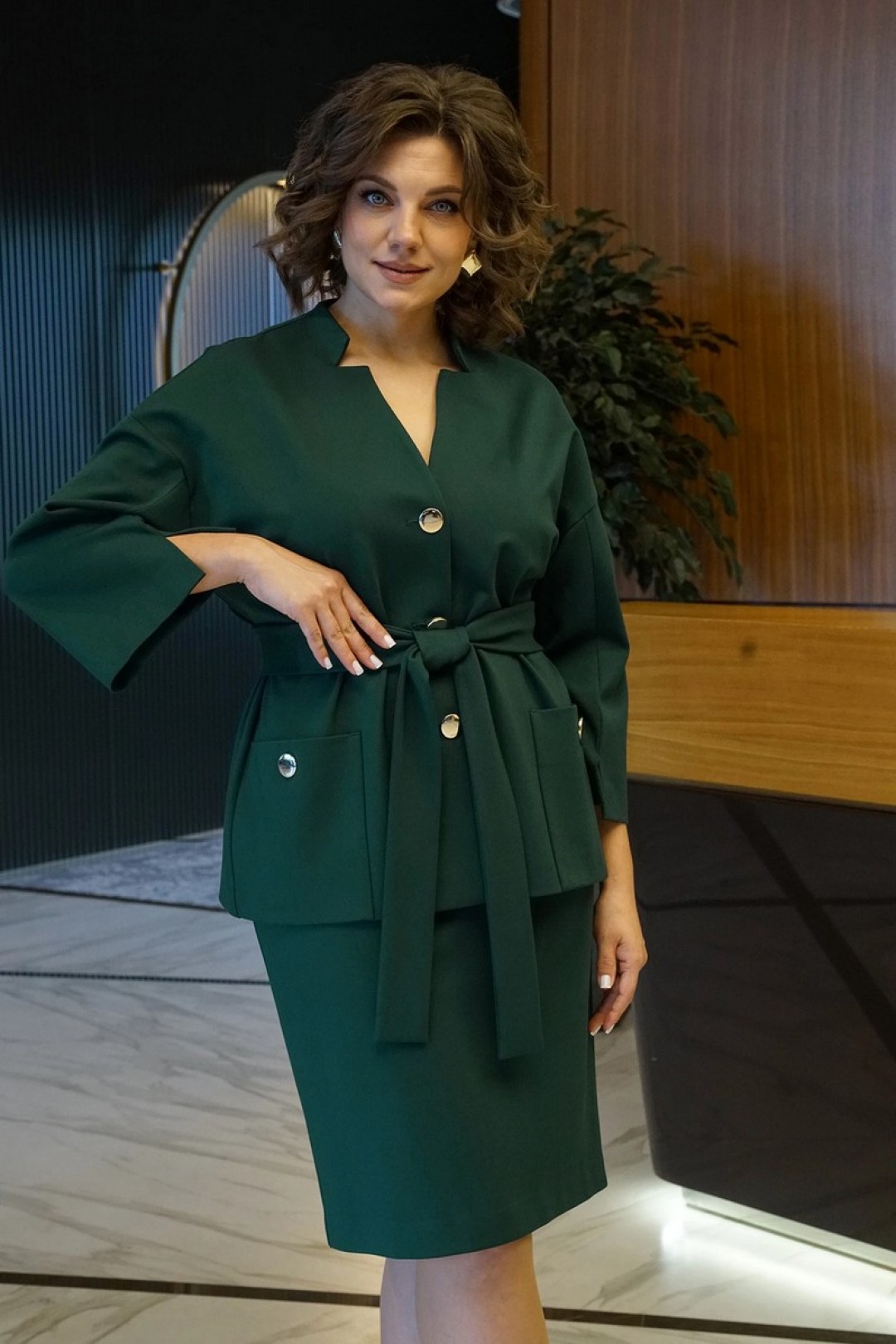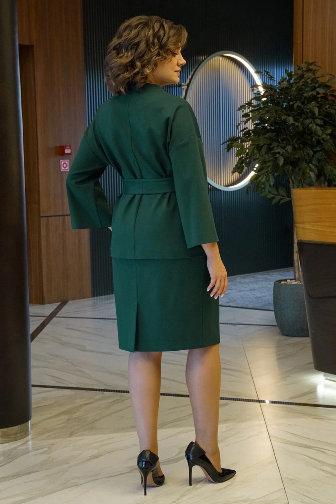 Жакет прямого силуэта, без подкладки, со спущенной линией плеча, с цельнокроеной стойкой, с поясом, с застёжкой на петли, пуговицы. Перед с накладными карманами пристёгивающиеся на петлю, пуговицу. Спинка со средним швом. Рукава втачные, длиной ¾, понизу переднего шва разрез.