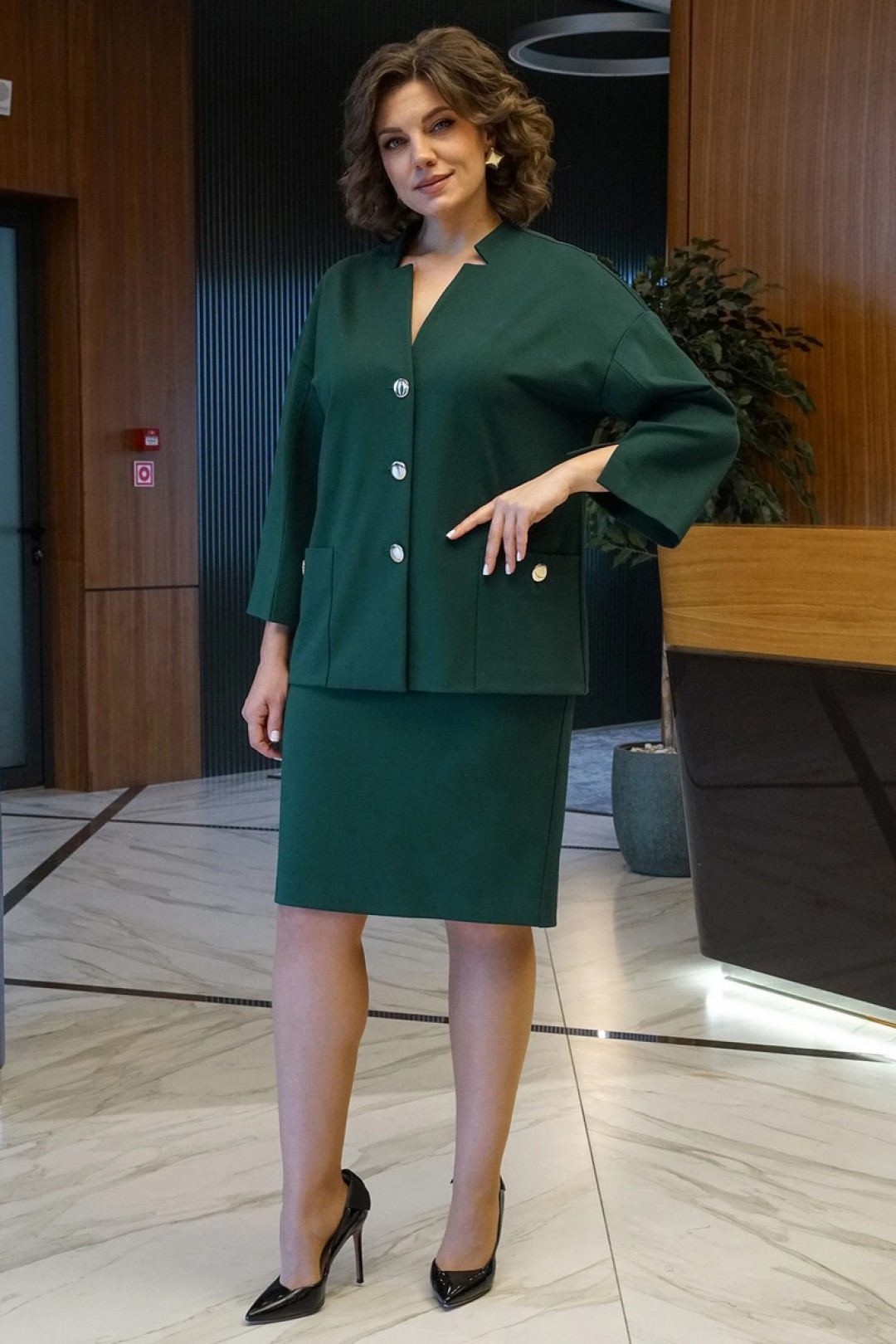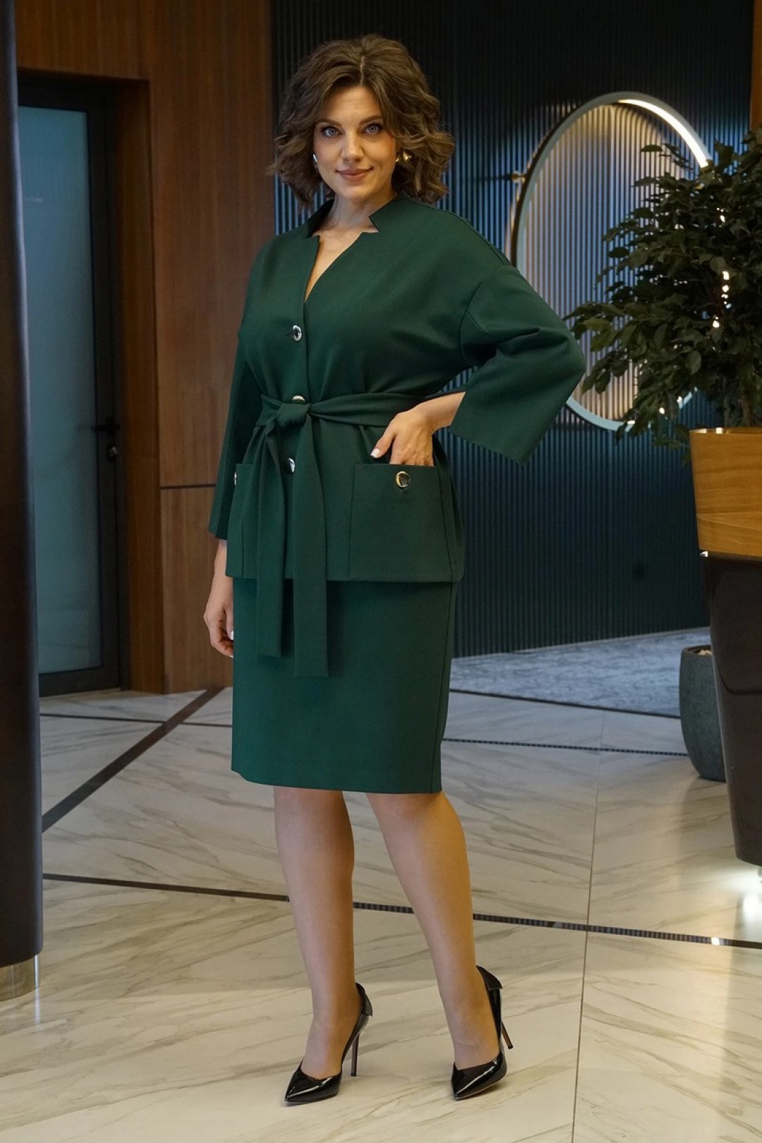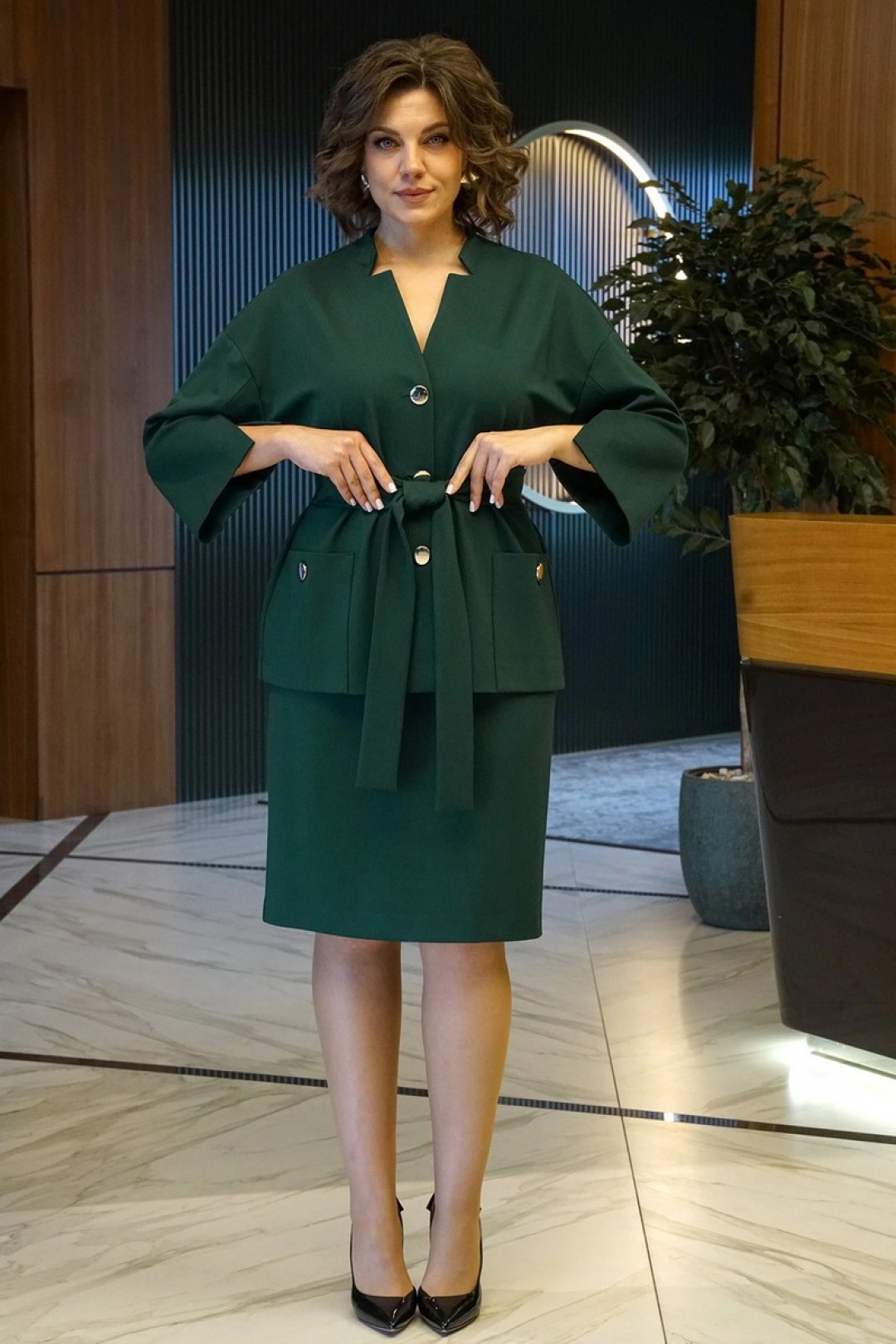 Жакет прямого силуэта, без подкладки, со спущенной линией плеча, с цельнокроеной стойкой, с поясом, с застёжкой на петли, пуговицы. Перед с накладными карманами пристёгивающиеся на петлю, пуговицу. Спинка со средним швом. Рукава втачные, длиной ¾, понизу переднего шва разрез.