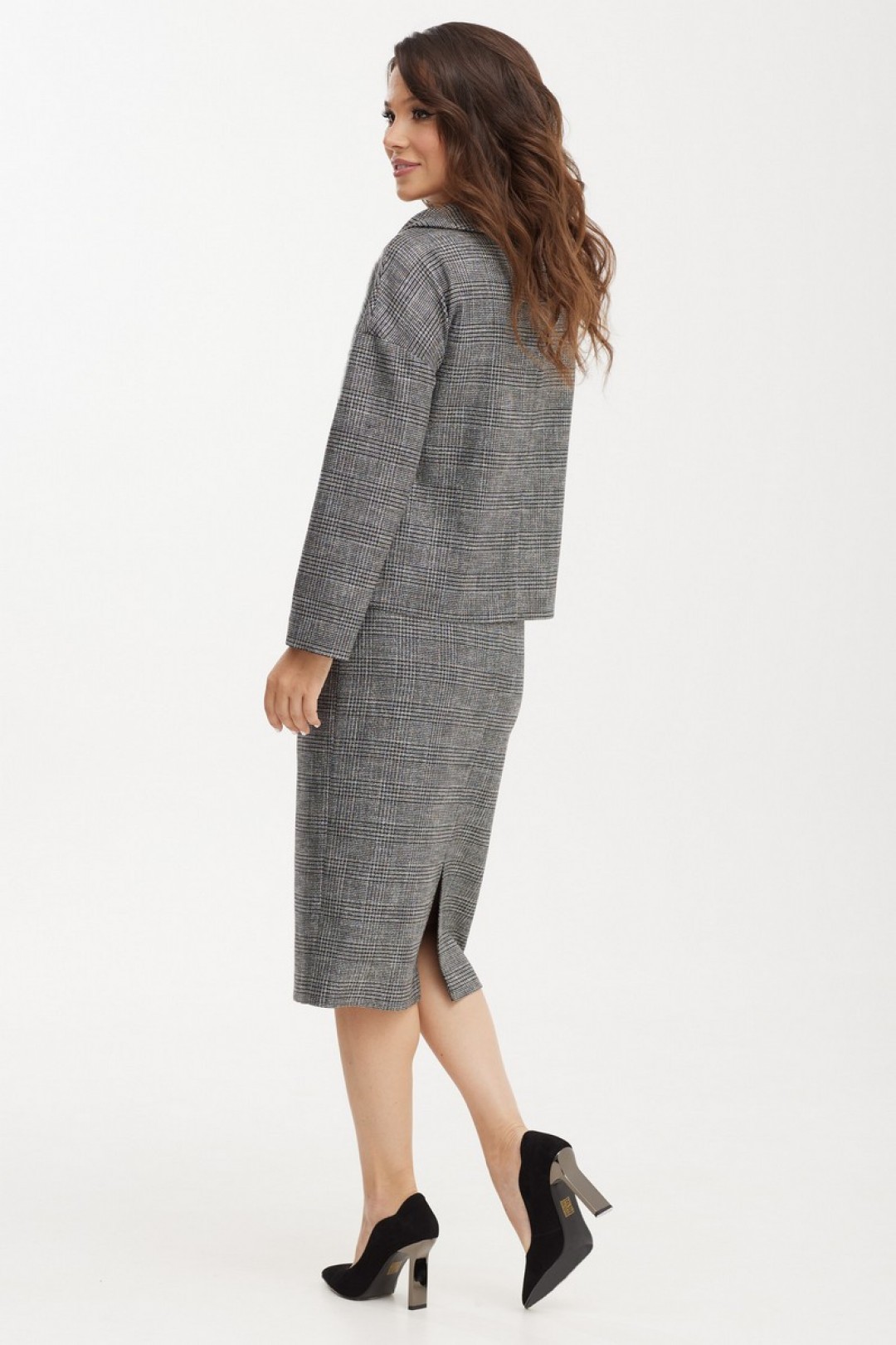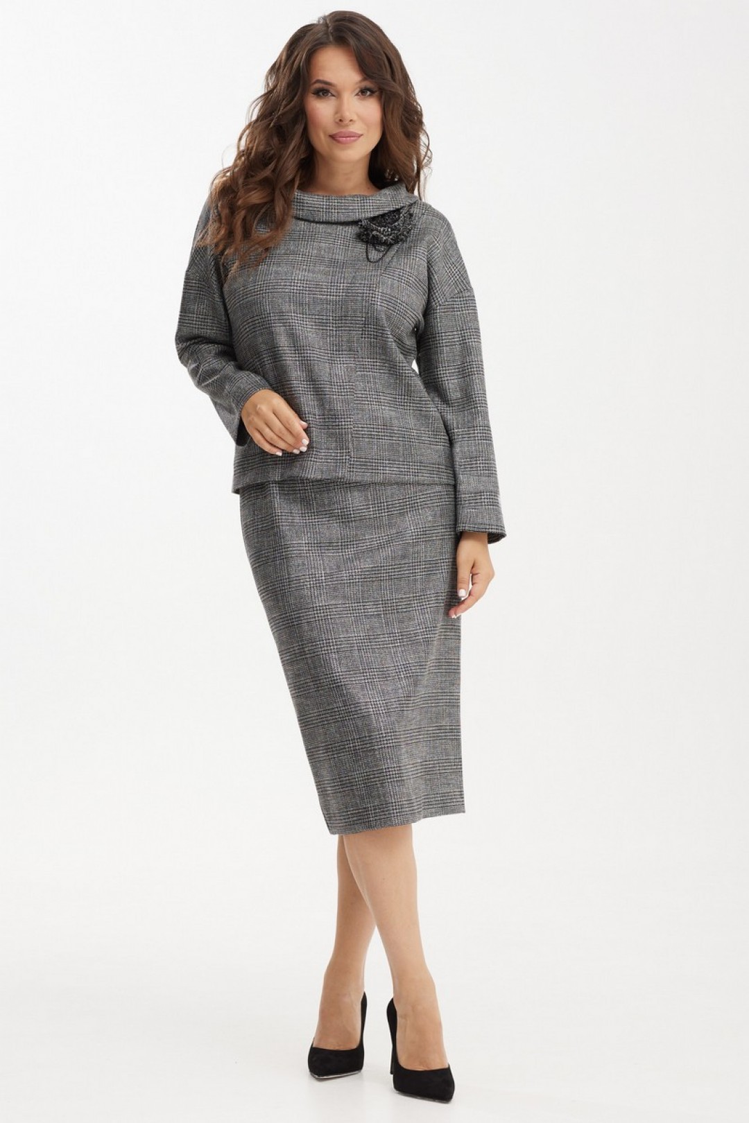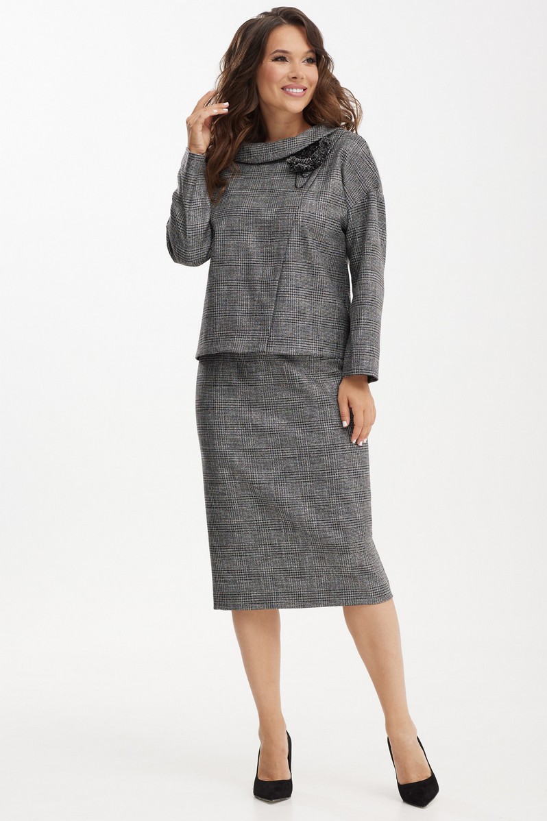 Элегантный комплект, состоящий из блузы и юбки, выполненных из мягкой костюмной ткани. Блуза полуприталенного силуэта со спущенным рукавом и отложным воротником. По спинке в средний шов вставлена молния. Юбка классического кроя, заднее полотнище со средним швом, застегивается на потайную молнию. Шов переходит к низу в шлицу.